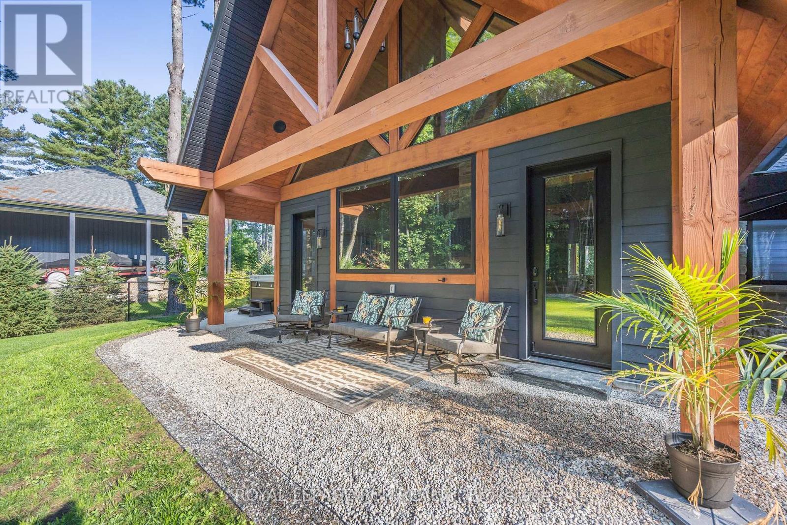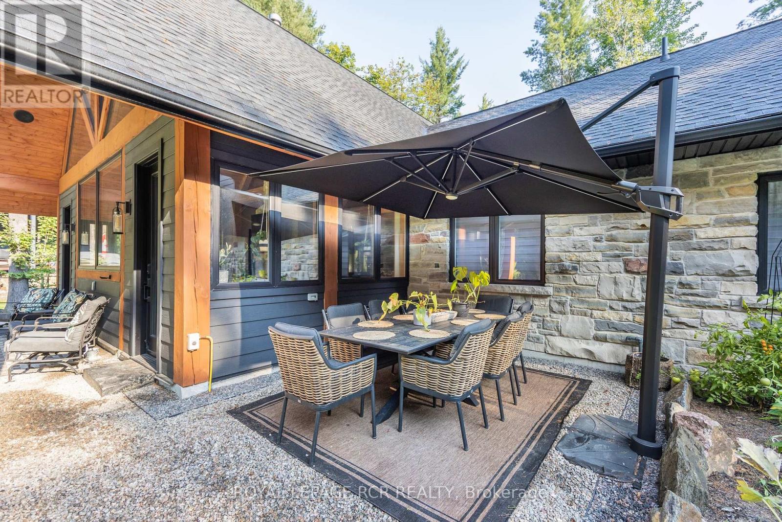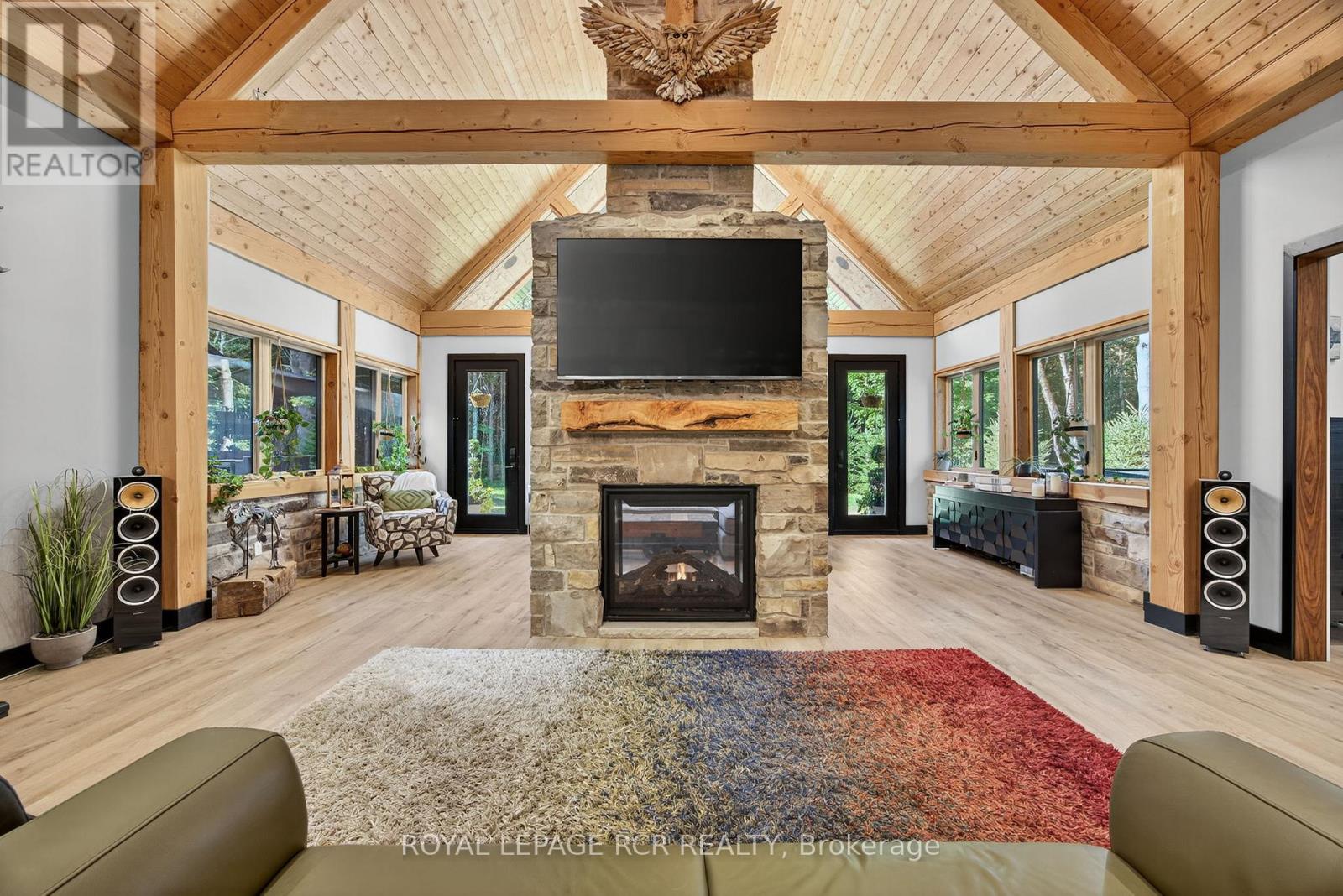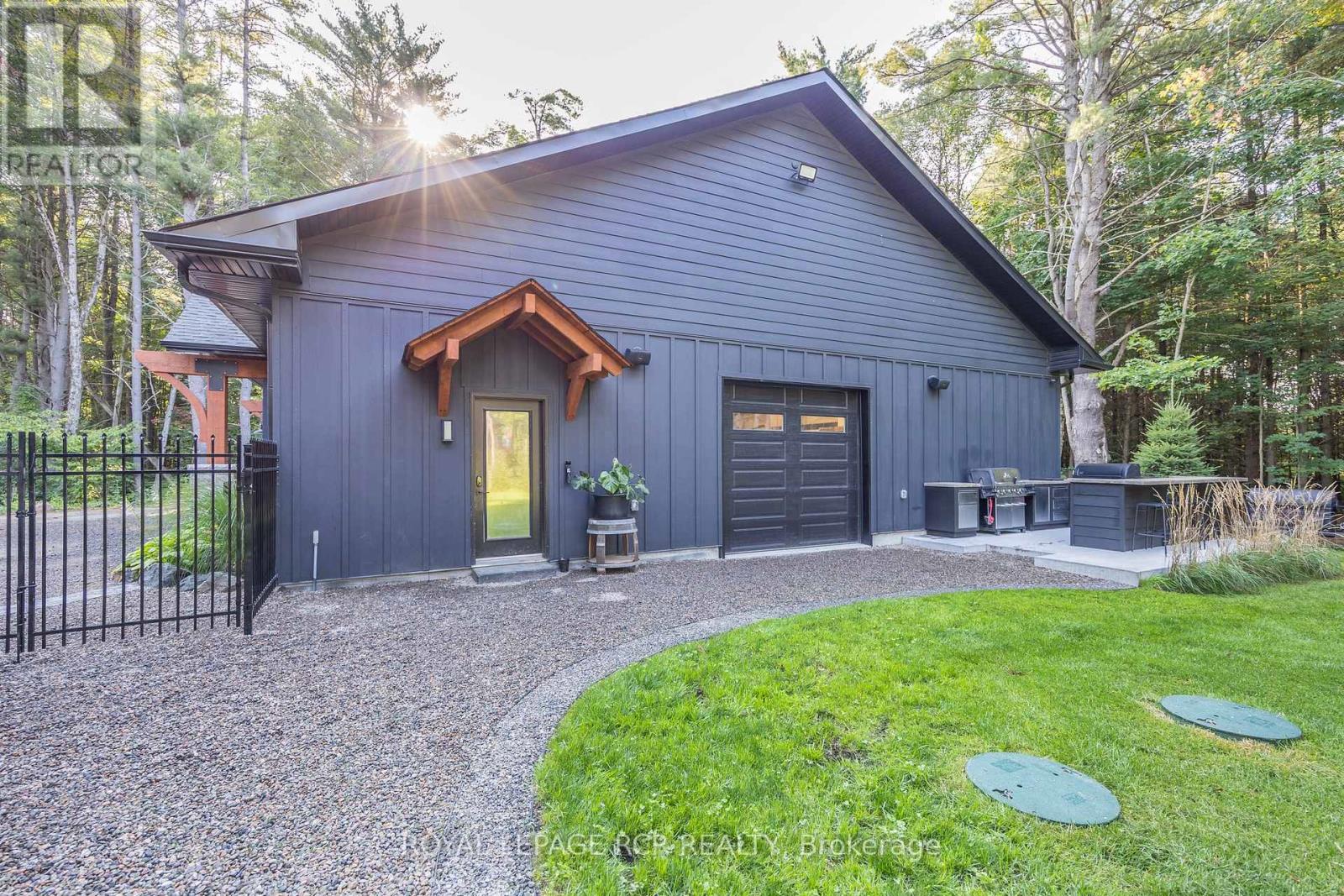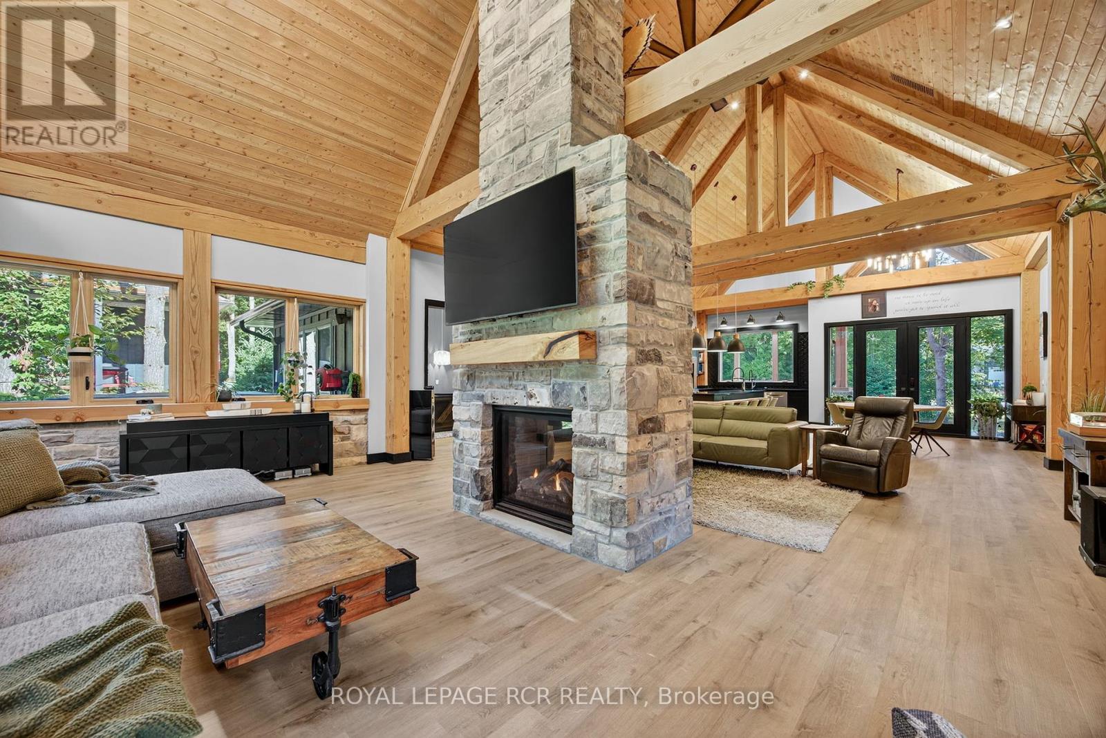 Welcome to this stunning 2022 custom-built post & beam home nestled on over an acre of privacy at the end of a quiet cul-de-sac surrounded by green space. Every inch of this home is fully customized-nothing builder grade- with design and craftsmanship that set it apart. Step inside the spectacular 24' vaulted great room where soaring beams, a floor-to-ceiling double-sided stone fireplace, and radiant heated floors set the tone for comfort and style. The chef's kitchen is a true showpiece with solid walnut accents, a Fulgor Milano 48" propane range with double ovens, built-in coffee maker, wine fridge, and oversized fridge/freezer-perfect for entertaining. The primary bedroom offers 14' ceilings, a walk-in closet with library ladder, custom storage, a spa-inspired ensuite with rain shower and body jets, and a private fireplace. With 3 bedrooms, plus a loft and the option for a separate in-law suite, this home is ideal for families or hosting guests. Smart Home technology elevates daily living with voice-activated control of lighting, blinds, fireplace, security, HVAC, and media throughout. Outside, enjoy a fenced backyard with gardens, a firepit, a Hydropool hot tub, and a full outdoor kitchen and bar-your private Muskoka resort. The property also boasts and incredible 50' x 50' detached workshop/garage, fully insulated with radiant in-floor heating, HVAC, water, washroom, compressed air lines, and oversized doors-perfect for hobbies, storage, or business needs. From spray foam insulation and 50-year shingles to custom walnut doors and chandeliers, this home blends efficiency, luxury, and craftsmanship at every turn. 10 minute drive to Gravenhurst, 18 minute drive to Bracebridge, 23 minute drive to Orillia. You will never see a house like this one with every inch of this home upgraded. Your Muskoka dream home awaits. (id:56991)