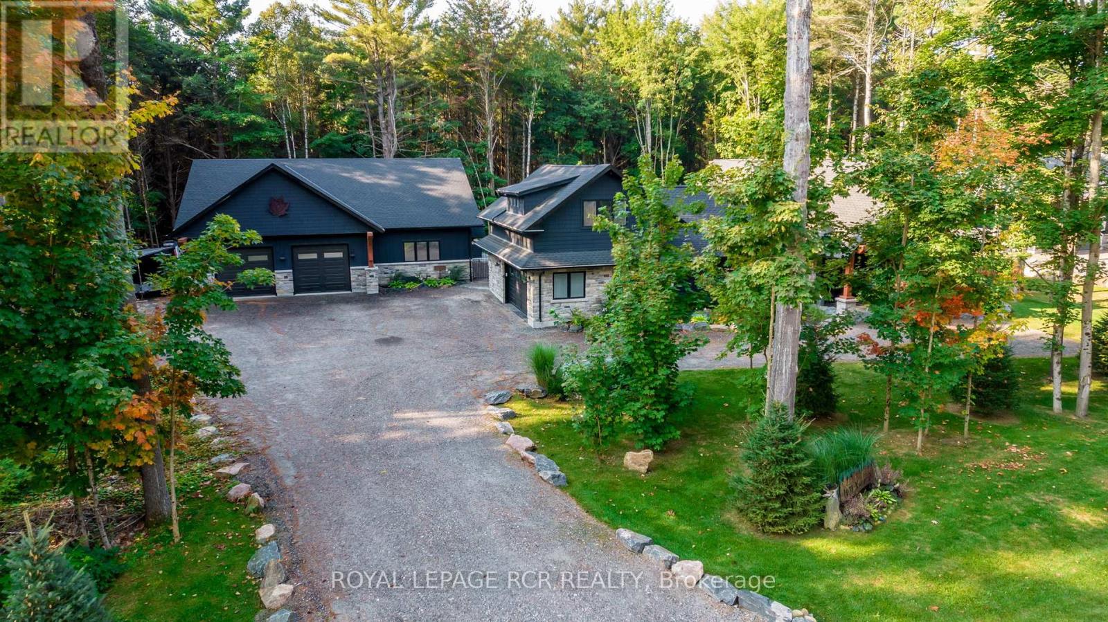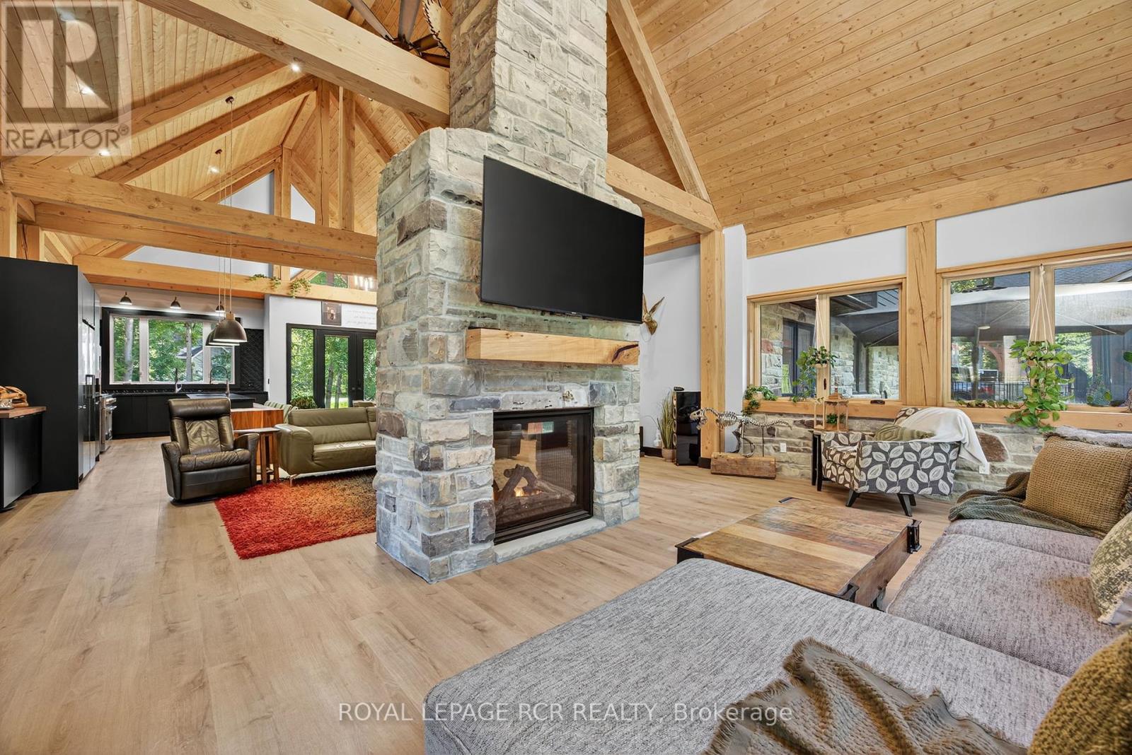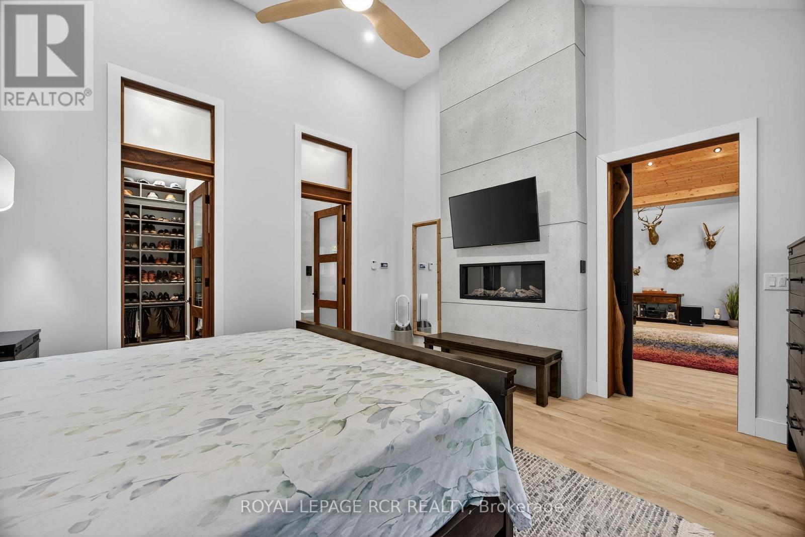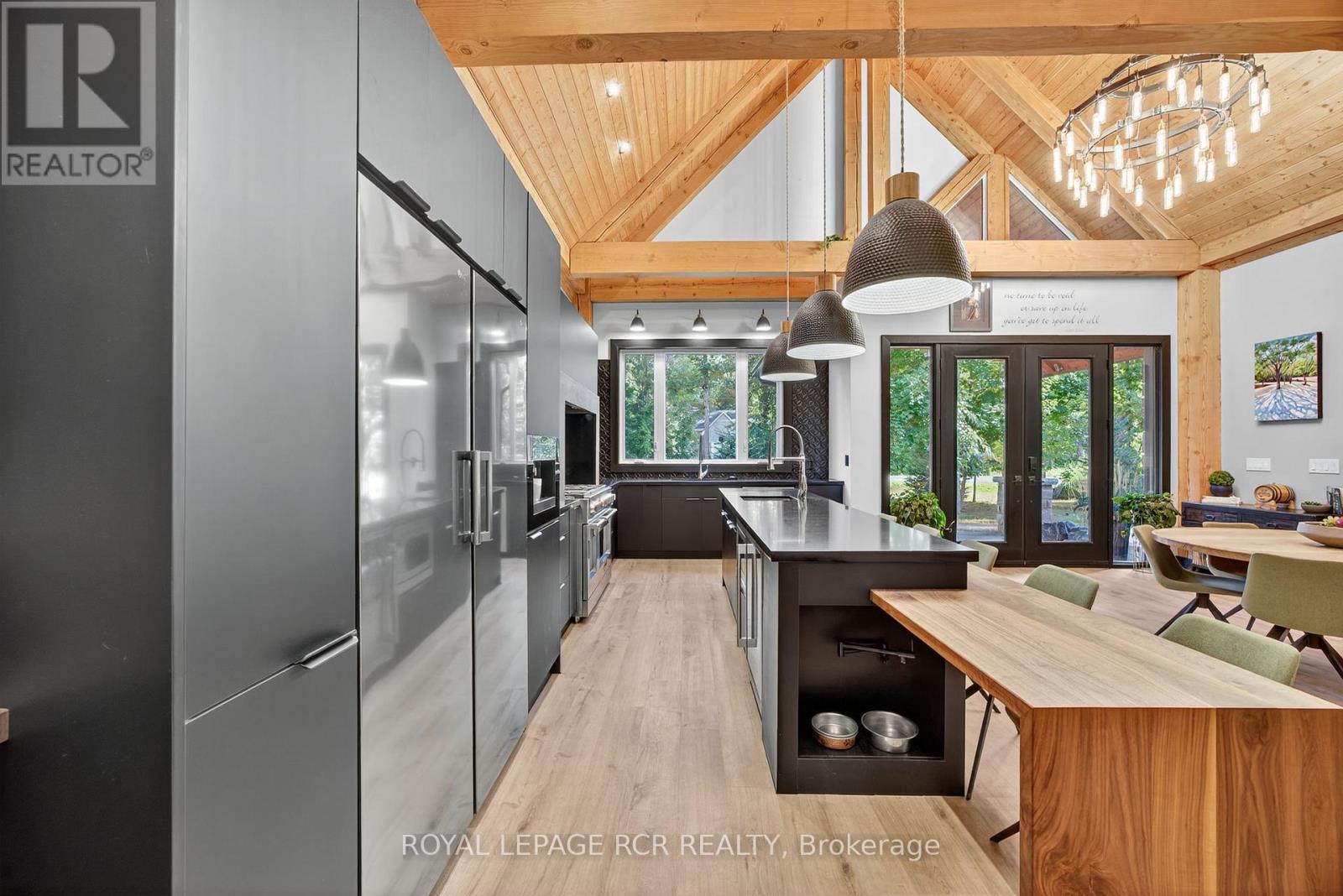 Welcome to this stunning 2022 custom-built post & beam home nestled on over an acre of privacy at the end of a quiet cul-de-sac surrounded by green space. Every inch of this home is fully customized-nothing builder grade- with design and craftsmanship that set it apart. Step inside the spectacular 24' vaulted great room where soaring beams, a floor-to-ceiling double-sided stone fireplace, and radiant heated floors set the tone for comfort and style. The chef's kitchen is a true showpiece with solid walnut accents, a Fulgor Milano 48" propane range with double ovens, built-in coffee maker, wine fridge, and oversized fridge/freezer-perfect for entertaining. The primary bedroom offers 14' ceilings, a walk-in closet with library ladder, custom storage, a spa-inspired ensuite with rain shower and body jets, and a private fireplace. With 3 bedrooms, plus a loft and the option for a separate in-law suite, this home is ideal for families or hosting guests. Smart Home technology elevates daily living with voice-activated control of lighting, blinds, fireplace, security, HVAC, and media throughout. Outside, enjoy a fenced backyard with gardens, a firepit, a Hydropool hot tub, and a full outdoor kitchen and bar-your private Muskoka resort. The property also boasts and incredible 50' x 50' detached workshop/garage, fully insulated with radiant in-floor heating, HVAC, water, washroom, compressed air lines, and oversized doors-perfect for hobbies, storage, or business needs. From spray foam insulation and 50-year shingles to custom walnut doors and chandeliers, this home blends efficiency, luxury, and craftsmanship at every turn. 10 minute drive to Gravenhurst, 18 minute drive to Bracebridge, 23 minute drive to Orillia. You will never see a house like this one with every inch of this home upgraded. Your Muskoka dream home awaits. (id:56991)