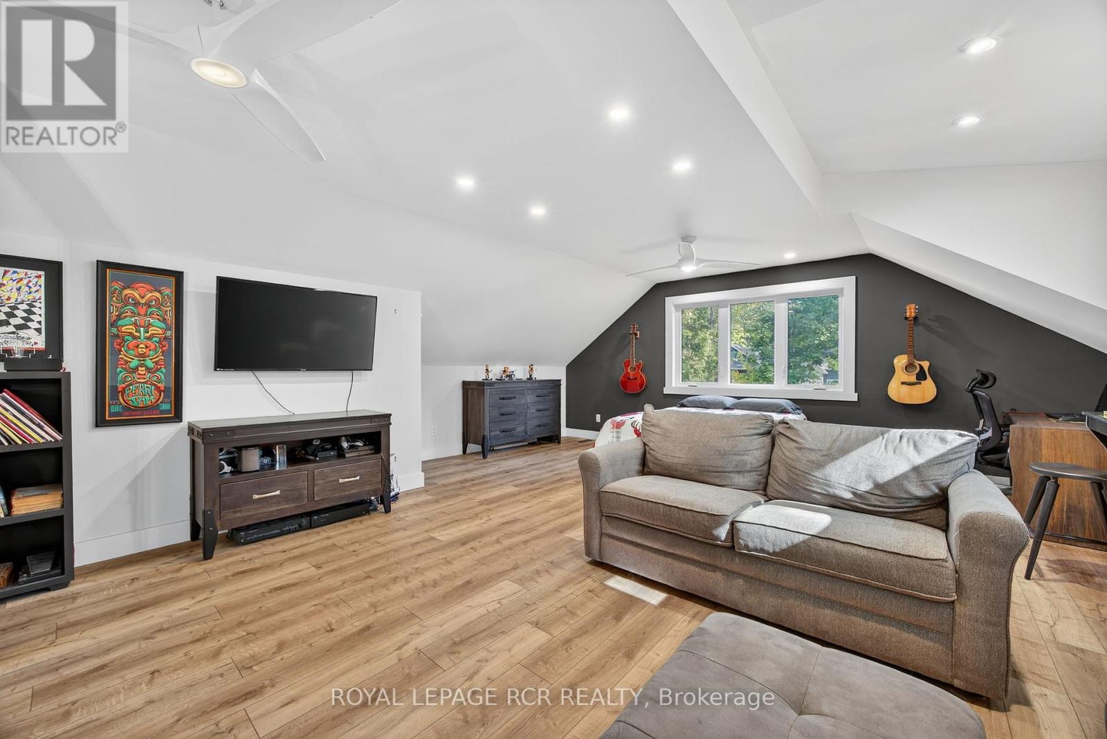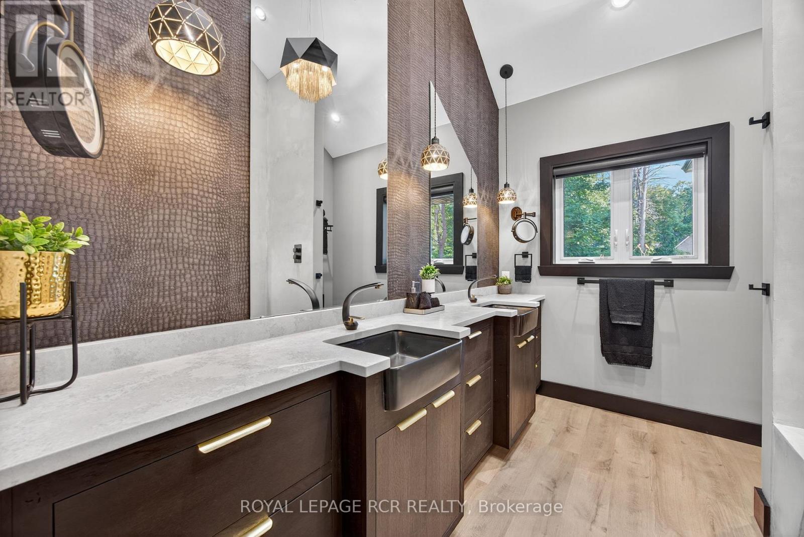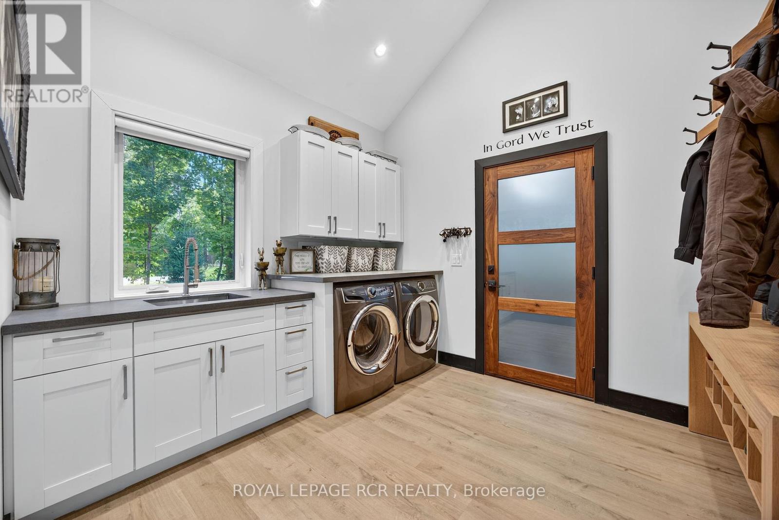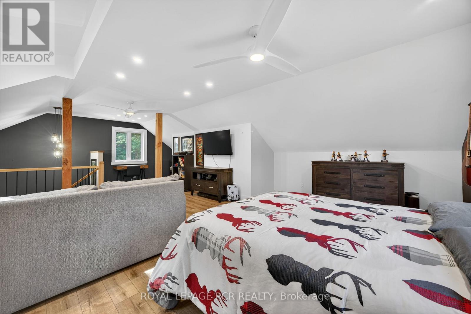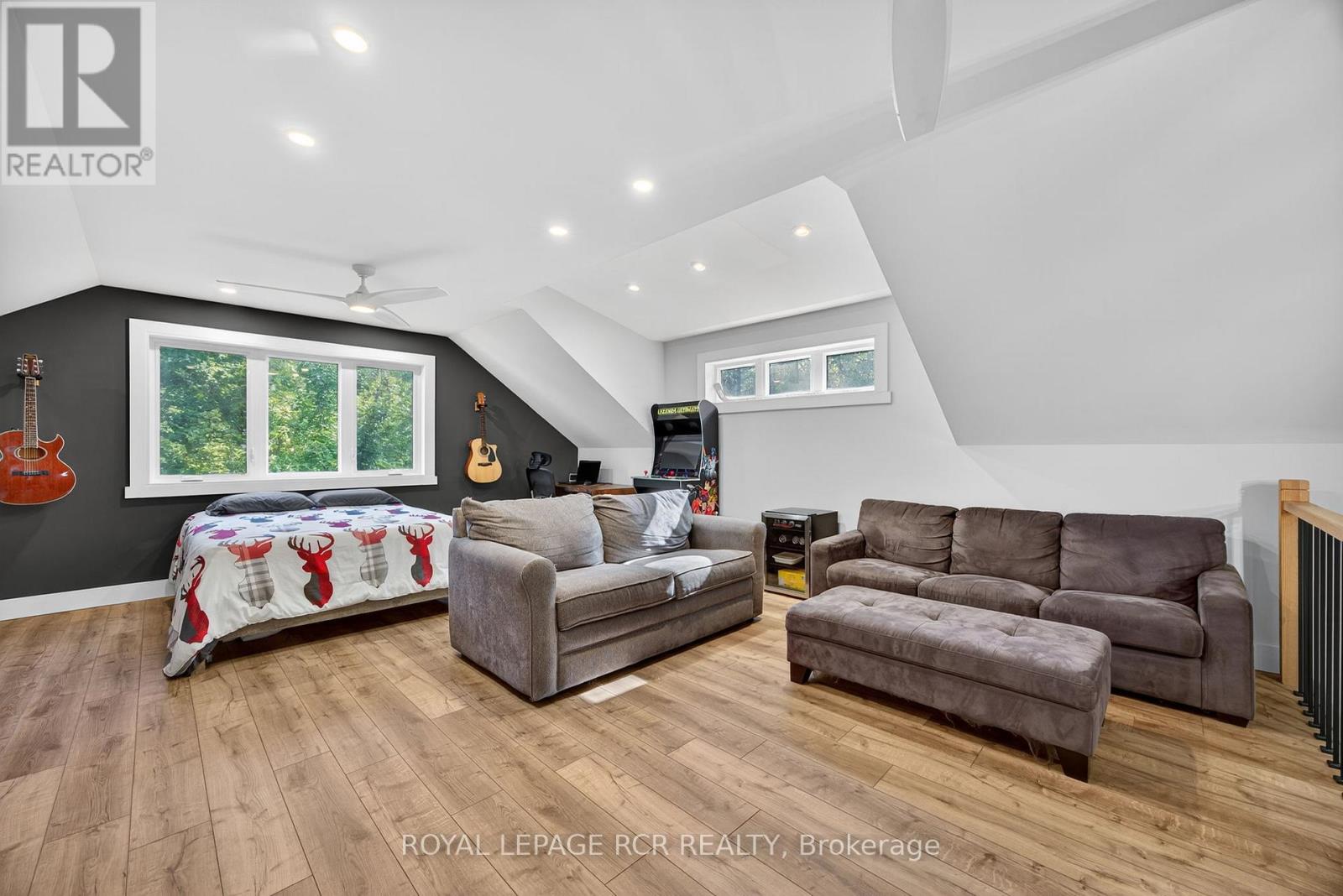 Welcome to this stunning 2022 custom-built post & beam home nestled on over an acre of privacy at the end of a quiet cul-de-sac surrounded by green space. Every inch of this home is fully customized-nothing builder grade- with design and craftsmanship that set it apart. Step inside the spectacular 24' vaulted great room where soaring beams, a floor-to-ceiling double-sided stone fireplace, and radiant heated floors set the tone for comfort and style. The chef's kitchen is a true showpiece with solid walnut accents, a Fulgor Milano 48" propane range with double ovens, built-in coffee maker, wine fridge, and oversized fridge/freezer-perfect for entertaining. The primary bedroom offers 14' ceilings, a walk-in closet with library ladder, custom storage, a spa-inspired ensuite with rain shower and body jets, and a private fireplace. With 3 bedrooms, plus a loft and the option for a separate in-law suite, this home is ideal for families or hosting guests. Smart Home technology elevates daily living with voice-activated control of lighting, blinds, fireplace, security, HVAC, and media throughout. Outside, enjoy a fenced backyard with gardens, a firepit, a Hydropool hot tub, and a full outdoor kitchen and bar-your private Muskoka resort. The property also boasts and incredible 50' x 50' detached workshop/garage, fully insulated with radiant in-floor heating, HVAC, water, washroom, compressed air lines, and oversized doors-perfect for hobbies, storage, or business needs. From spray foam insulation and 50-year shingles to custom walnut doors and chandeliers, this home blends efficiency, luxury, and craftsmanship at every turn. 10 minute drive to Gravenhurst, 18 minute drive to Bracebridge, 23 minute drive to Orillia. You will never see a house like this one with every inch of this home upgraded. Your Muskoka dream home awaits. (id:56991)