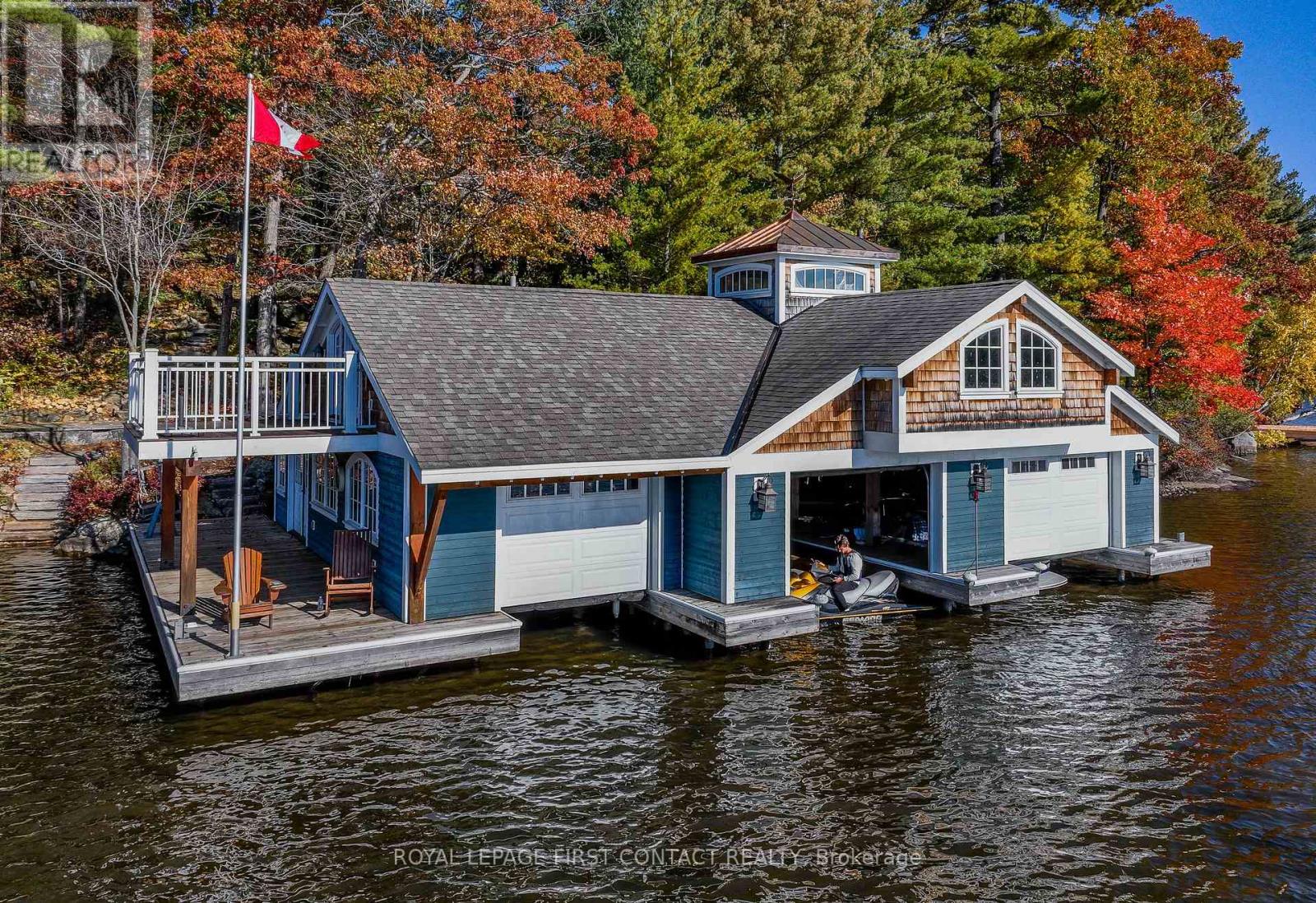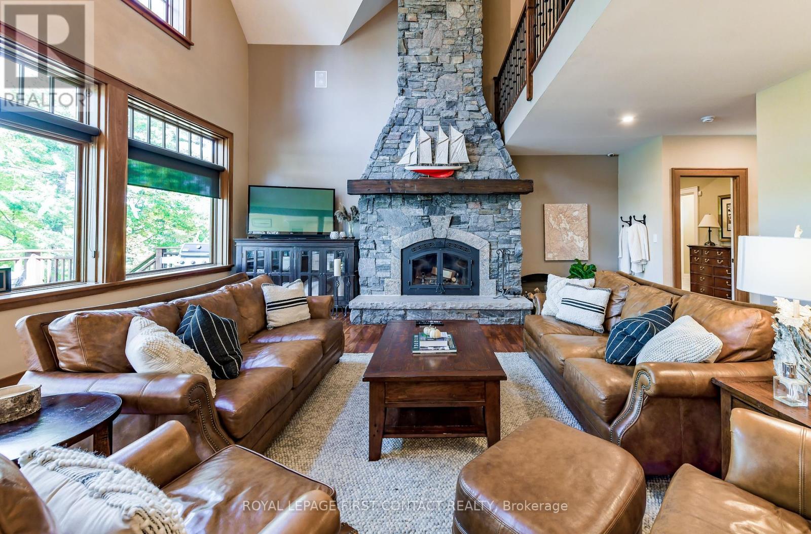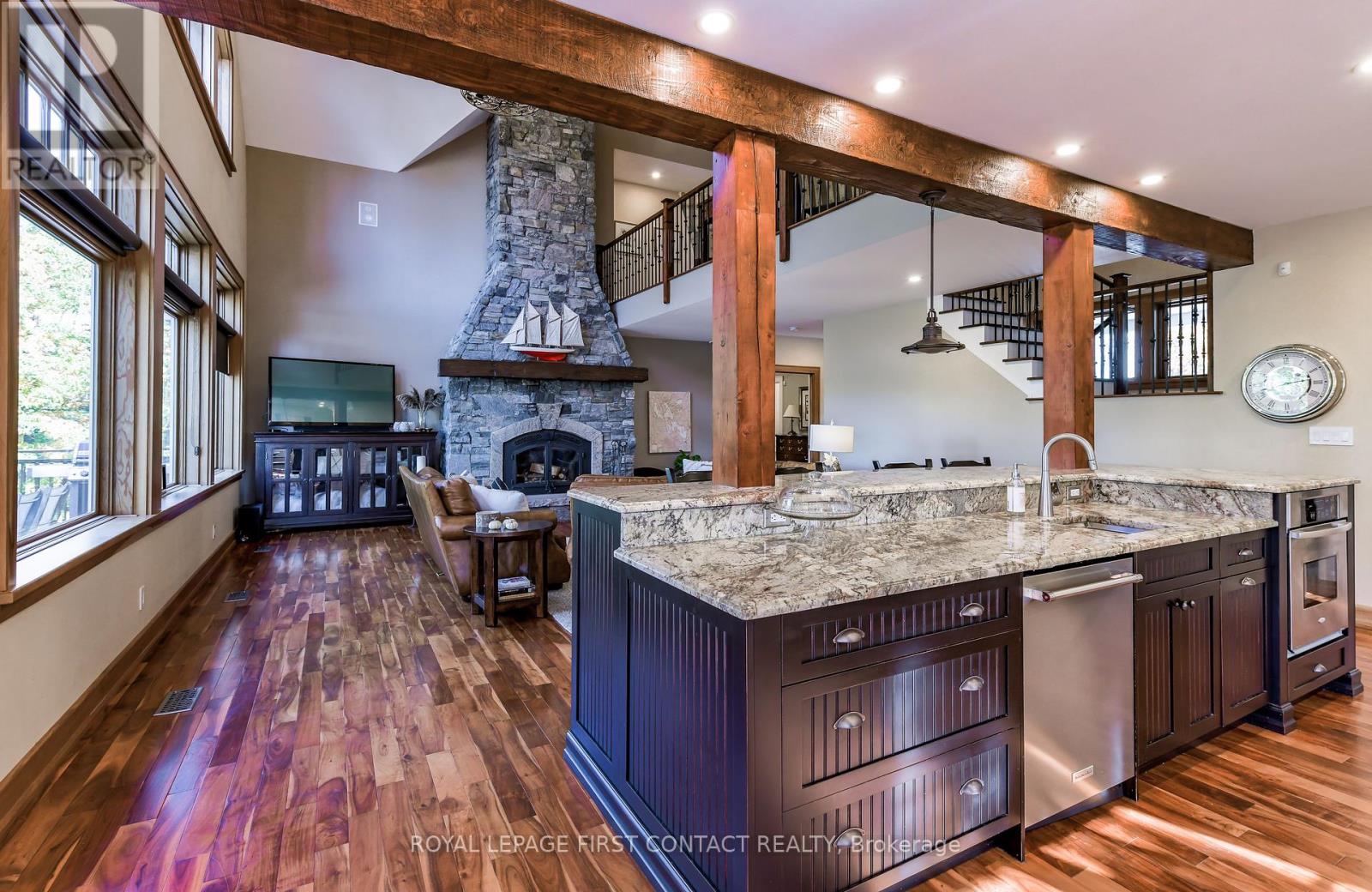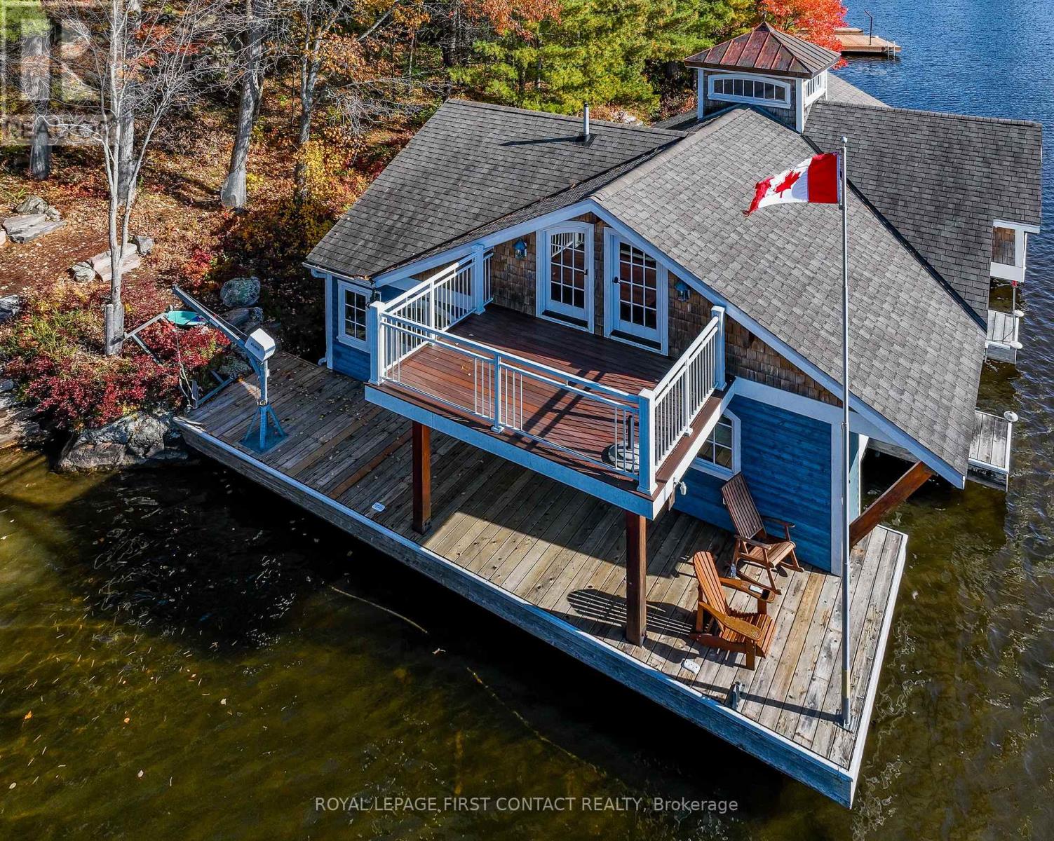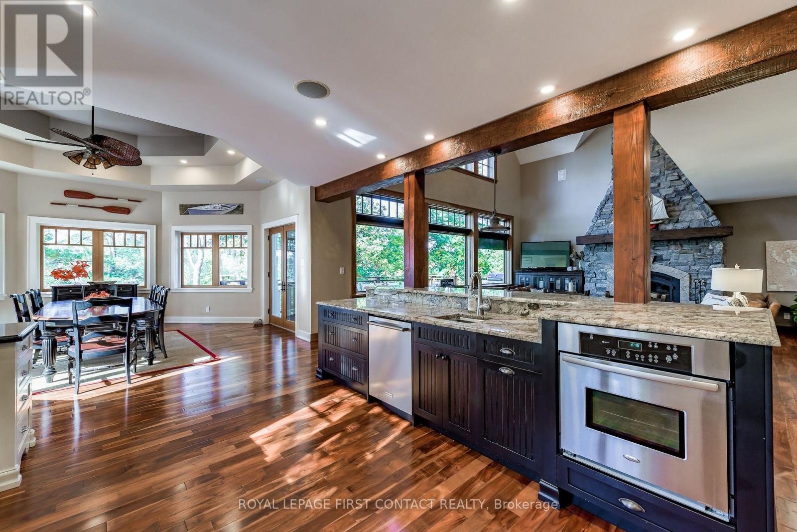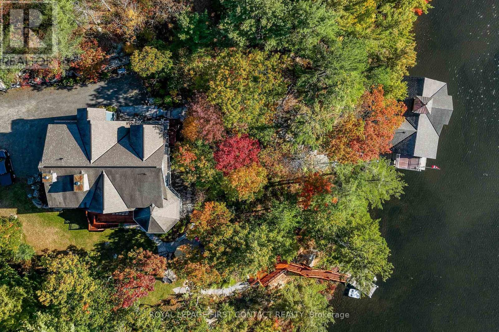 Perched at the end of a private year round paved road and nestled in a sheltered serene bay on Lake Muskoka. Sweeping southwestern panoramic views from a 347 ft point of land bordered by a rock wall for extra privacy. A Cutting Bros. finely crafted traditional Muskoka lakehouse built with exquisite attention to detail and meticulously maintained. Ready for year round living with 2 furnaces, 2 air conditioning condensors, a drilled well and backup wired automatic full generator. Beautifully landscaped with muskoka granite built patios, walkways, and steps that lead down to an impressive 3 slip boathouse that is equipped with hydraulic lifts. Bring the whole family or invite the guests, with over 6200 sq ft of living space including the fully finished bright sunlit walk out basement, there is room for everyone. 6 bedrooms, 4 bathrooms, and plans and permits are in place to create additional living quarters above the boathouse, creating endless possibilities. Soaring two-story beamed ceilings frame the great room, anchored by a dramatic stone fireplace with heatilators and a wall of windows that invite the lake inside The chefs kitchen is a showpiece in both form and function, featuring granite stone counters, a walk-in pantry, dual ovens, two sinks and a bar/beverage station for easy entertaining. Dining room effortlessly turns into the perfect screened in muskoka room with 5 massive windows that drop down and disappear into the walls, opening the space to enjoy breezy sunset views. The main floor primary bedroom, with another beautiful stone fireplace, a 5 pc ensuite with soaker tub, walk-in closet, plus a walk out to water view deck creates the perfect retreat. Lower level is designed for fun and relaxation, featuring a spacious games room, and rec room that are perfect for entertaining family and friends. From here walk out directly to beautiful granite patios where a hot tub awaits-an ideal spot to unwind and enjoy the views over the water and have a fire (id:56991)