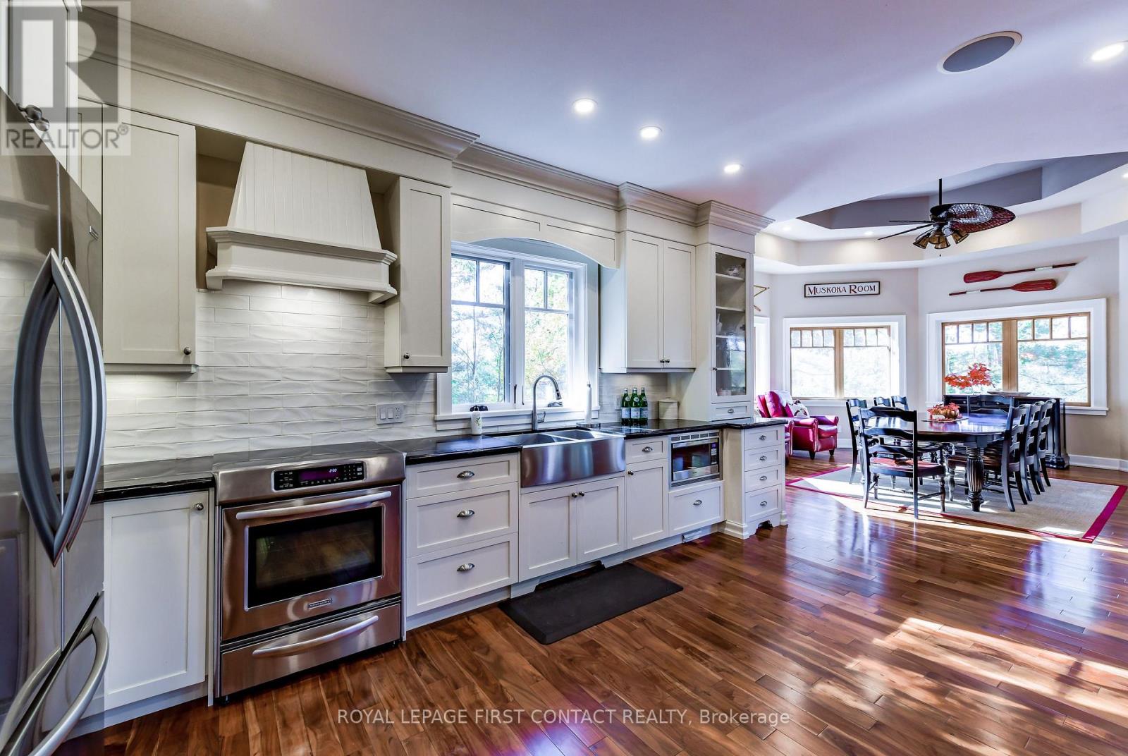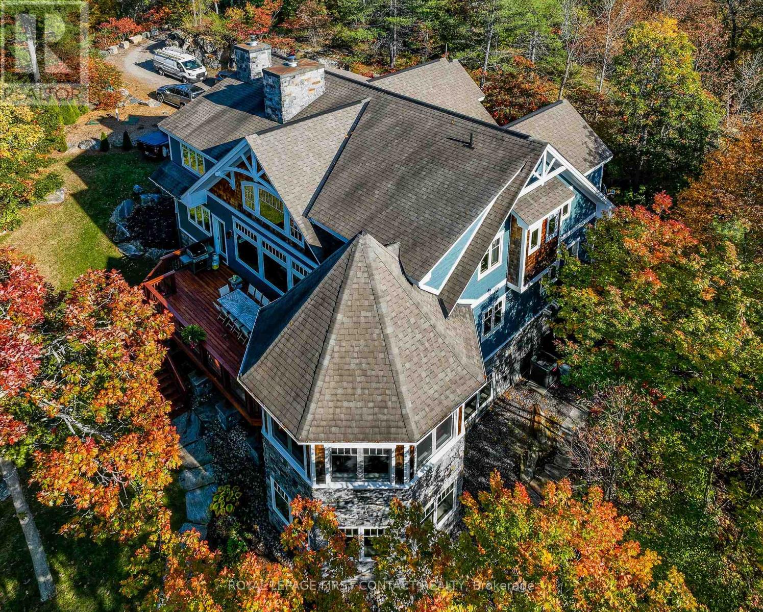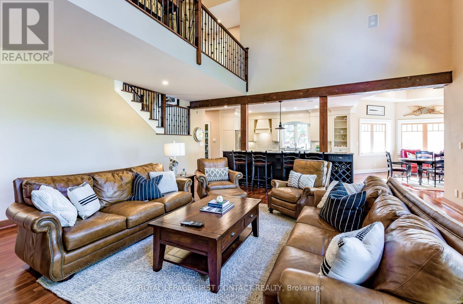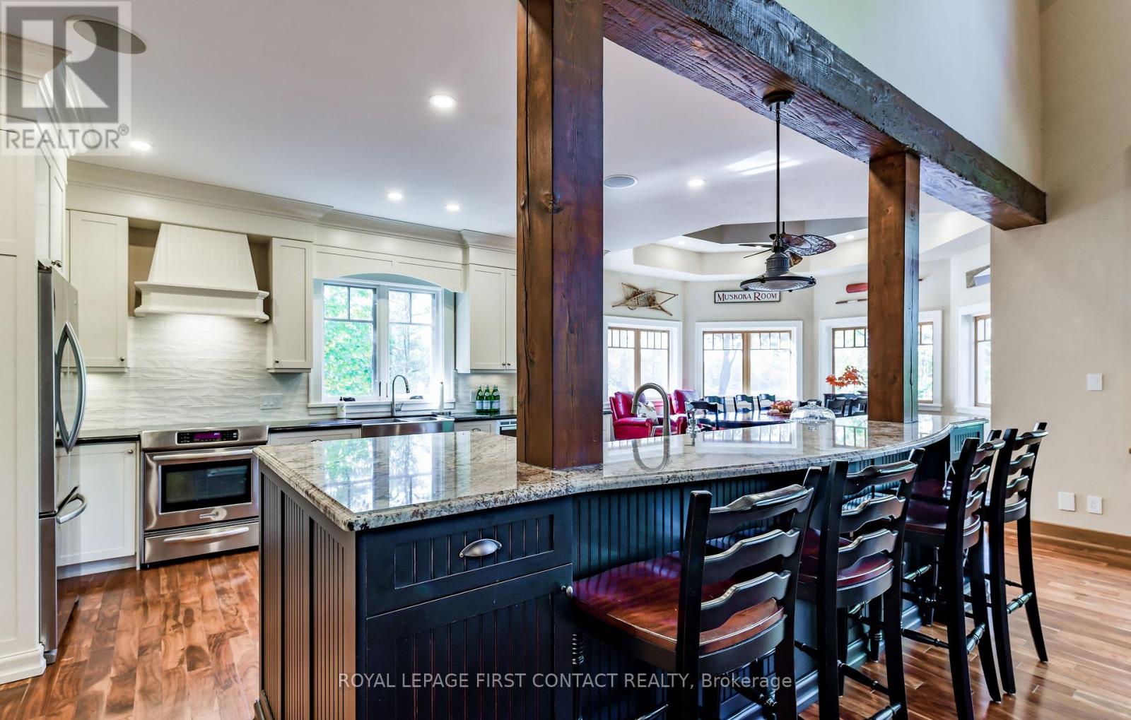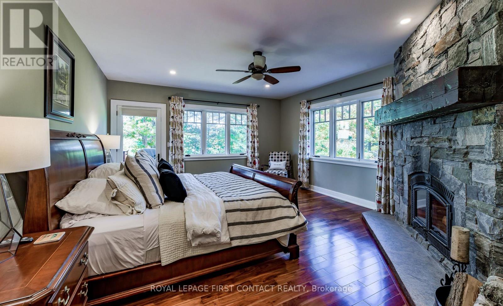 Perched at the end of a private year round paved road and nestled in a sheltered serene bay on Lake Muskoka. Sweeping southwestern panoramic views from a 347 ft point of land bordered by a rock wall for extra privacy. A Cutting Bros. finely crafted traditional Muskoka lakehouse built with exquisite attention to detail and meticulously maintained. Ready for year round living with 2 furnaces, 2 air conditioning condensors, a drilled well and backup wired automatic full generator. Beautifully landscaped with muskoka granite built patios, walkways, and steps that lead down to an impressive 3 slip boathouse that is equipped with hydraulic lifts. Bring the whole family or invite the guests, with over 6200 sq ft of living space including the fully finished bright sunlit walk out basement, there is room for everyone. 6 bedrooms, 4 bathrooms, and plans and permits are in place to create additional living quarters above the boathouse, creating endless possibilities. Soaring two-story beamed ceilings frame the great room, anchored by a dramatic stone fireplace with heatilators and a wall of windows that invite the lake inside The chefs kitchen is a showpiece in both form and function, featuring granite stone counters, a walk-in pantry, dual ovens, two sinks and a bar/beverage station for easy entertaining. Dining room effortlessly turns into the perfect screened in muskoka room with 5 massive windows that drop down and disappear into the walls, opening the space to enjoy breezy sunset views. The main floor primary bedroom, with another beautiful stone fireplace, a 5 pc ensuite with soaker tub, walk-in closet, plus a walk out to water view deck creates the perfect retreat. Lower level is designed for fun and relaxation, featuring a spacious games room, and rec room that are perfect for entertaining family and friends. From here walk out directly to beautiful granite patios where a hot tub awaits-an ideal spot to unwind and enjoy the views over the water and have a fire (id:56991)