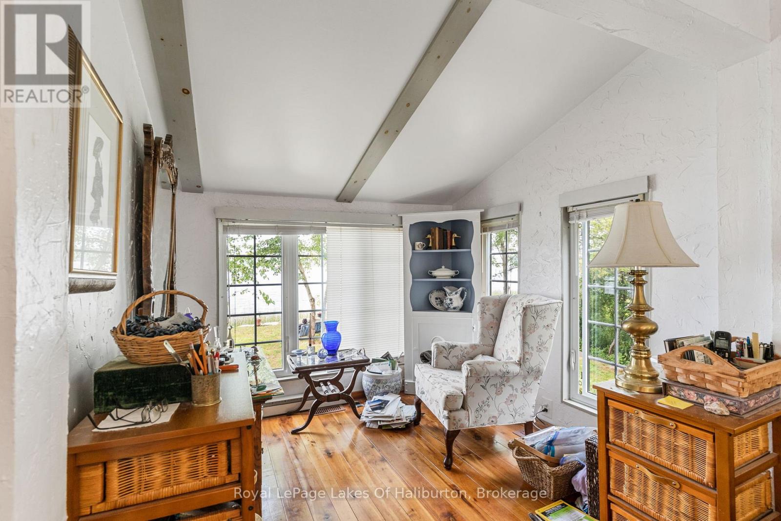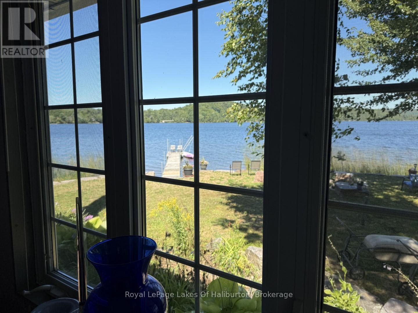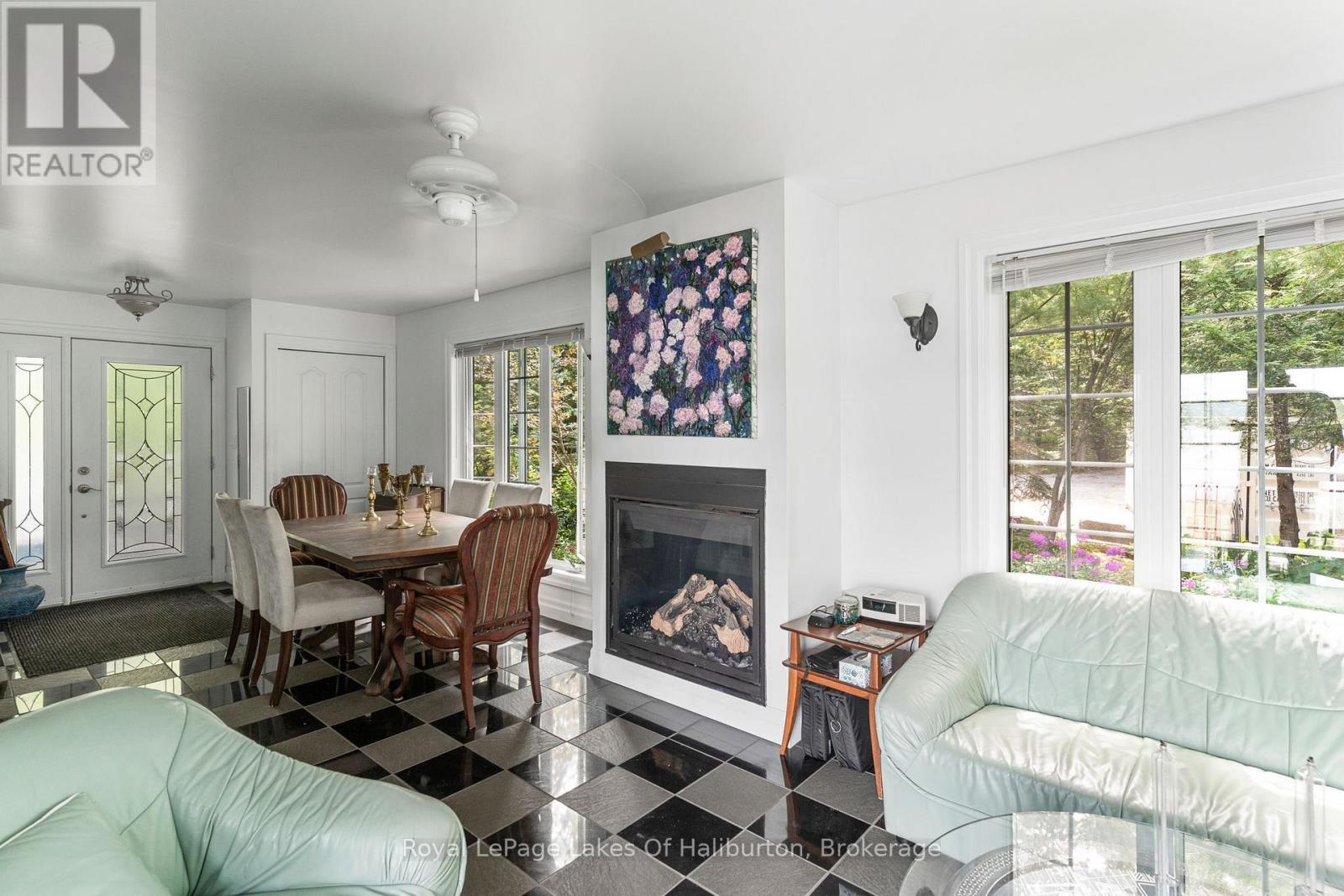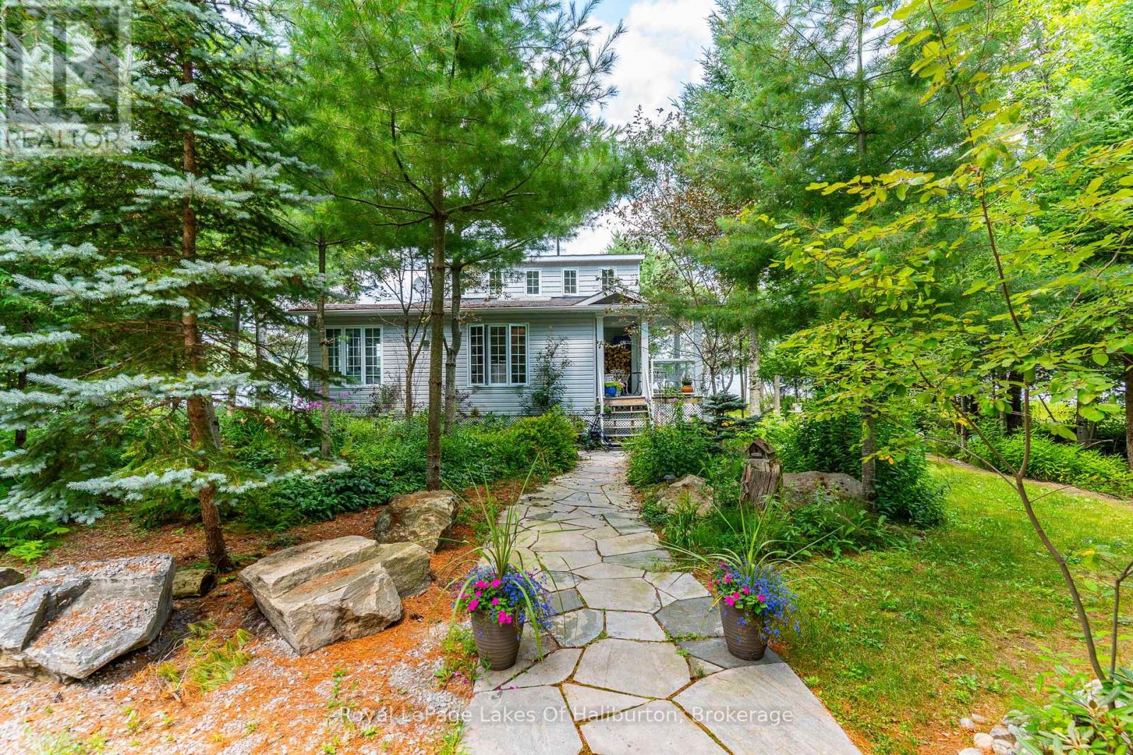 Year-round home or cottage on sought-after Maple Lake, part of a scenic 3-lake chain. This property offers a rarely found level lot with 103 ft of sand beach, an aluminum dock, and stunning lake views, current owner is enjoying as their perfect retirement home.The 3-bedroom, 2-bathroom home combines comfort, function, and recent high-end upgrades. Over $300,000 has been invested in custom landscaping, including stone patios and walkways and shoreline enhancements with a stone retaining wall. Lush perennial gardens, charming small creek, plus a garden shed and cute privy. Inside, the living room showcases cherry floors, a Napoleon zero-clearance airtight fireplace, and walls of windows framing the water. The main-floor bedroom features cherry floors, double closets, and lake views, with the main 5pc bathroom offering laundry, a bidet, and a Safe Step walk-in tub/shower with heated seat and therapy functions.The kitchen is fitted with granite countertops and ample cabinetry. The sun-filled family room/sunroom boasts beautiful lake views, a propane fireplace, abundant lakeside windows, sliding glass door walkout to lakeside deck and custom stone patio. Open concept with the dining room with lots of storage and large picture windows and walks out to a 10 'x 11' covered deck with Trex decking. Extras include central air, central vac, propane forced-air furnace, drilled well and pumphouse that supplies water for the flowers. A bonus to this beautiful setting is the oversized insulated garage with a pine-finished studio with a propane airtight stove, plus a single-car garage with electric door opener, insulated and drywalled. Upstairs, a pine-finished loft with skylights, large windows, track lighting, and generous storage completes this waterfront retreat. Access off Highway 118 with a easy commute to the GTA. (id:56991)