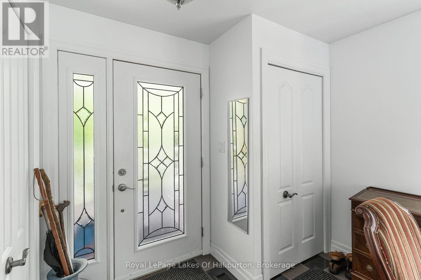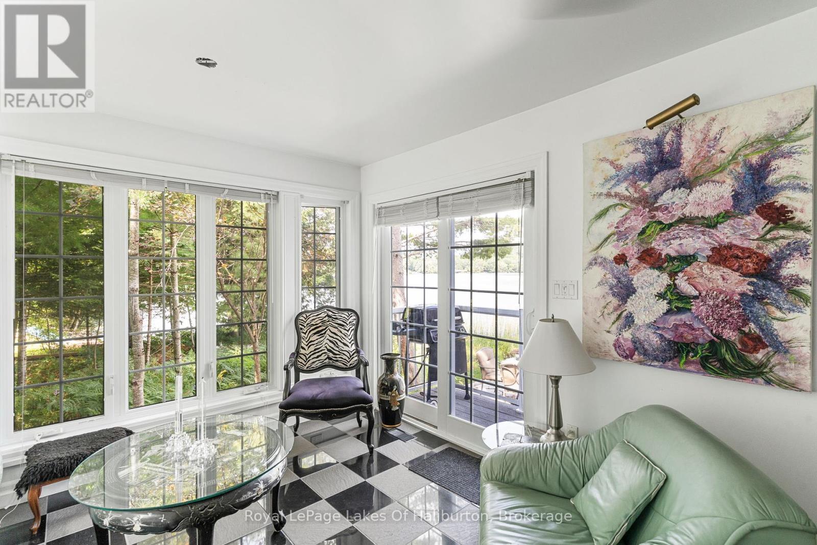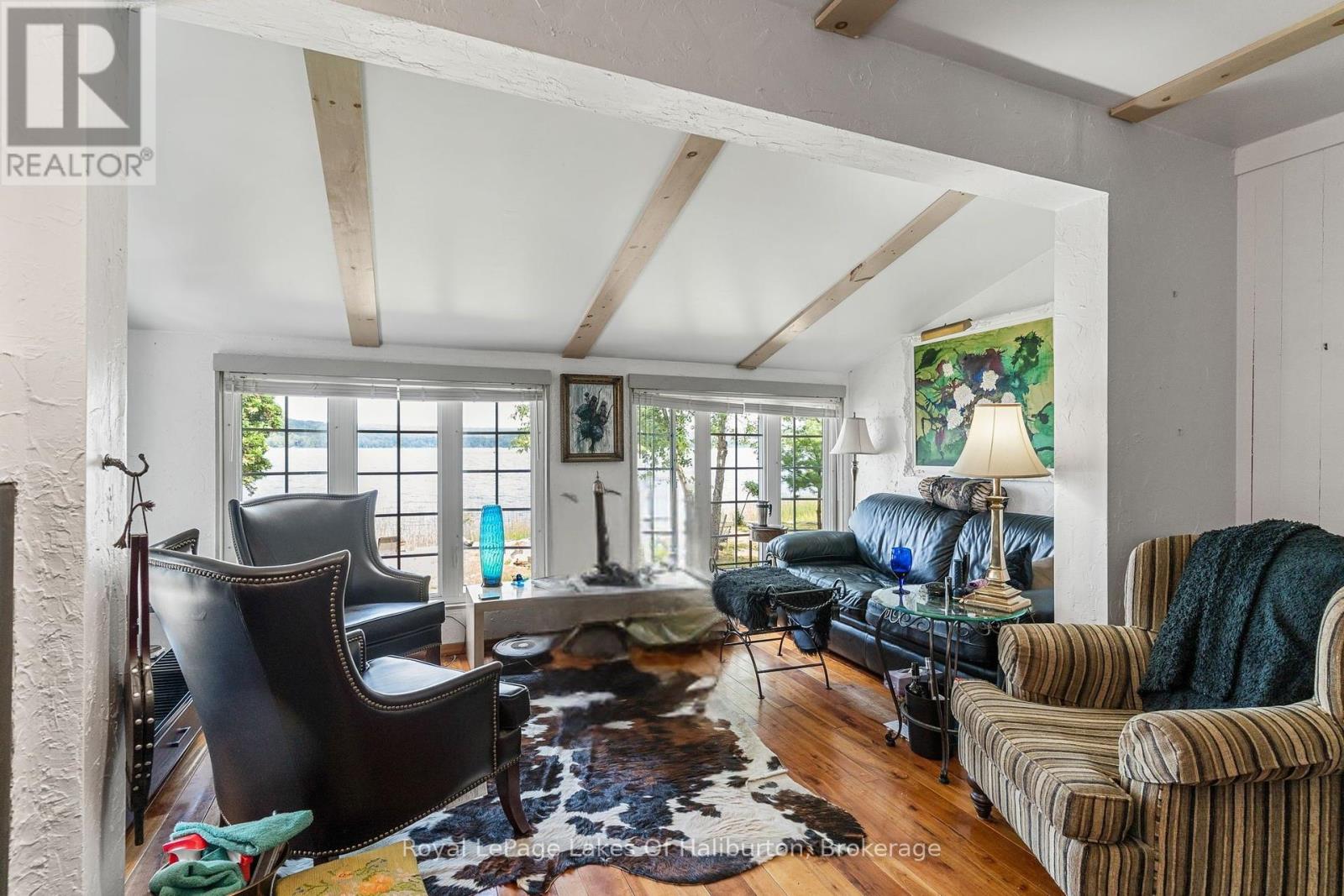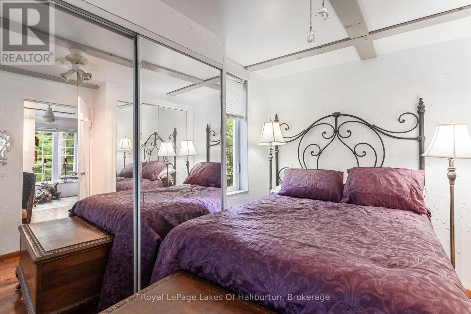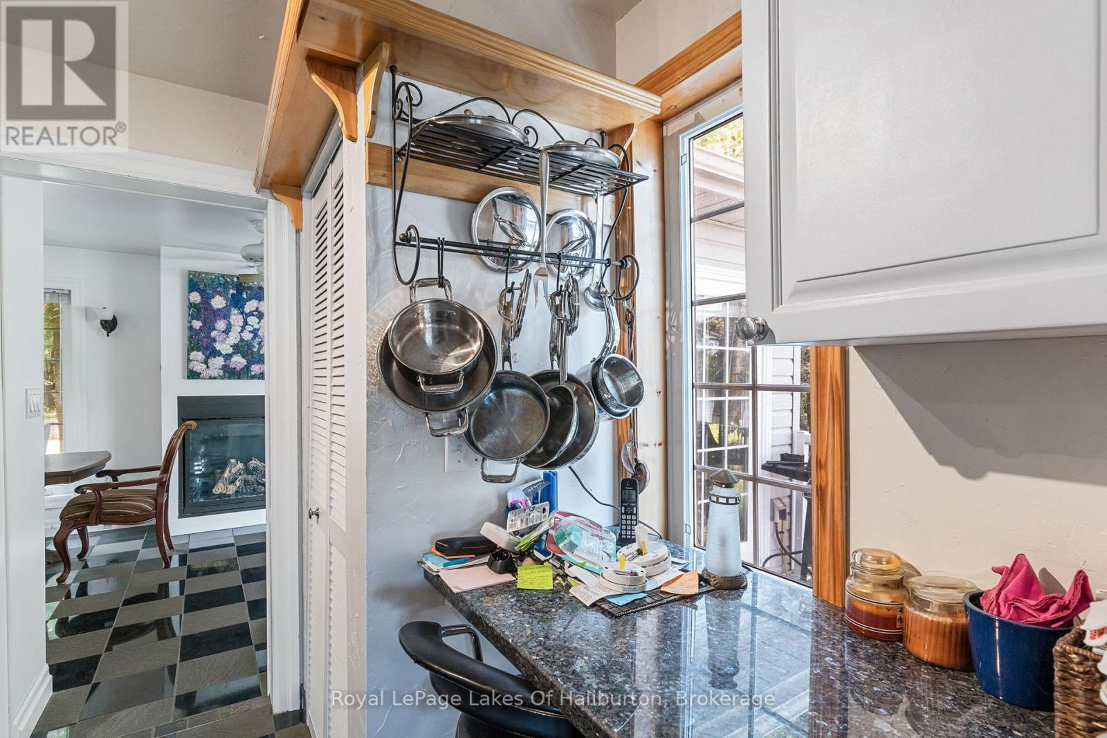 Year-round home or cottage on sought-after Maple Lake, part of a scenic 3-lake chain. This property offers a rarely found level lot with 103 ft of sand beach, an aluminum dock, and stunning lake views, current owner is enjoying as their perfect retirement home.The 3-bedroom, 2-bathroom home combines comfort, function, and recent high-end upgrades. Over $300,000 has been invested in custom landscaping, including stone patios and walkways and shoreline enhancements with a stone retaining wall. Lush perennial gardens, charming small creek, plus a garden shed and cute privy. Inside, the living room showcases cherry floors, a Napoleon zero-clearance airtight fireplace, and walls of windows framing the water. The main-floor bedroom features cherry floors, double closets, and lake views, with the main 5pc bathroom offering laundry, a bidet, and a Safe Step walk-in tub/shower with heated seat and therapy functions.The kitchen is fitted with granite countertops and ample cabinetry. The sun-filled family room/sunroom boasts beautiful lake views, a propane fireplace, abundant lakeside windows, sliding glass door walkout to lakeside deck and custom stone patio. Open concept with the dining room with lots of storage and large picture windows and walks out to a 10 'x 11' covered deck with Trex decking. Extras include central air, central vac, propane forced-air furnace, drilled well and pumphouse that supplies water for the flowers. A bonus to this beautiful setting is the oversized insulated garage with a pine-finished studio with a propane airtight stove, plus a single-car garage with electric door opener, insulated and drywalled. Upstairs, a pine-finished loft with skylights, large windows, track lighting, and generous storage completes this waterfront retreat. Access off Highway 118 with a easy commute to the GTA. (id:56991)