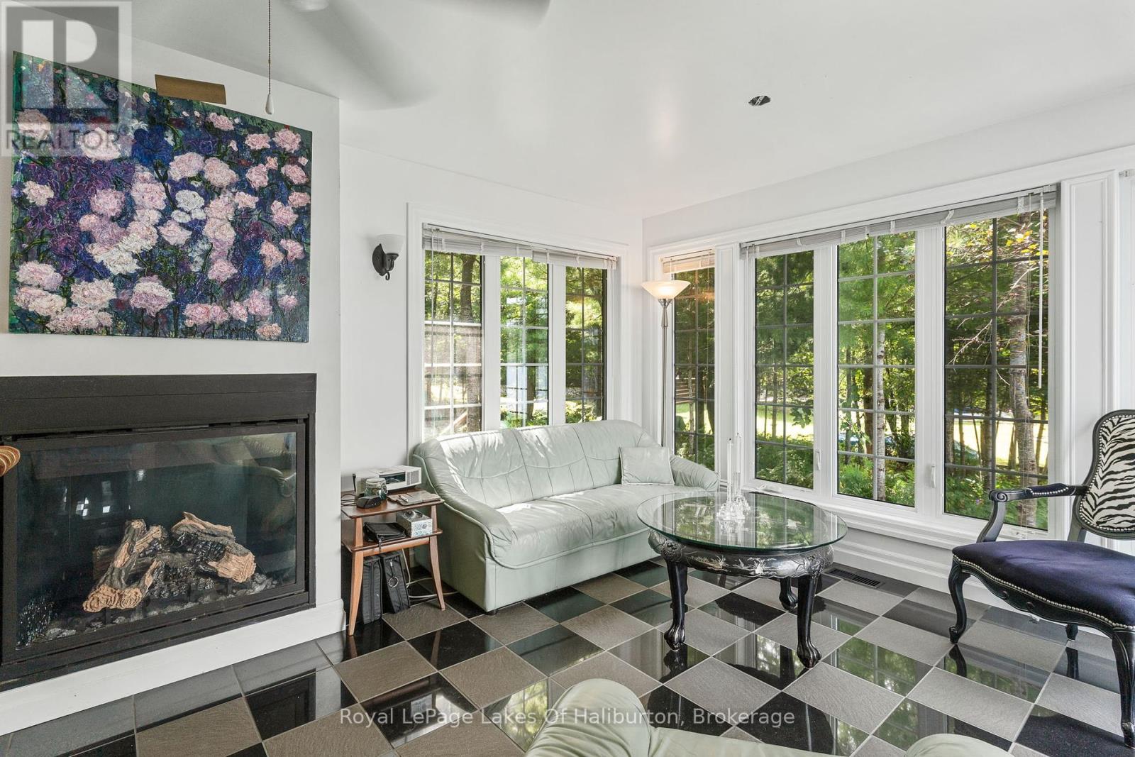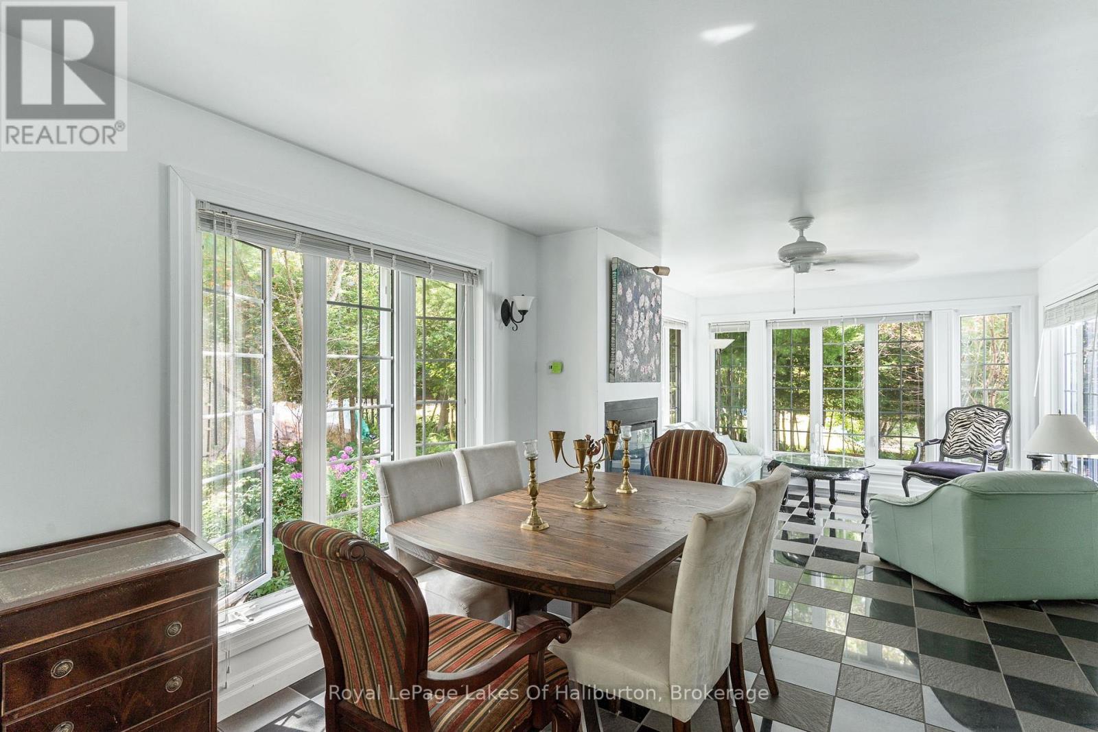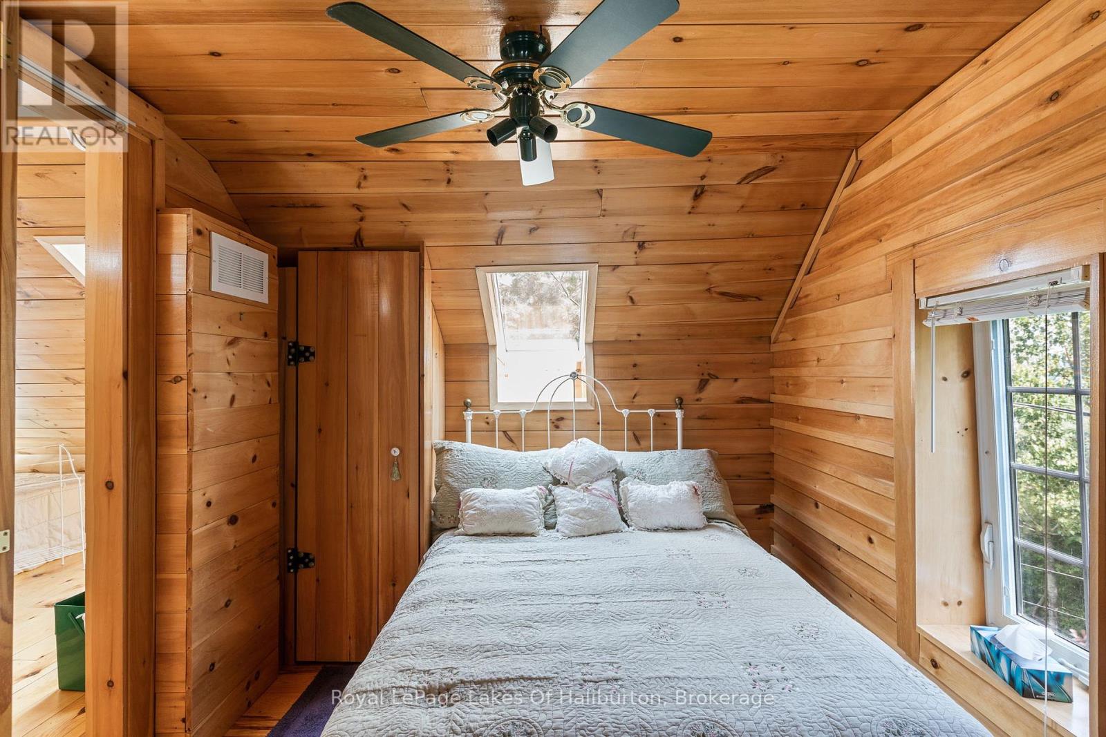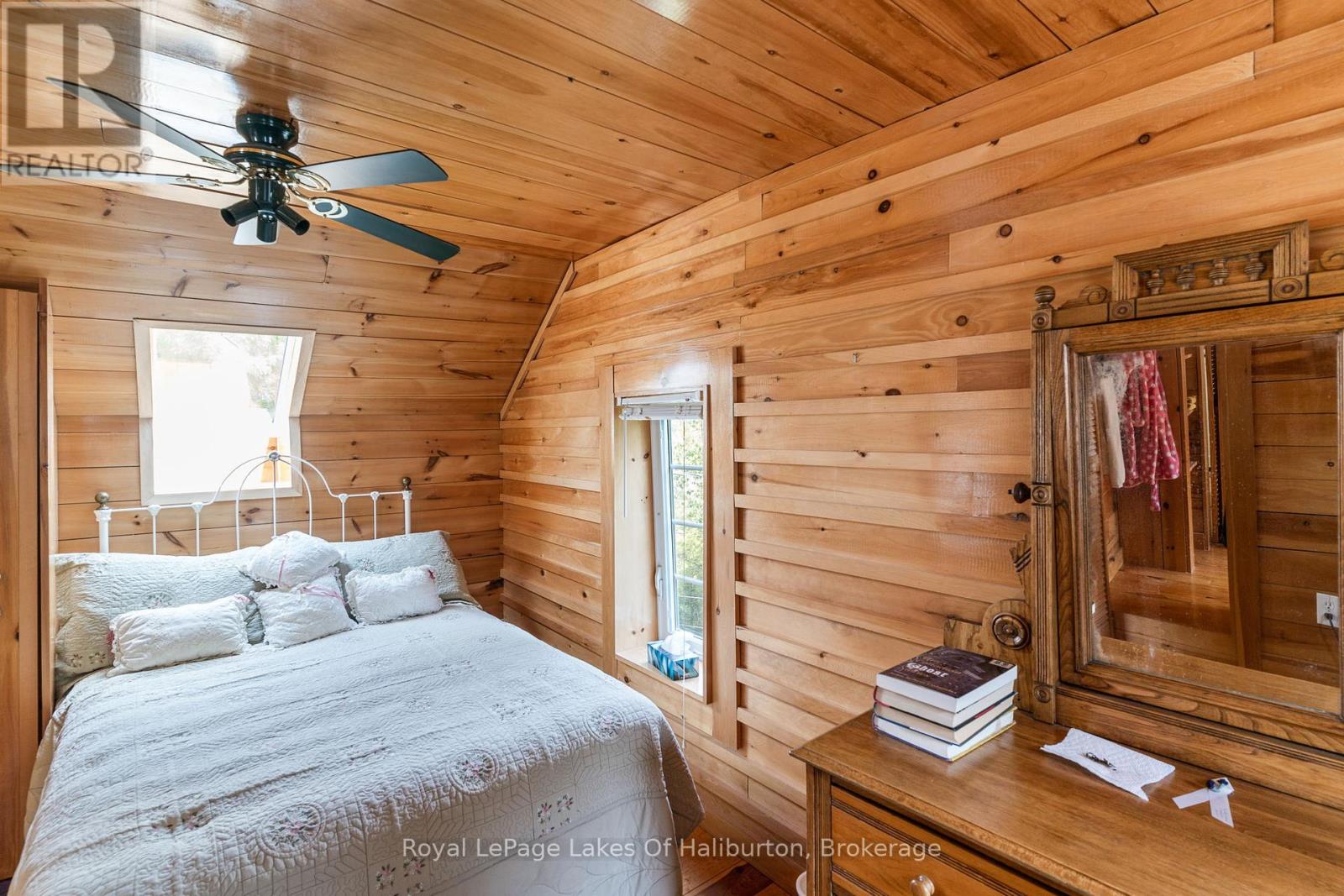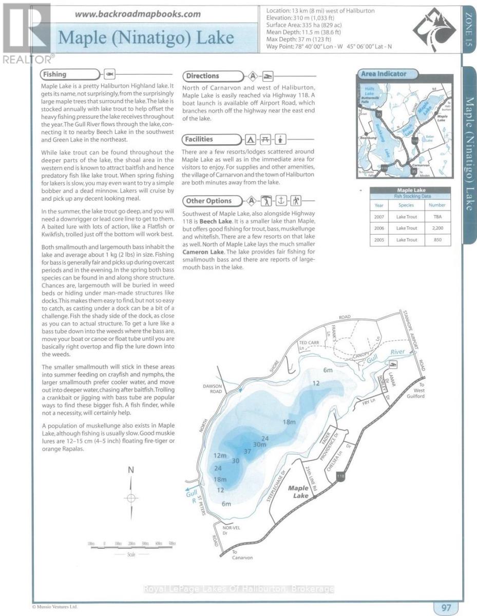 Year-round home or cottage on sought-after Maple Lake, part of a scenic 3-lake chain. This property offers a rarely found level lot with 103 ft of sand beach, an aluminum dock, and stunning lake views, current owner is enjoying as their perfect retirement home.The 3-bedroom, 2-bathroom home combines comfort, function, and recent high-end upgrades. Over $300,000 has been invested in custom landscaping, including stone patios and walkways and shoreline enhancements with a stone retaining wall. Lush perennial gardens, charming small creek, plus a garden shed and cute privy. Inside, the living room showcases cherry floors, a Napoleon zero-clearance airtight fireplace, and walls of windows framing the water. The main-floor bedroom features cherry floors, double closets, and lake views, with the main 5pc bathroom offering laundry, a bidet, and a Safe Step walk-in tub/shower with heated seat and therapy functions.The kitchen is fitted with granite countertops and ample cabinetry. The sun-filled family room/sunroom boasts beautiful lake views, a propane fireplace, abundant lakeside windows, sliding glass door walkout to lakeside deck and custom stone patio. Open concept with the dining room with lots of storage and large picture windows and walks out to a 10 'x 11' covered deck with Trex decking. Extras include central air, central vac, propane forced-air furnace, drilled well and pumphouse that supplies water for the flowers. A bonus to this beautiful setting is the oversized insulated garage with a pine-finished studio with a propane airtight stove, plus a single-car garage with electric door opener, insulated and drywalled. Upstairs, a pine-finished loft with skylights, large windows, track lighting, and generous storage completes this waterfront retreat. Access off Highway 118 with a easy commute to the GTA. (id:56991)