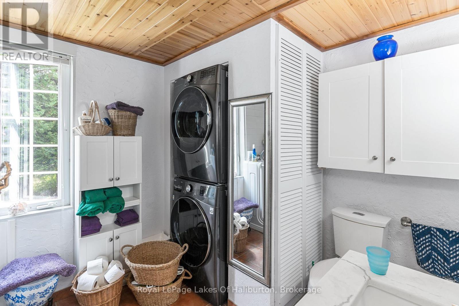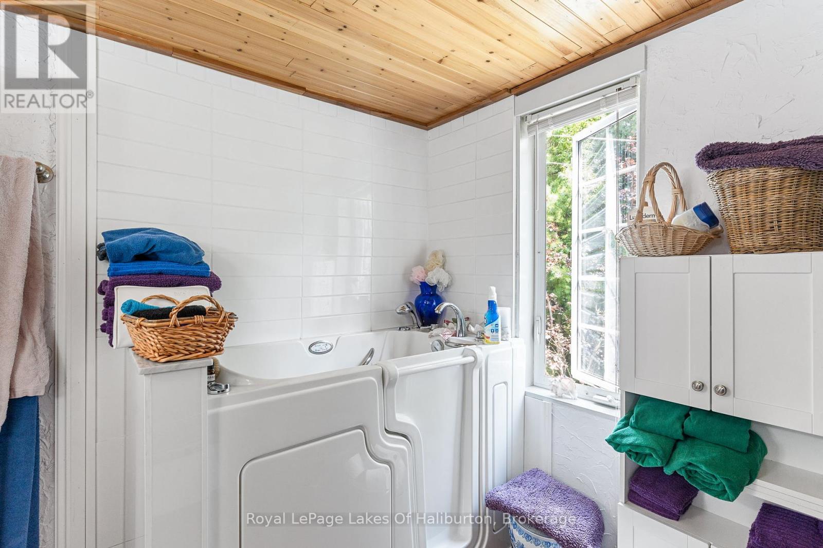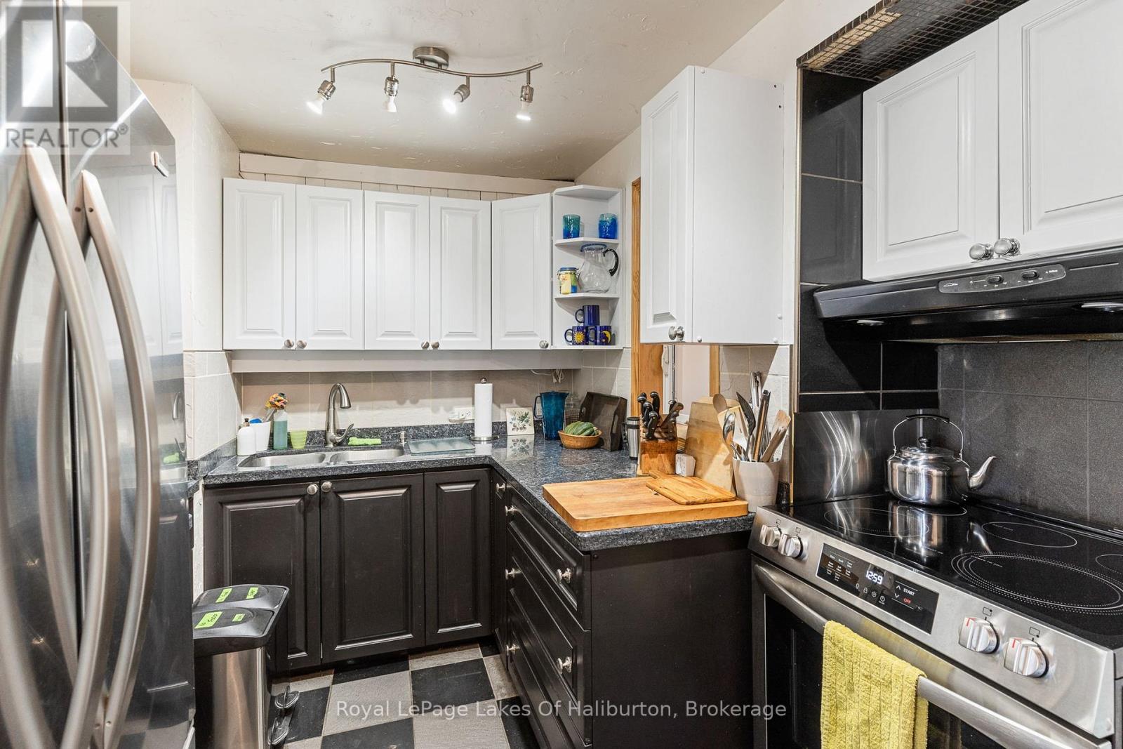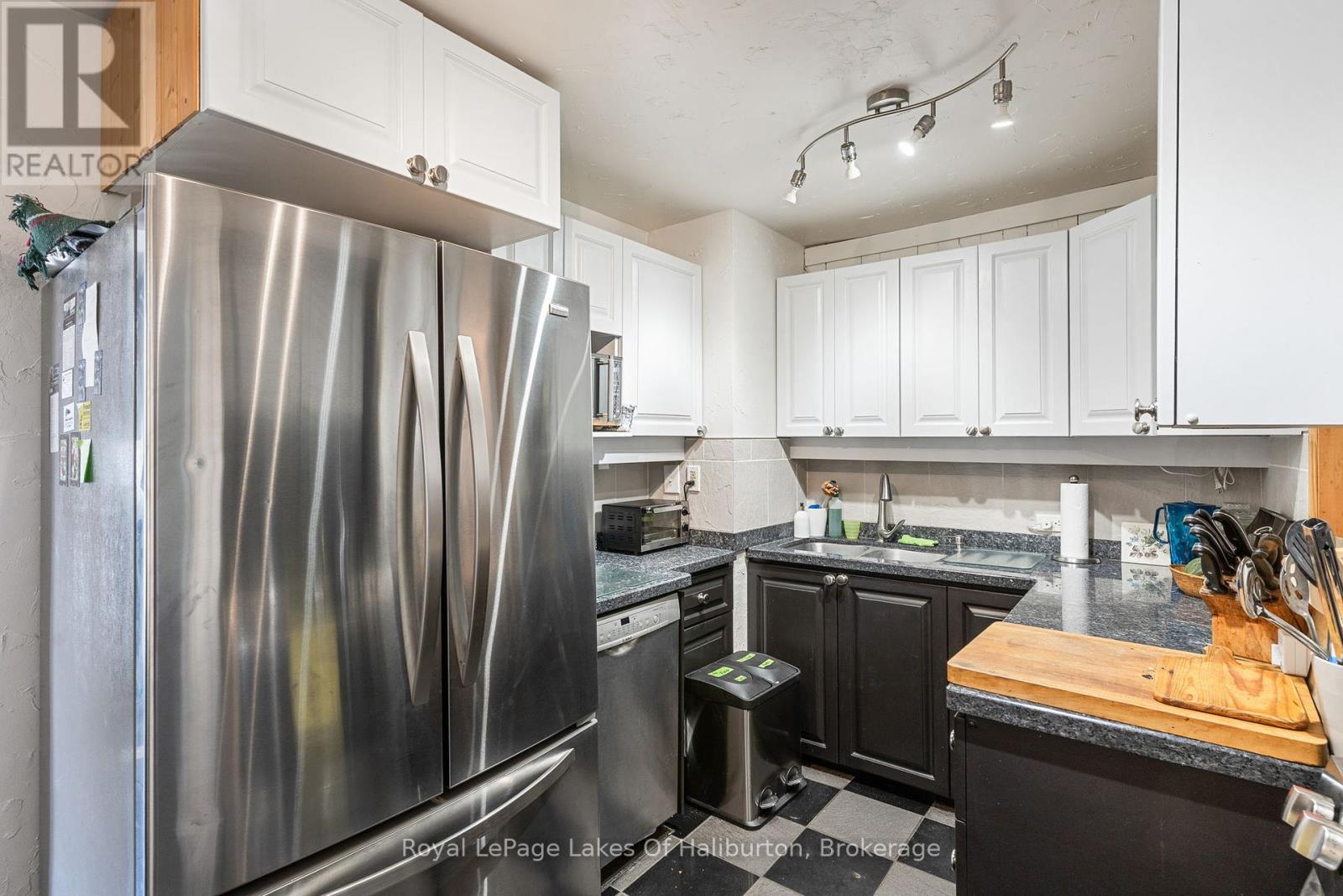 Year-round home or cottage on sought-after Maple Lake, part of a scenic 3-lake chain. This property offers a rarely found level lot with 103 ft of sand beach, an aluminum dock, and stunning lake views, current owner is enjoying as their perfect retirement home.The 3-bedroom, 2-bathroom home combines comfort, function, and recent high-end upgrades. Over $300,000 has been invested in custom landscaping, including stone patios and walkways and shoreline enhancements with a stone retaining wall. Lush perennial gardens, charming small creek, plus a garden shed and cute privy. Inside, the living room showcases cherry floors, a Napoleon zero-clearance airtight fireplace, and walls of windows framing the water. The main-floor bedroom features cherry floors, double closets, and lake views, with the main 5pc bathroom offering laundry, a bidet, and a Safe Step walk-in tub/shower with heated seat and therapy functions.The kitchen is fitted with granite countertops and ample cabinetry. The sun-filled family room/sunroom boasts beautiful lake views, a propane fireplace, abundant lakeside windows, sliding glass door walkout to lakeside deck and custom stone patio. Open concept with the dining room with lots of storage and large picture windows and walks out to a 10 'x 11' covered deck with Trex decking. Extras include central air, central vac, propane forced-air furnace, drilled well and pumphouse that supplies water for the flowers. A bonus to this beautiful setting is the oversized insulated garage with a pine-finished studio with a propane airtight stove, plus a single-car garage with electric door opener, insulated and drywalled. Upstairs, a pine-finished loft with skylights, large windows, track lighting, and generous storage completes this waterfront retreat. Access off Highway 118 with a easy commute to the GTA. (id:56991)