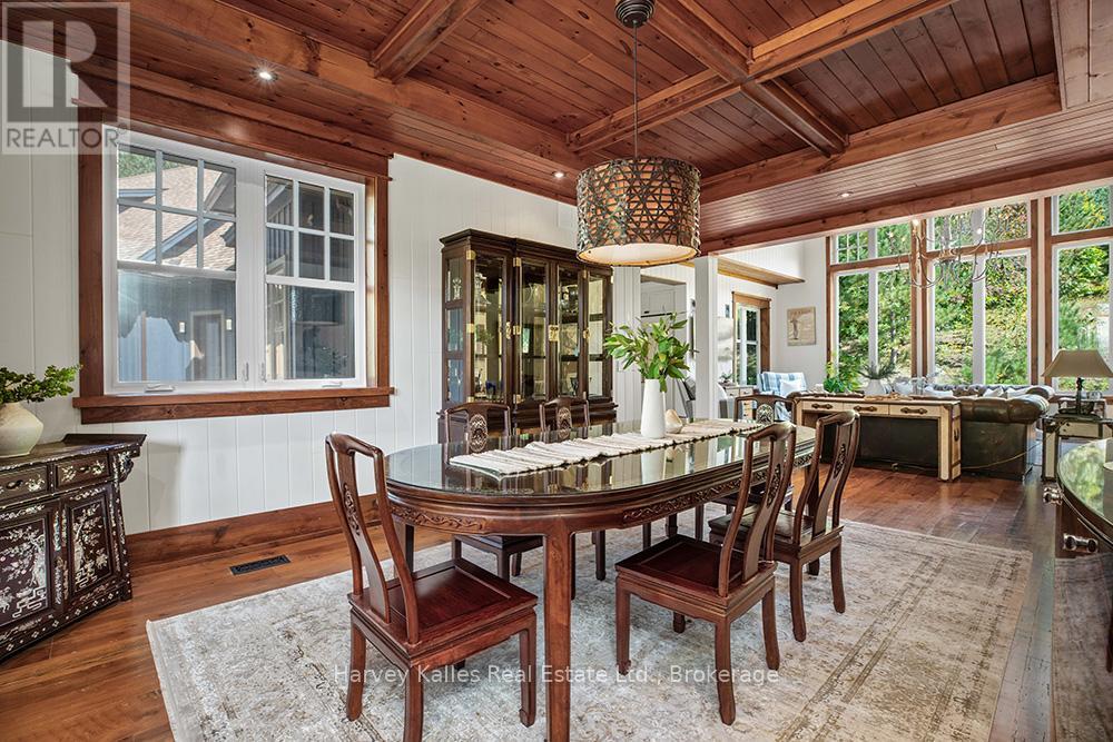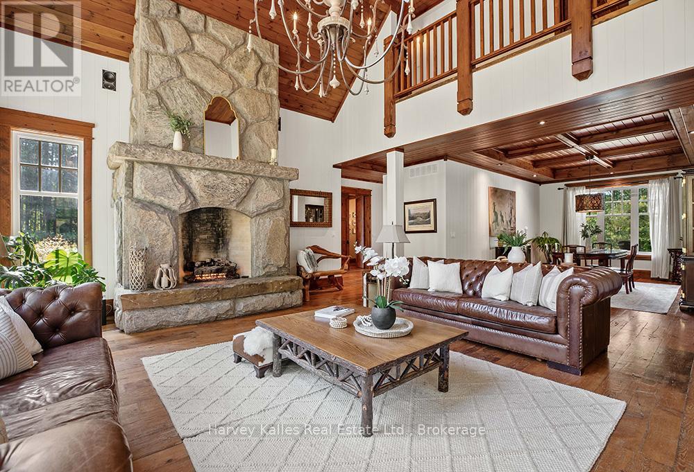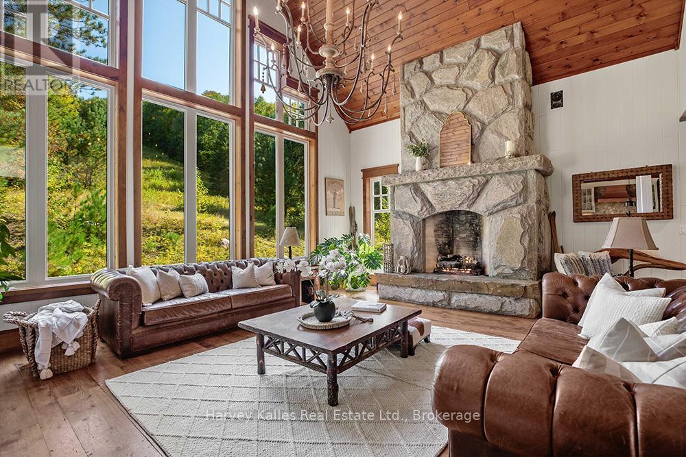 Meticulously planned, designed and crafted, this 7000+sqft home or recreational retreat is surrounded by more than 35 acres of unique landscapes and is just minutes to a beach and boat launch on Peninsula Lake. The sprawling residence was built to maintain efficiency with ICF construction and in-floor heating, as well, every element in this custom-build was carefully selected from only quality products. This home offers extensive modern comforts and fine finishes from high-end kitchen appliances, Emtek hardware, Perrin & Rowe faucets to the reclaimed hemlock floors, Toto toilets, & oversized fireplaces. Upon arrival, it's evident that the designer thoroughly considered the floor plan to provide the ultimate in function, convenience, and luxury. The main floor is flooded with natural light with floor-to-ceiling windows, offers a desirable open-concept layout and hosts the stunning primary bedroom. You will fall in love with the lavish primary suite featuring a 5pc ensuite with steam shower, heated floors and a soaker tub with panoramic views. The walk-in closet provides enough space for your attire, shoes & accessories. For your family or guests, the 2nd level offers a dedicated space for relaxation, with each of the three tastefully decorated bedrooms enhanced by ensuite privileges. The sizeable recreation room on the lower level is ideal for table games or hosting gatherings, and the separate guest wing is well suited for your guests with a private 3pc bath. For ease, the 3-car attached garage allows effortless entry to the home, and the finished space above creates a perfect in-law suite or a bonus space for growing families. Formerly known & operated as Tally Ho Winter Park, this incredible property has been cherished and holds fond memories for those who enjoyed spending winters here or learned to ski on the once-maintained hills. With so much outdoor space to enjoy, owners & guests are privy to a lifestyle of endless exploration and entertainment. (id:56991)
