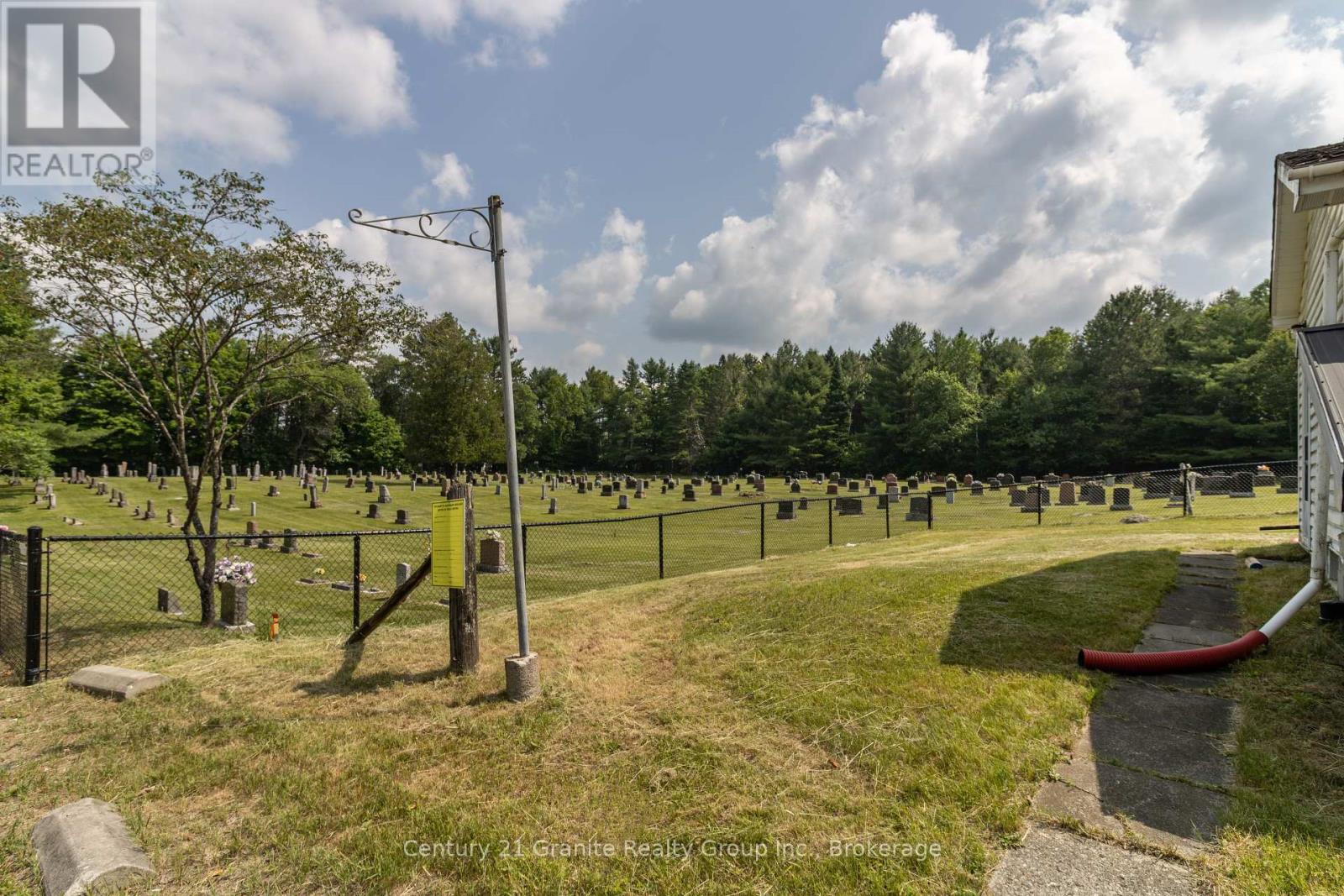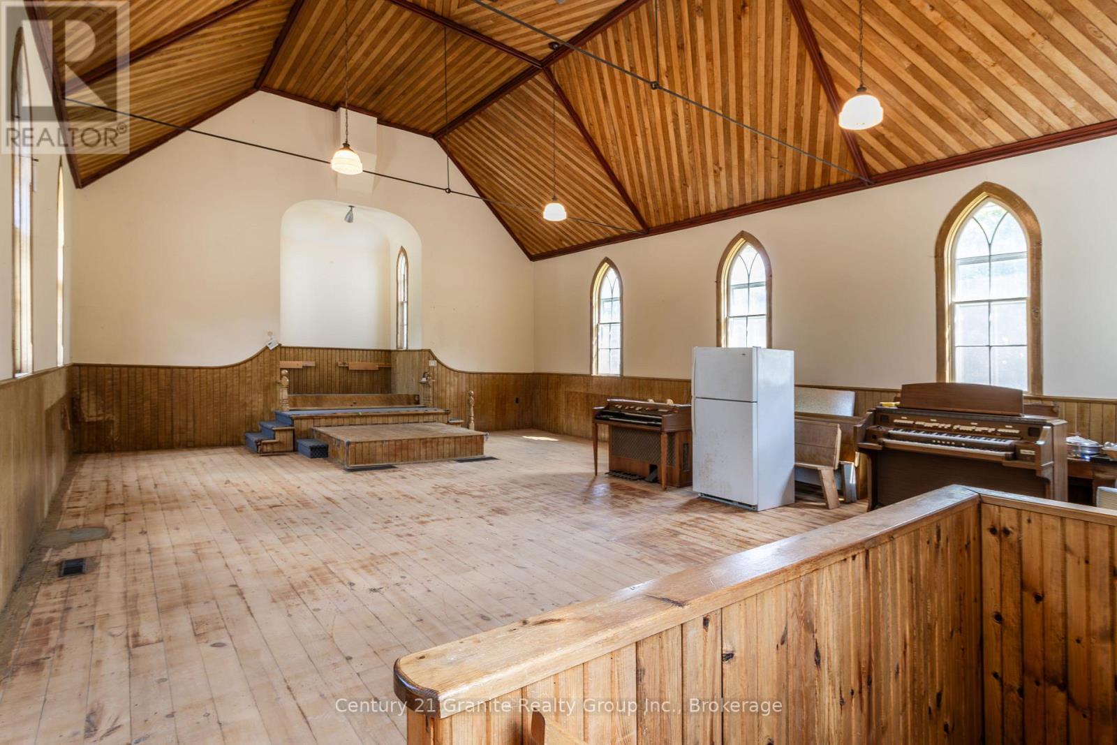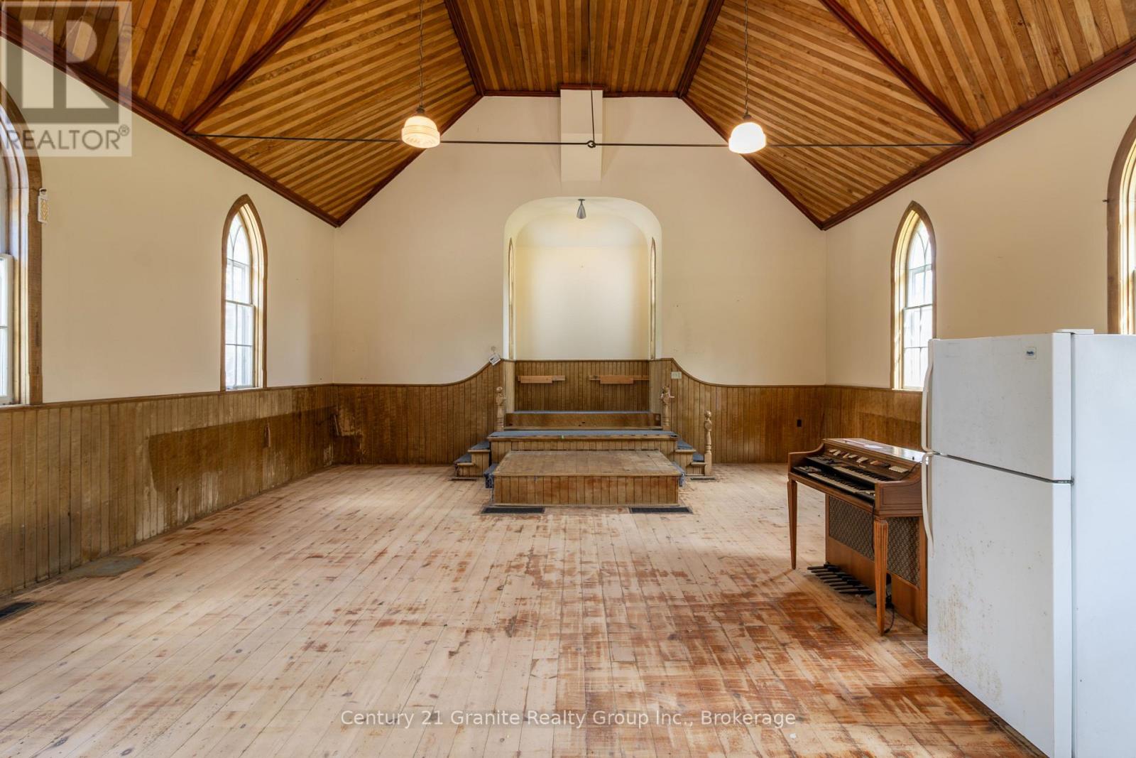 Discover the unique charm and endless possibilities of this former church, ideally located at the corner of Highway 118 and Stanhope Airport Road. This distinctive property has been thoughtfully rezoned for residential use and is ready for its next chapter. Step inside the open-concept main level where you're welcomed by a bright entryway or mudroom that leads into the stunning former chapel. This space is filled with character, featuring soaring cathedral-style wood ceilings and breathtaking stained glass details in the arched windows, a beautiful nod to the buildings historic roots. The lower level offers high ceilings and remains unfinished, providing a blank canvas for additional living space, studio, or storage. A wide staircase at the rear of the building, once home to the original church washrooms, leads to a back entrance and a fenced yard. Set on a flat and manageable lot, the property includes a newer propane furnace, a drilled well, and a holding tank. Conveniently located between Haliburton and Minden, and just minutes from West Guilford, you'll enjoy easy access to amenities while enjoying a quiet and unique setting. Bring your vision and transform this one-of-a-kind space into your dream home, studio, or creative retreat. (id:56991)