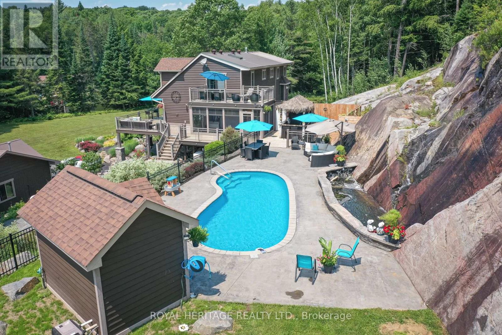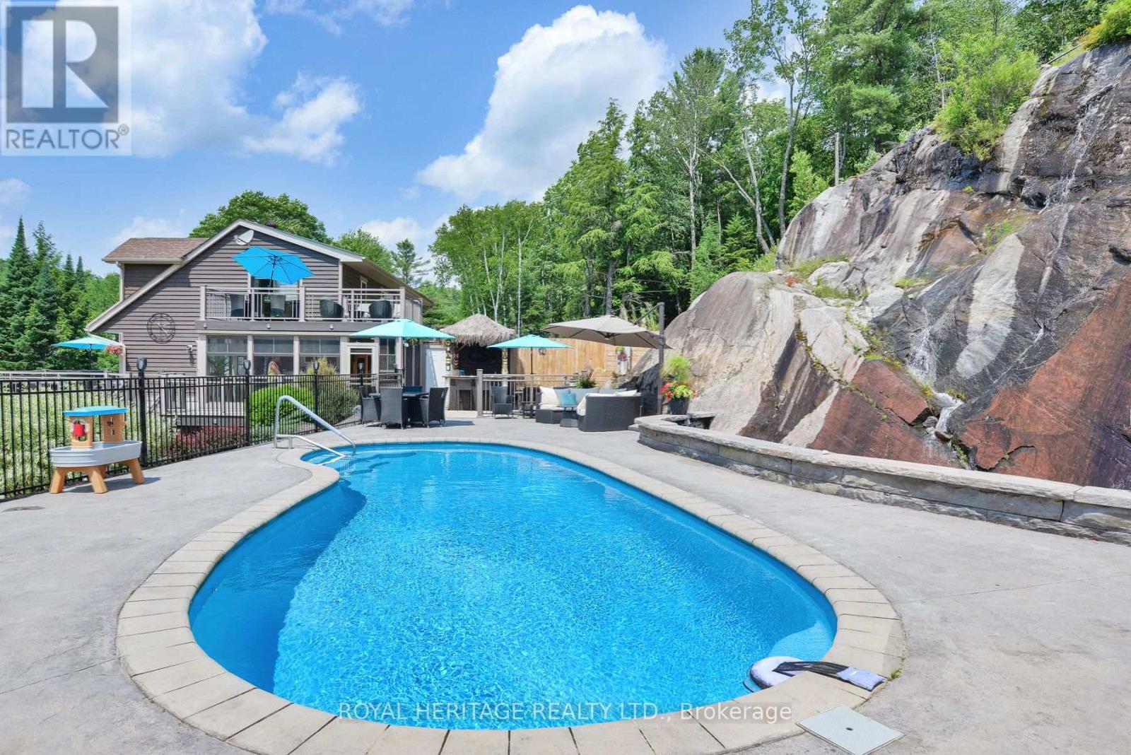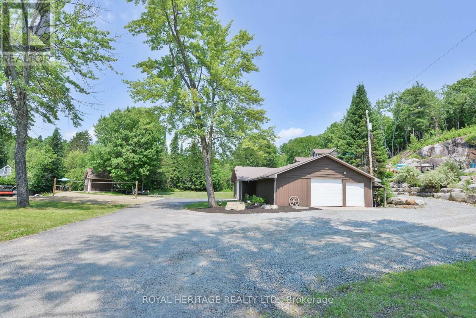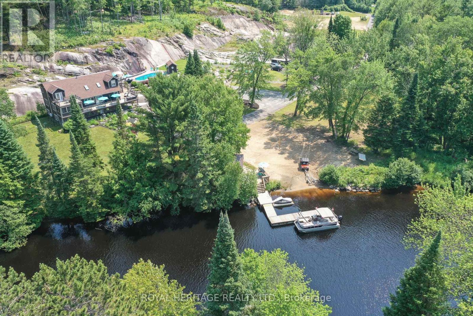 Spectacular, unique, unforgettable. These are just a few words to describe this magical, one of a kind property. Formerly featured in a Muskoka magazine, the home and property offer plenty of space for entertaining, a growing family or simply reconnecting with nature and wildlife. Design elements, including local Muskoka granite picked and split by the owners hand and built into the feature wall and kitchen island, all help to create a space that welcomes you from its front gates to its front door and beyond. Soaring vaulted ceilings and architectural beams in the main living area and primary bedroom, as well as a thoughtfully redesigned interior created during the building of a significant addition completed in 2016, provided the owner and designer an opportunity to create a spacious, interesting yet functional space. Breathtaking views from numerous balconies, windows and patios overlook the grounds, gardens, 30ft waterfall and approx. 500 ft of Mother Natures perfect river front. The in-ground salt water pool, tiki bar, infrared sauna, built in hot tub, large gym, theatre room, ball court, sandy beach with gentle water entry for swimming, dock for boating, waters edge bunkie (sleeping 4 comfortably), the huge 5 car garage, large RV shed with oil pit and even the bonfire lookout on top of the hill of your 11 acre property will afford you the last ray of sunshine with the setting sun to complete your daily living experience. Should you ever wish to leave your property, you are just a few short minutes to the heart of Huntsville by car and a short boat ride along the river to Lake Vernon and further access to Fairy, Mary and Peninsula Lakes. Pictures may speak a thousand words but this property has thousands more to share with you in person. Private showings only. (id:56991)
