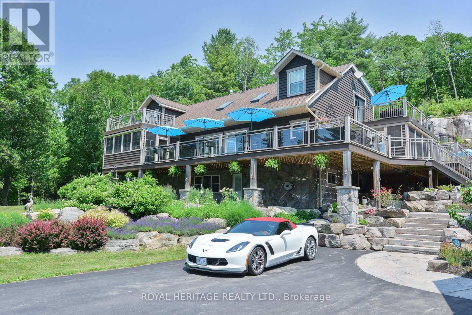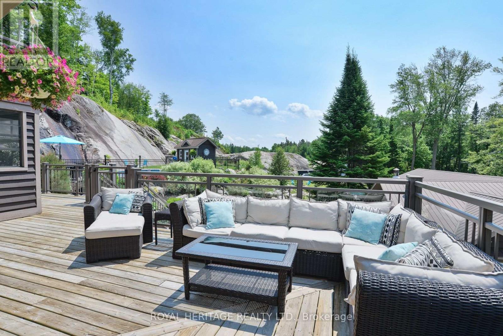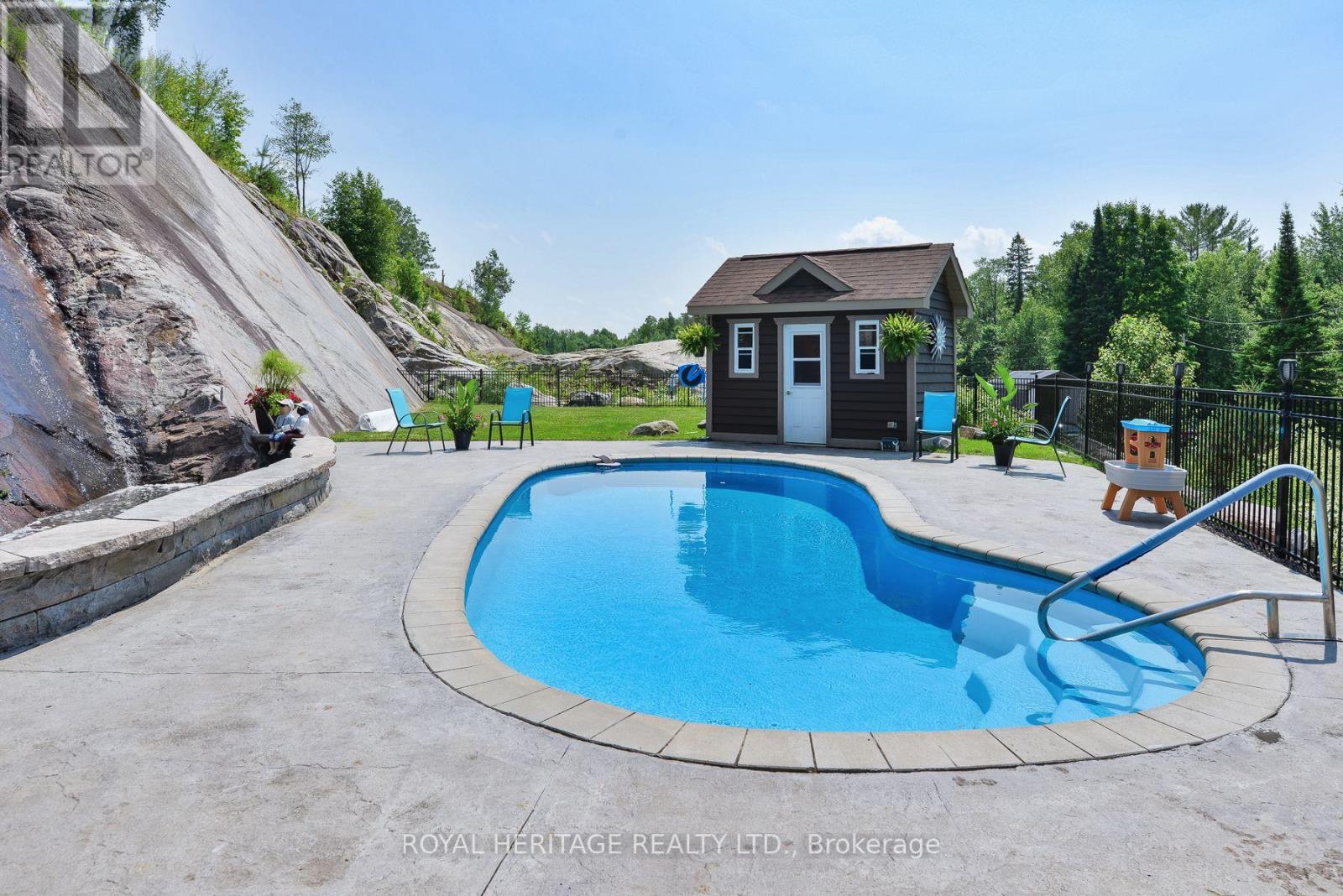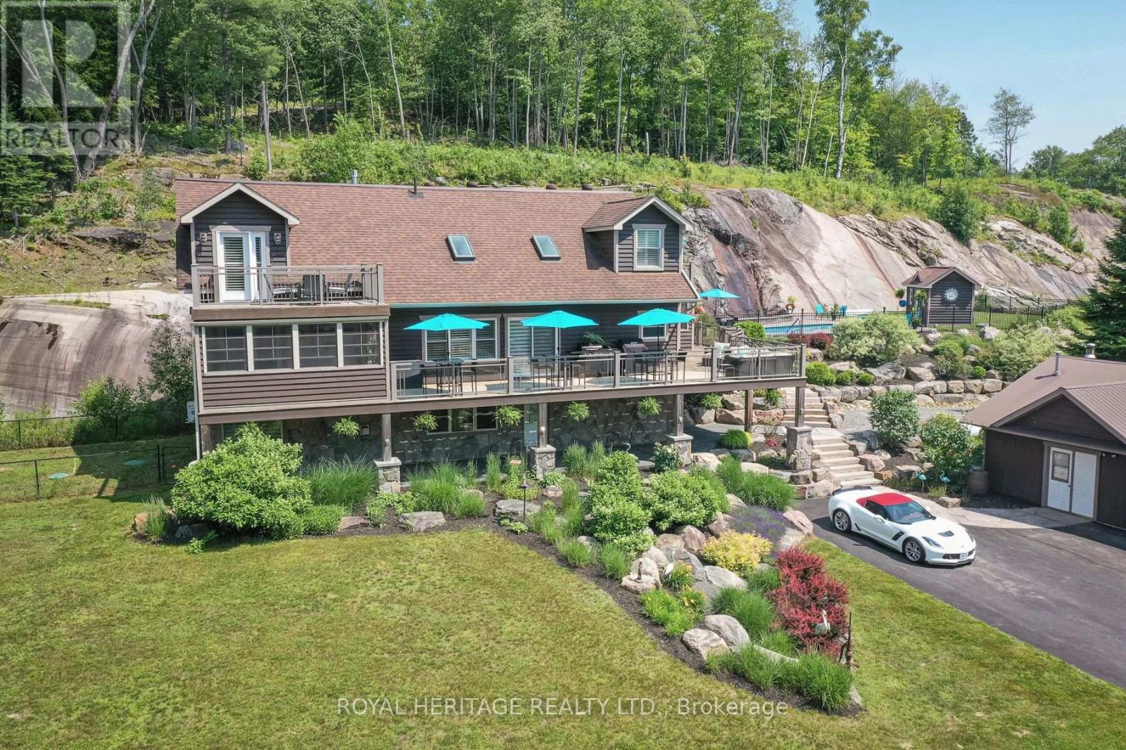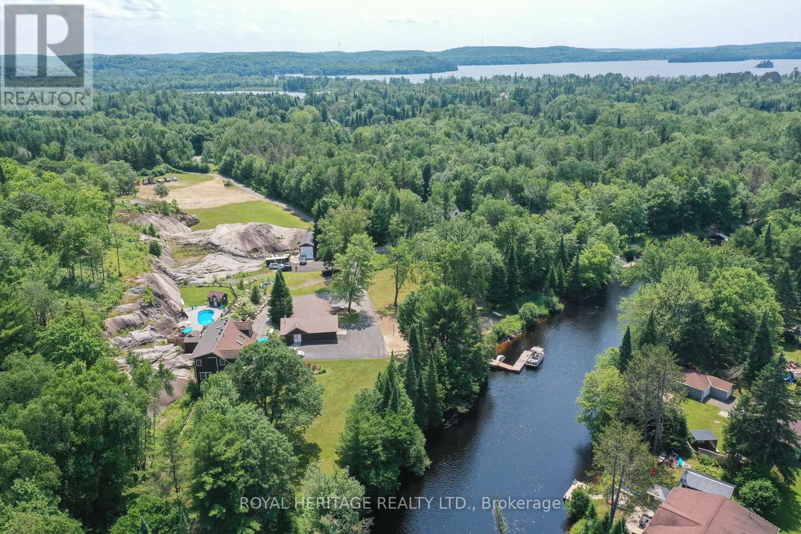 Spectacular, unique, unforgettable. These are just a few words to describe this magical, one of a kind property. Formerly featured in a Muskoka magazine, the home and property offer plenty of space for entertaining, a growing family or simply reconnecting with nature and wildlife. Design elements, including local Muskoka granite picked and split by the owners hand and built into the feature wall and kitchen island, all help to create a space that welcomes you from its front gates to its front door and beyond. Soaring vaulted ceilings and architectural beams in the main living area and primary bedroom, as well as a thoughtfully redesigned interior created during the building of a significant addition completed in 2016, provided the owner and designer an opportunity to create a spacious, interesting yet functional space. Breathtaking views from numerous balconies, windows and patios overlook the grounds, gardens, 30ft waterfall and approx. 500 ft of Mother Natures perfect river front. The in-ground salt water pool, tiki bar, infrared sauna, built in hot tub, large gym, theatre room, ball court, sandy beach with gentle water entry for swimming, dock for boating, waters edge bunkie (sleeping 4 comfortably), the huge 5 car garage, large RV shed with oil pit and even the bonfire lookout on top of the hill of your 11 acre property will afford you the last ray of sunshine with the setting sun to complete your daily living experience. Should you ever wish to leave your property, you are just a few short minutes to the heart of Huntsville by car and a short boat ride along the river to Lake Vernon and further access to Fairy, Mary and Peninsula Lakes. Pictures may speak a thousand words but this property has thousands more to share with you in person. Private showings only. (id:56991)