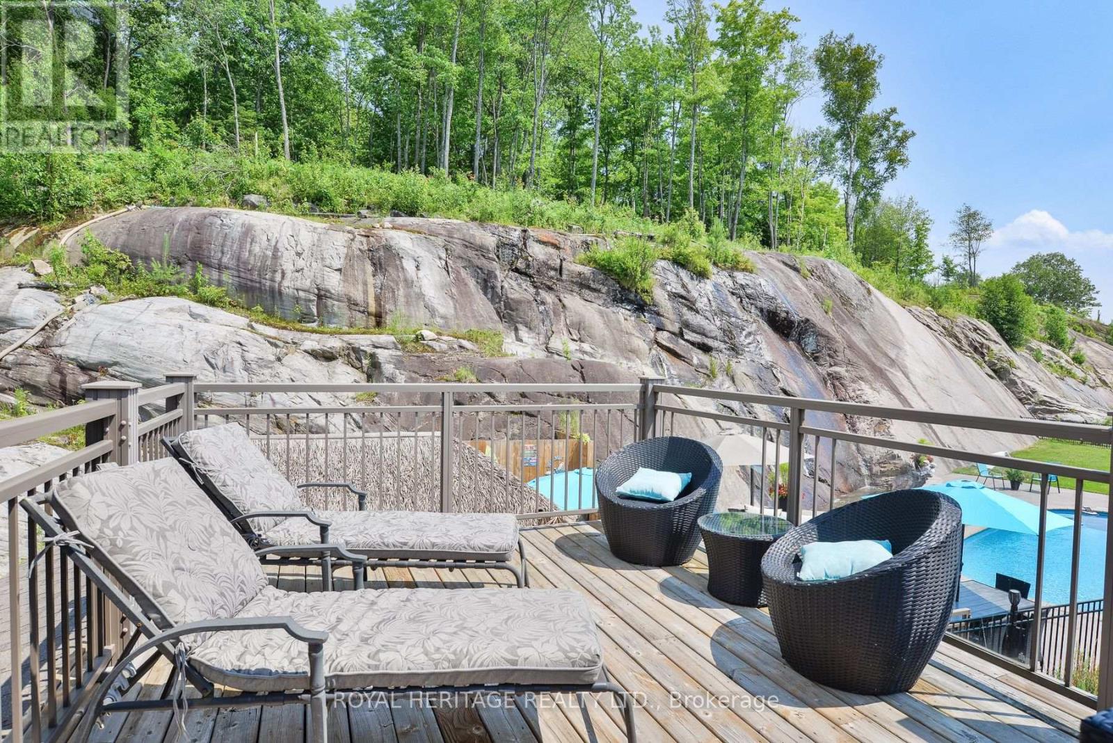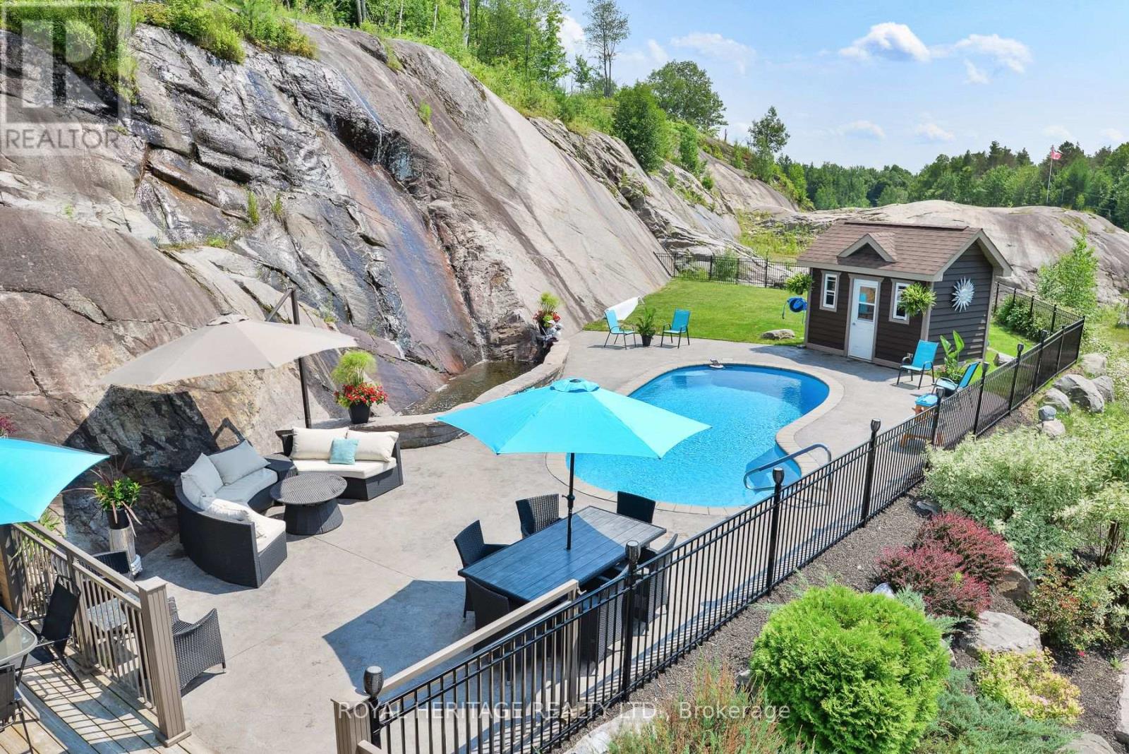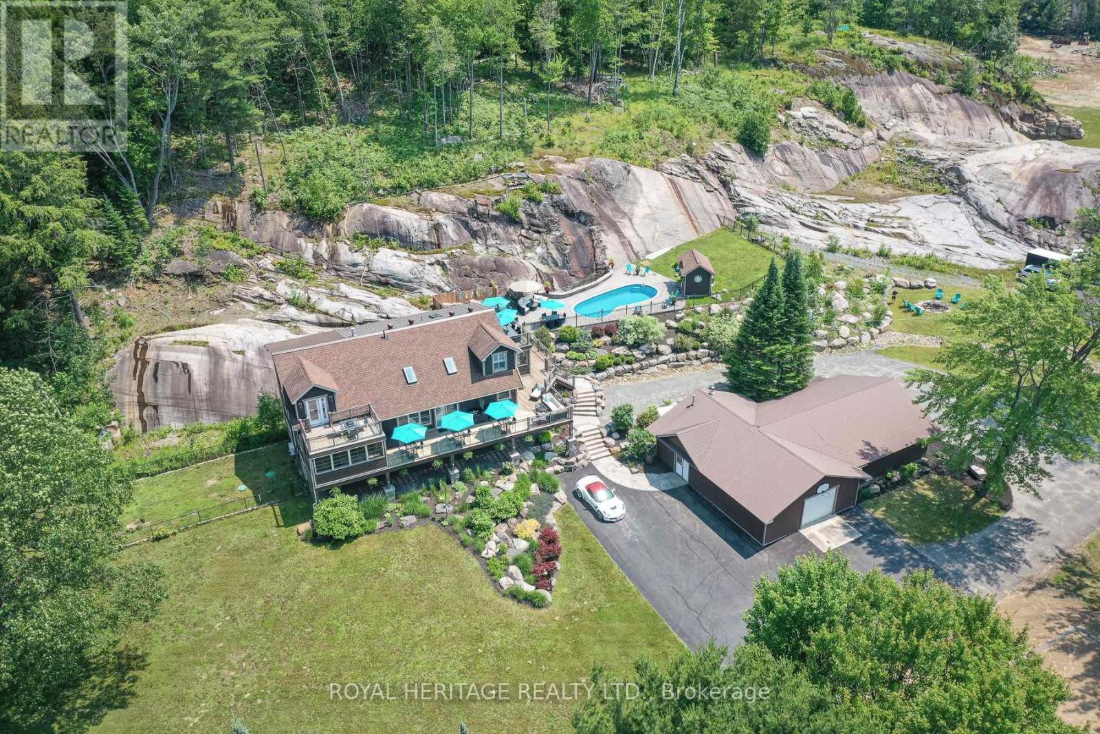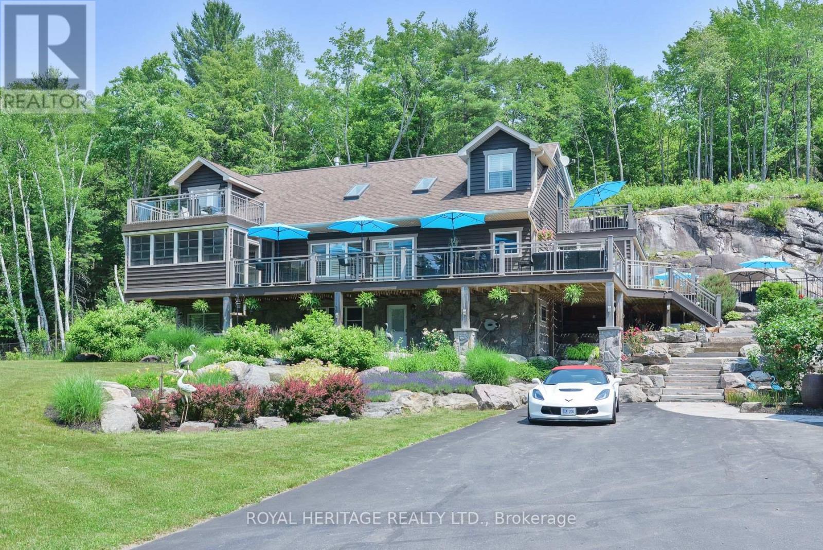 Spectacular, unique, unforgettable. These are just a few words to describe this magical, one of a kind property. Formerly featured in a Muskoka magazine, the home and property offer plenty of space for entertaining, a growing family or simply reconnecting with nature and wildlife. Design elements, including local Muskoka granite picked and split by the owners hand and built into the feature wall and kitchen island, all help to create a space that welcomes you from its front gates to its front door and beyond. Soaring vaulted ceilings and architectural beams in the main living area and primary bedroom, as well as a thoughtfully redesigned interior created during the building of a significant addition completed in 2016, provided the owner and designer an opportunity to create a spacious, interesting yet functional space. Breathtaking views from numerous balconies, windows and patios overlook the grounds, gardens, 30ft waterfall and approx. 500 ft of Mother Natures perfect river front. The in-ground salt water pool, tiki bar, infrared sauna, built in hot tub, large gym, theatre room, ball court, sandy beach with gentle water entry for swimming, dock for boating, waters edge bunkie (sleeping 4 comfortably), the huge 5 car garage, large RV shed with oil pit and even the bonfire lookout on top of the hill of your 11 acre property will afford you the last ray of sunshine with the setting sun to complete your daily living experience. Should you ever wish to leave your property, you are just a few short minutes to the heart of Huntsville by car and a short boat ride along the river to Lake Vernon and further access to Fairy, Mary and Peninsula Lakes. Pictures may speak a thousand words but this property has thousands more to share with you in person. Private showings only. (id:56991)