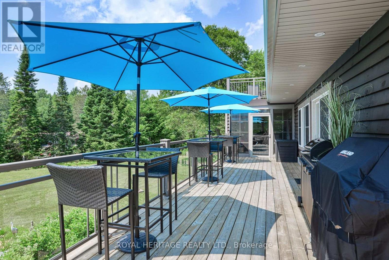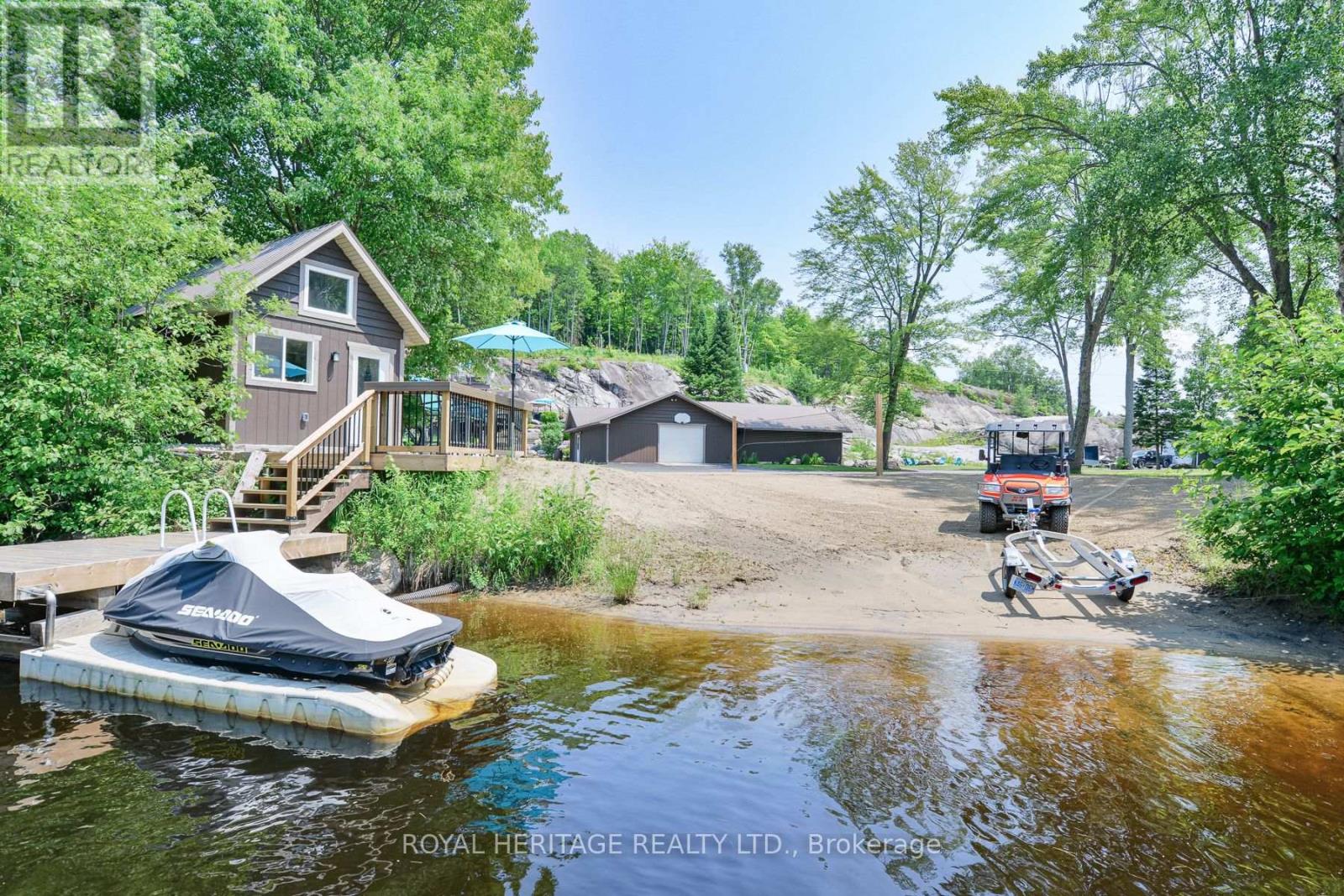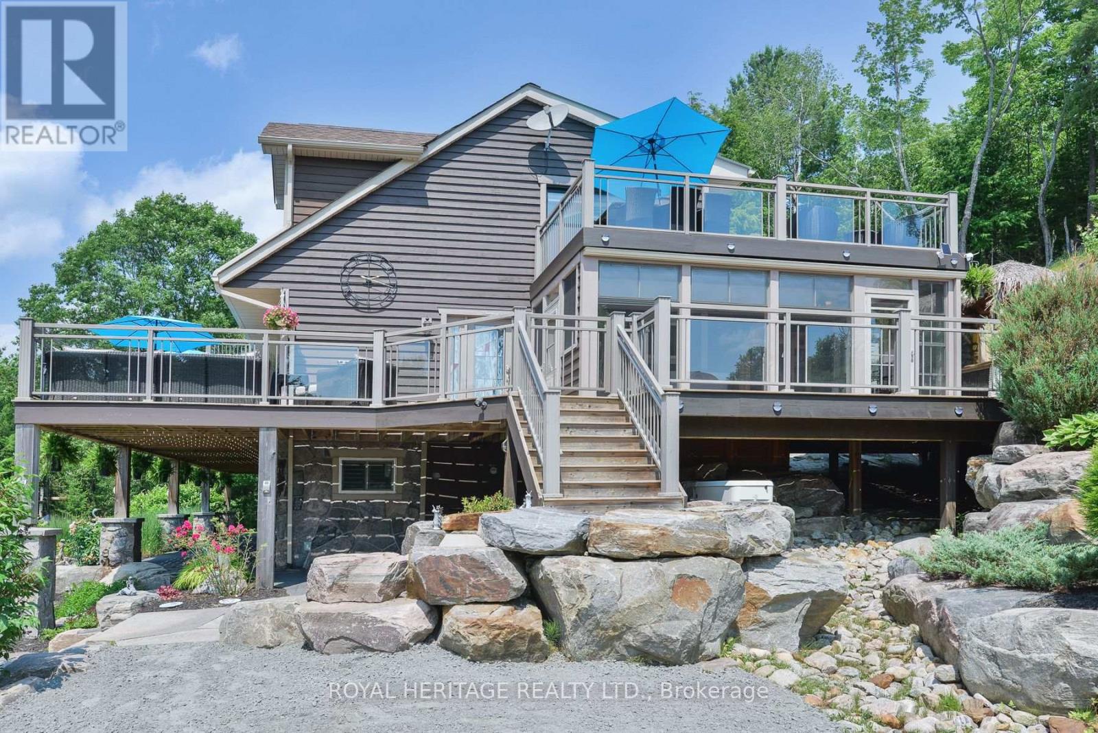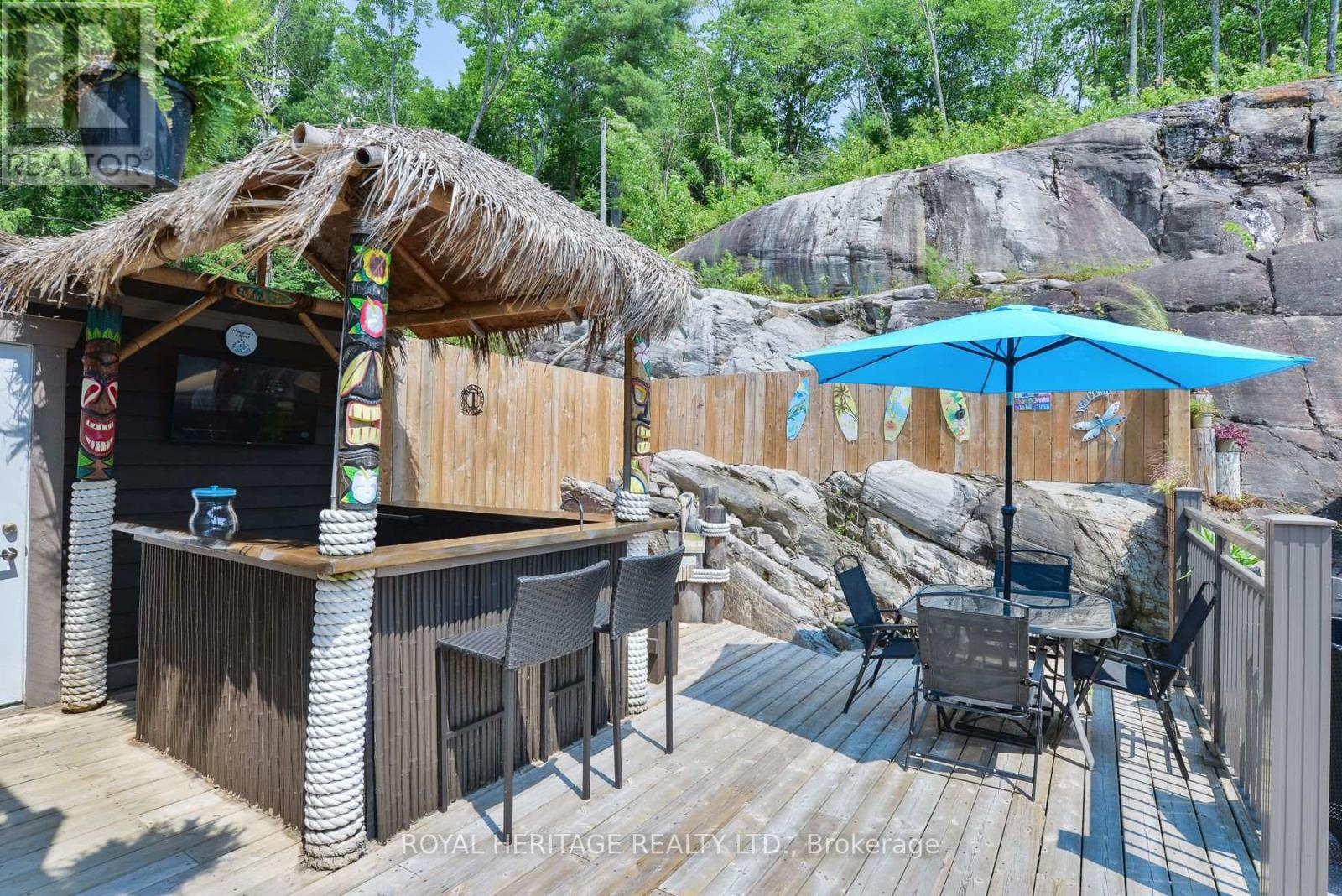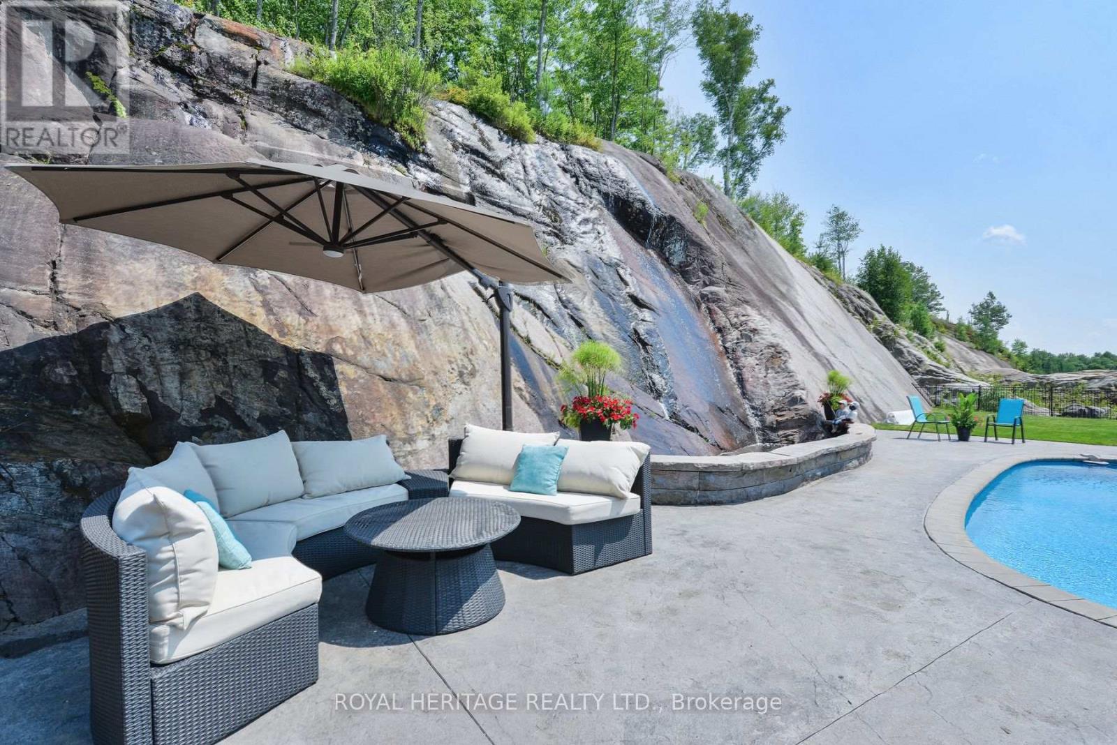 Spectacular, unique, unforgettable. These are just a few words to describe this magical, one of a kind property. Formerly featured in a Muskoka magazine, the home and property offer plenty of space for entertaining, a growing family or simply reconnecting with nature and wildlife. Design elements, including local Muskoka granite picked and split by the owners hand and built into the feature wall and kitchen island, all help to create a space that welcomes you from its front gates to its front door and beyond. Soaring vaulted ceilings and architectural beams in the main living area and primary bedroom, as well as a thoughtfully redesigned interior created during the building of a significant addition completed in 2016, provided the owner and designer an opportunity to create a spacious, interesting yet functional space. Breathtaking views from numerous balconies, windows and patios overlook the grounds, gardens, 30ft waterfall and approx. 500 ft of Mother Natures perfect river front. The in-ground salt water pool, tiki bar, infrared sauna, built in hot tub, large gym, theatre room, ball court, sandy beach with gentle water entry for swimming, dock for boating, waters edge bunkie (sleeping 4 comfortably), the huge 5 car garage, large RV shed with oil pit and even the bonfire lookout on top of the hill of your 11 acre property will afford you the last ray of sunshine with the setting sun to complete your daily living experience. Should you ever wish to leave your property, you are just a few short minutes to the heart of Huntsville by car and a short boat ride along the river to Lake Vernon and further access to Fairy, Mary and Peninsula Lakes. Pictures may speak a thousand words but this property has thousands more to share with you in person. Private showings only. (id:56991)
