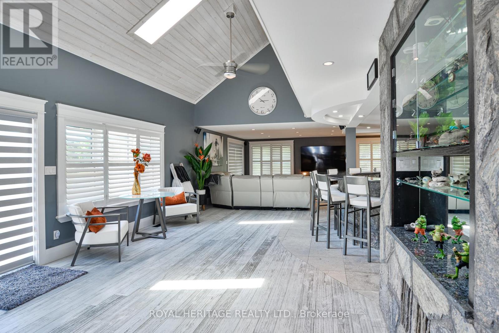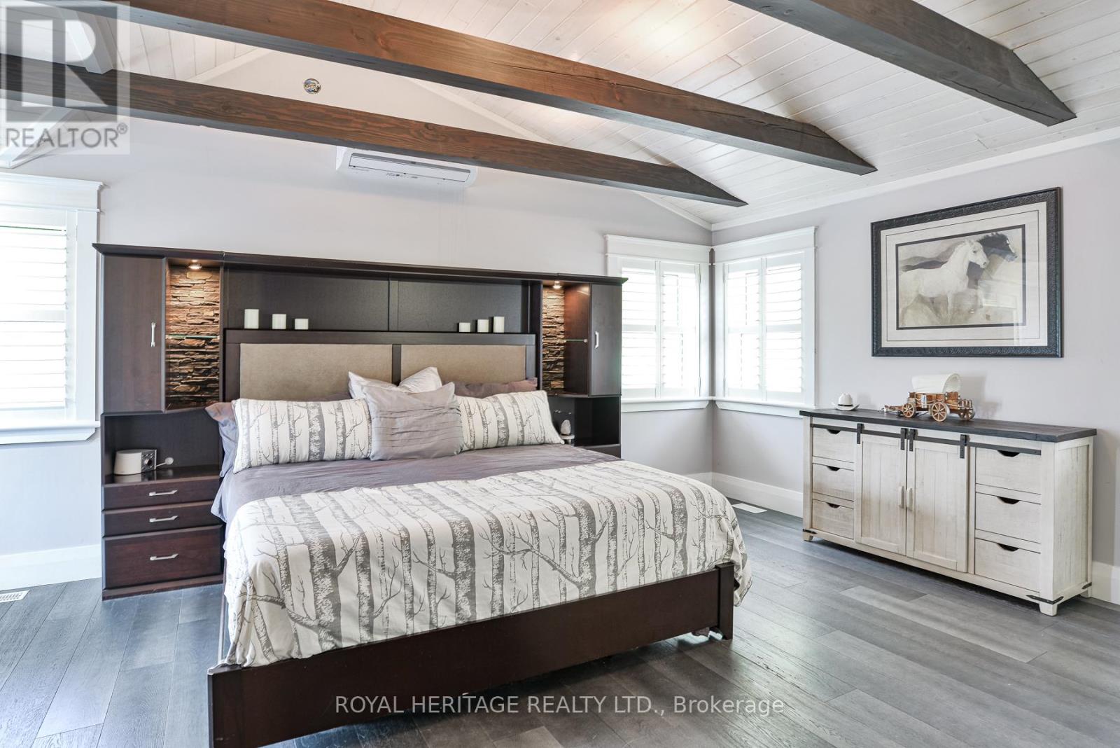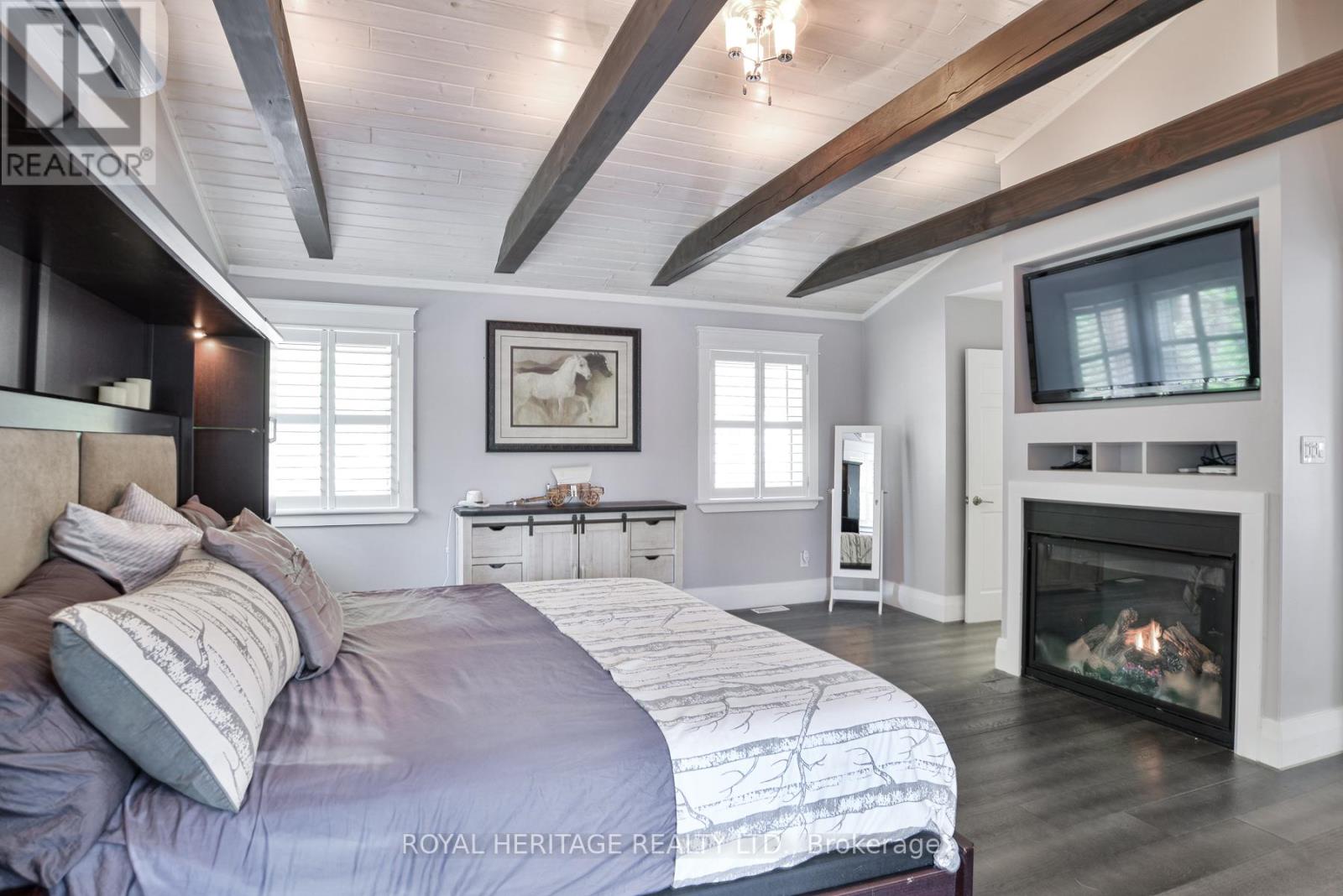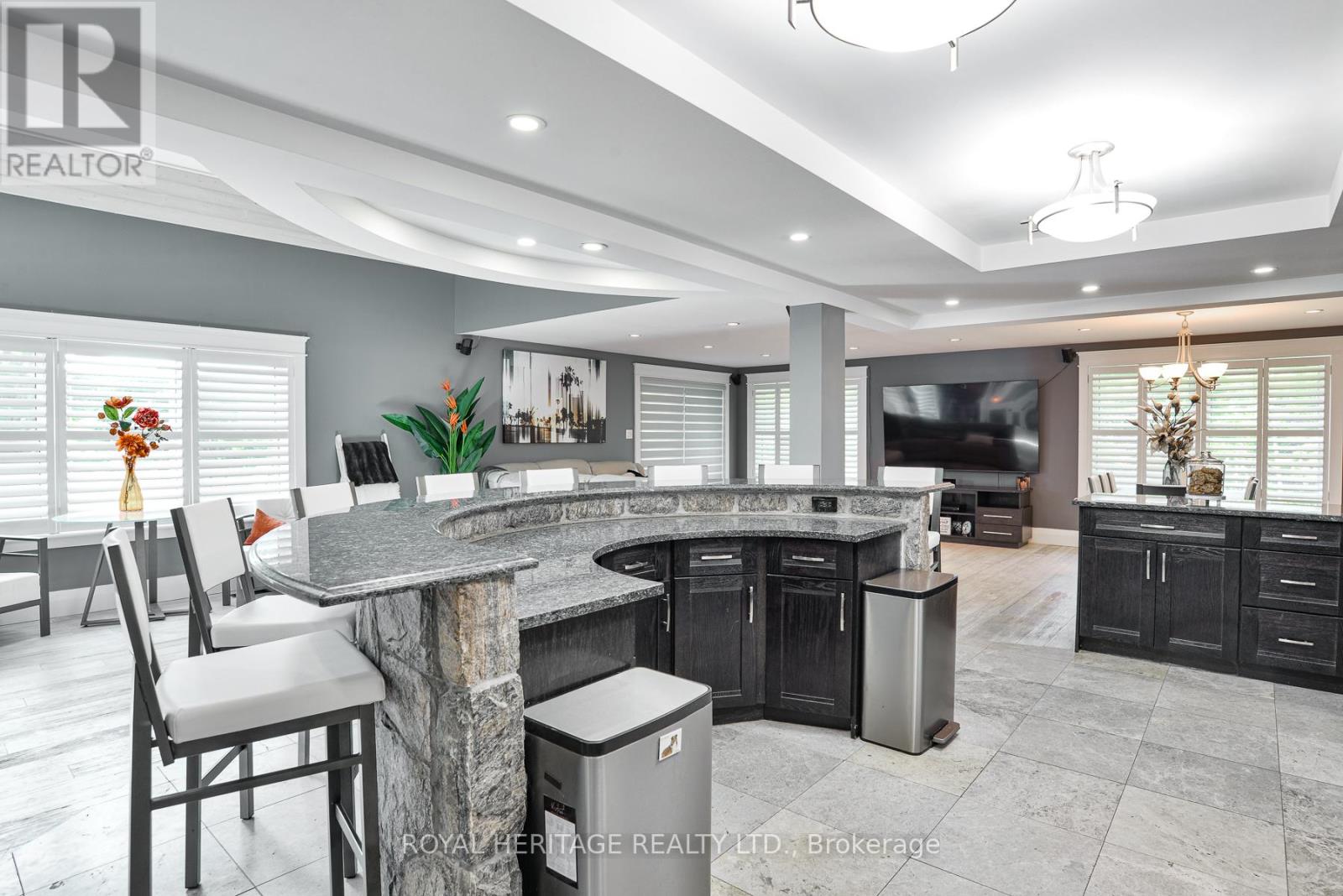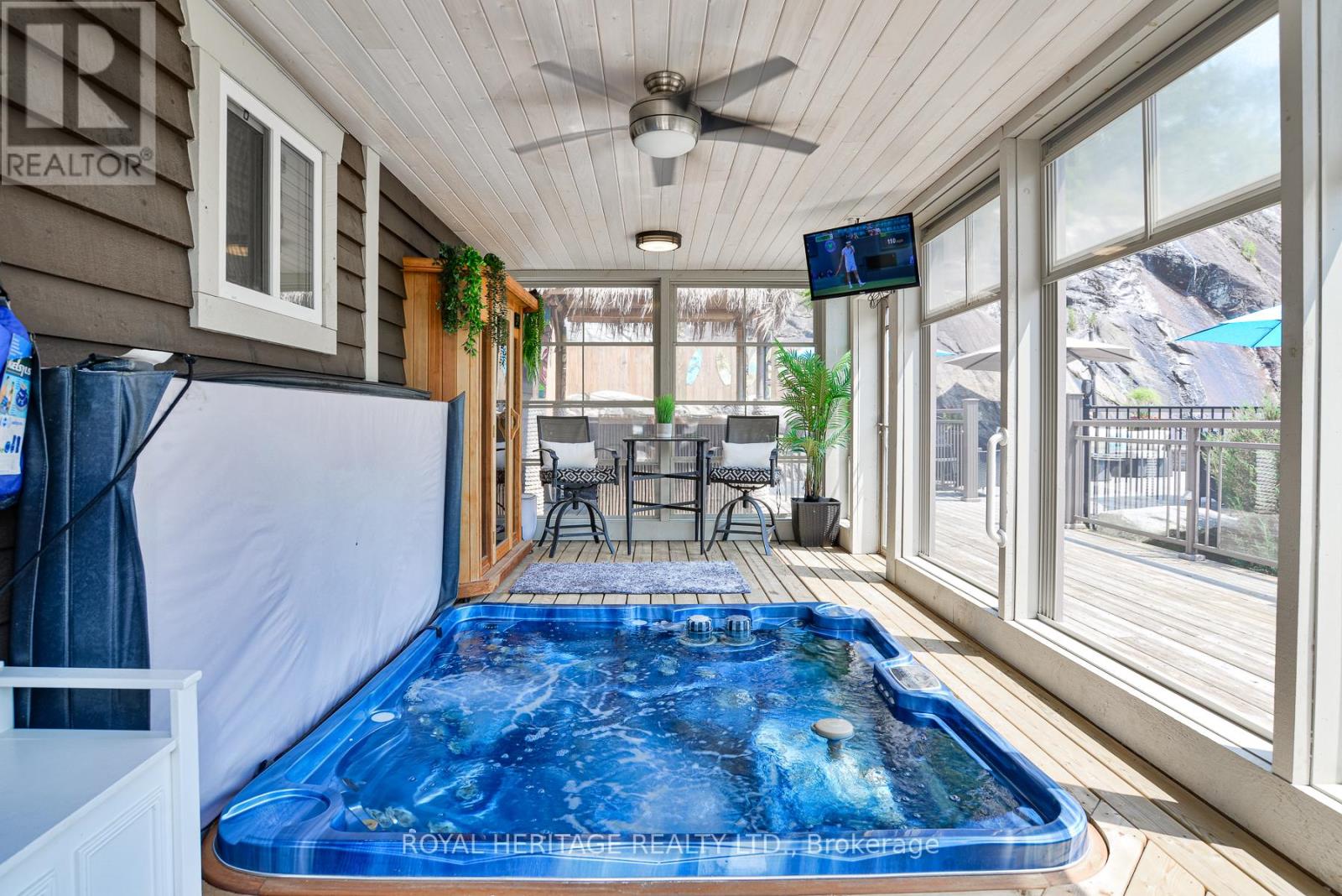 Spectacular, unique, unforgettable. These are just a few words to describe this magical, one of a kind property. Formerly featured in a Muskoka magazine, the home and property offer plenty of space for entertaining, a growing family or simply reconnecting with nature and wildlife. Design elements, including local Muskoka granite picked and split by the owners hand and built into the feature wall and kitchen island, all help to create a space that welcomes you from its front gates to its front door and beyond. Soaring vaulted ceilings and architectural beams in the main living area and primary bedroom, as well as a thoughtfully redesigned interior created during the building of a significant addition completed in 2016, provided the owner and designer an opportunity to create a spacious, interesting yet functional space. Breathtaking views from numerous balconies, windows and patios overlook the grounds, gardens, 30ft waterfall and approx. 500 ft of Mother Natures perfect river front. The in-ground salt water pool, tiki bar, infrared sauna, built in hot tub, large gym, theatre room, ball court, sandy beach with gentle water entry for swimming, dock for boating, waters edge bunkie (sleeping 4 comfortably), the huge 5 car garage, large RV shed with oil pit and even the bonfire lookout on top of the hill of your 11 acre property will afford you the last ray of sunshine with the setting sun to complete your daily living experience. Should you ever wish to leave your property, you are just a few short minutes to the heart of Huntsville by car and a short boat ride along the river to Lake Vernon and further access to Fairy, Mary and Peninsula Lakes. Pictures may speak a thousand words but this property has thousands more to share with you in person. Private showings only. (id:56991)