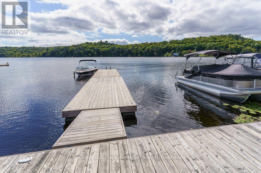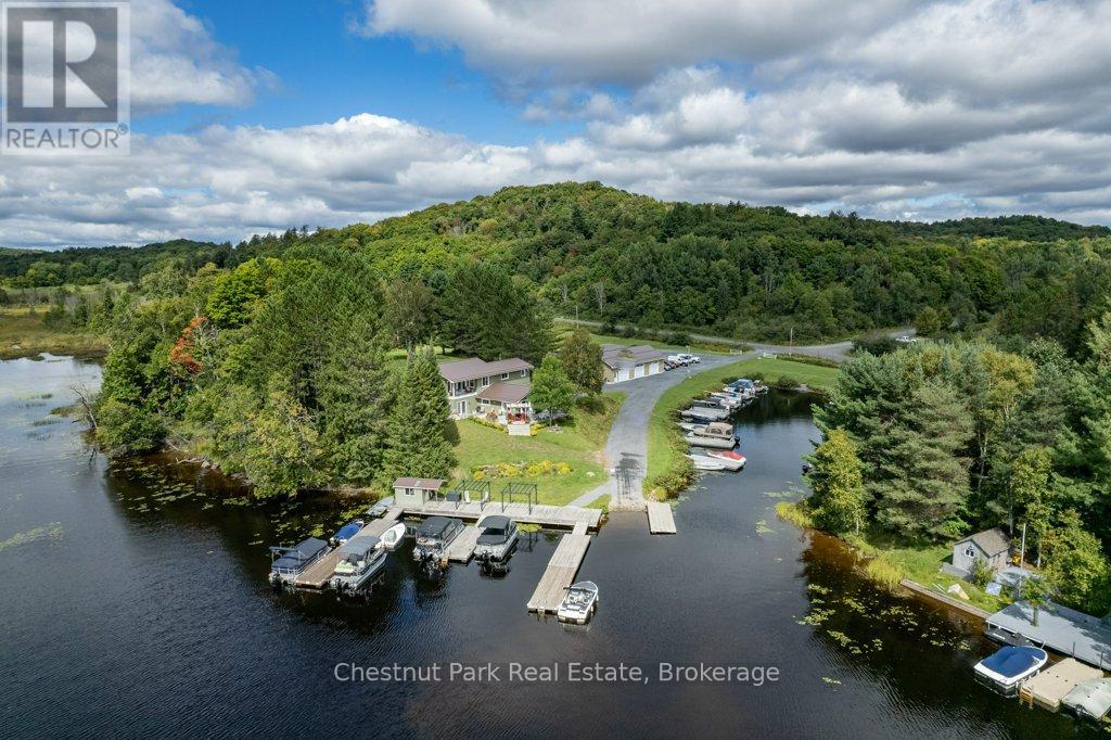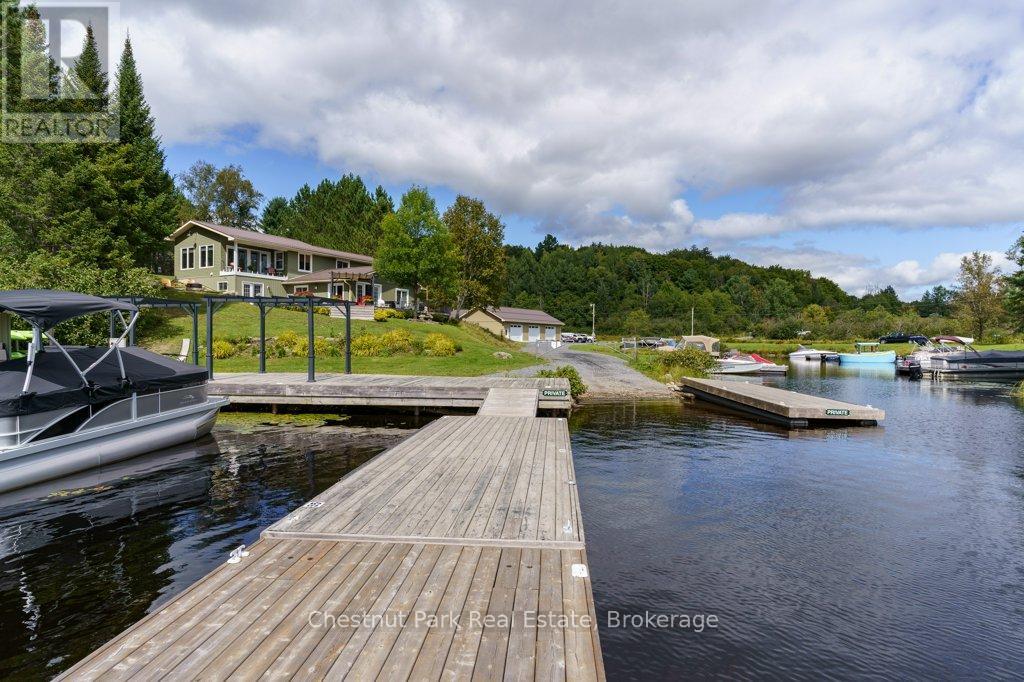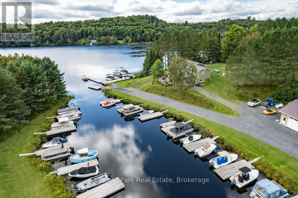 Live, Work and Play on this Commercially Zoned 5+ Acre Property situated on the popular Shores of Lake Vernon. This 5 Bedroom, 2 Bathroom year round home or cottage offers South West views and access to miles of boating on Vernon, Mary, Fairy and Peninsula. Less than 20 minutes to downtown Huntsville by car or by boat where you will find great shopping, restaurants, events and attractions. The property is zoned CS4 (Marina) which would allow for a multitude of uses including but not limited to a fully functional Marina, Outdoor Storage, Restaurants and Retail. The owner currently rents out 36 boat slips per season. The lower walkout level boasts a large living area, kitchen, dining space, bathroom and bedroom. Upper level is complete with 4 additional Bedrooms, a 4 piece Bathroom and a newly built Muskoka Room completed in 2017 with beautiful pine walls and a glass rail deck system providing spectacular lake views. Decks, patios and a stone fire pit area offer many outdoor areas to entertain friends and family. A bunkie at Lakeside offers additional sleeping and storage. 8-10 feet of clear water at end of main dock. The 3 Bay newly built 2000 square foot Garage is every car and toy enthusiasts dream with in-floor heating and tons of space for vehicles, a workshop or entertaining. The owner has created a large parking area for boat slip rental guests and remaining acreage is flat, maintained and ready for future development. Multitude of Commercial Uses. (id:56991)