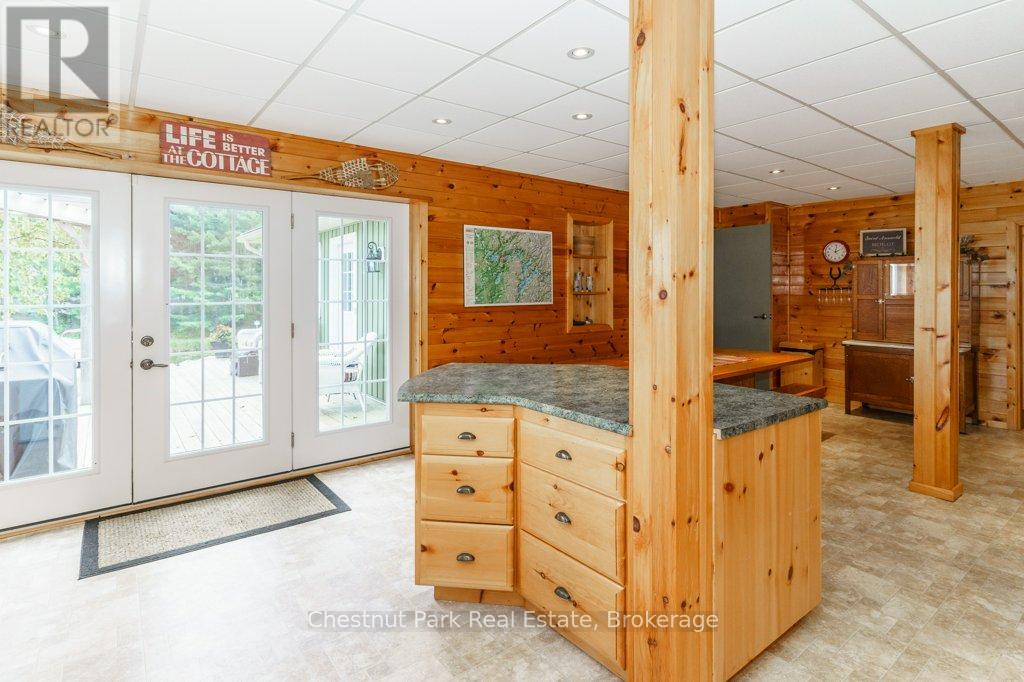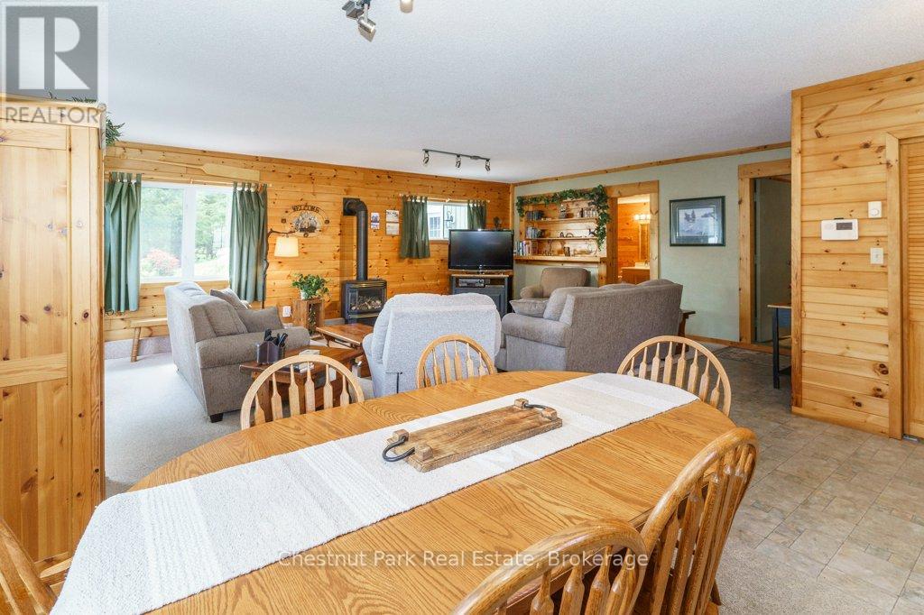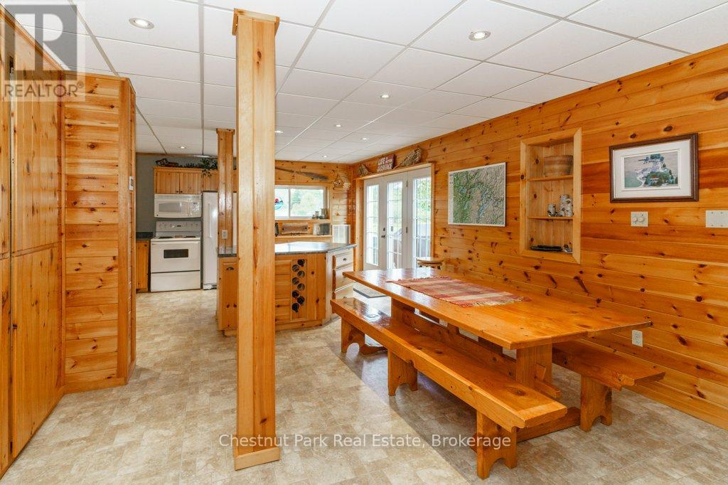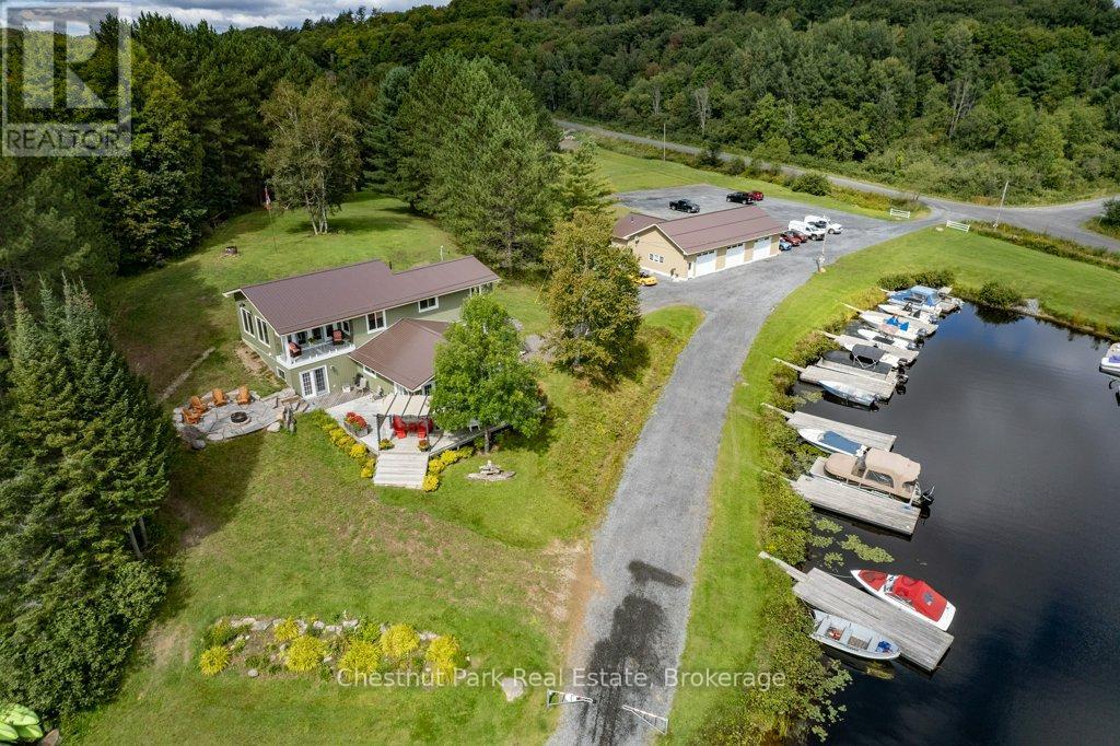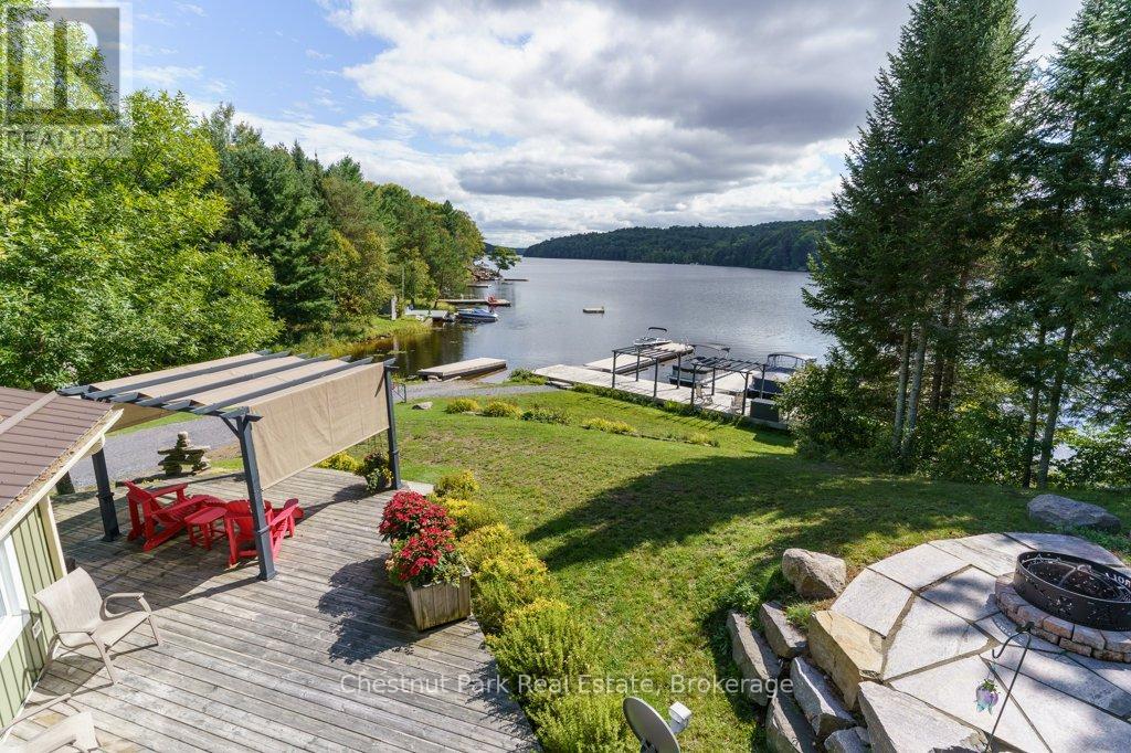 Live, Work and Play on this Commercially Zoned 5+ Acre Property situated on the popular Shores of Lake Vernon. This 5 Bedroom, 2 Bathroom year round home or cottage offers South West views and access to miles of boating on Vernon, Mary, Fairy and Peninsula. Less than 20 minutes to downtown Huntsville by car or by boat where you will find great shopping, restaurants, events and attractions. The property is zoned CS4 (Marina) which would allow for a multitude of uses including but not limited to a fully functional Marina, Outdoor Storage, Restaurants and Retail. The owner currently rents out 36 boat slips per season. The lower walkout level boasts a large living area, kitchen, dining space, bathroom and bedroom. Upper level is complete with 4 additional Bedrooms, a 4 piece Bathroom and a newly built Muskoka Room completed in 2017 with beautiful pine walls and a glass rail deck system providing spectacular lake views. Decks, patios and a stone fire pit area offer many outdoor areas to entertain friends and family. A bunkie at Lakeside offers additional sleeping and storage. 8-10 feet of clear water at end of main dock. The 3 Bay newly built 2000 square foot Garage is every car and toy enthusiasts dream with in-floor heating and tons of space for vehicles, a workshop or entertaining. The owner has created a large parking area for boat slip rental guests and remaining acreage is flat, maintained and ready for future development. Multitude of Commercial Uses. (id:56991)