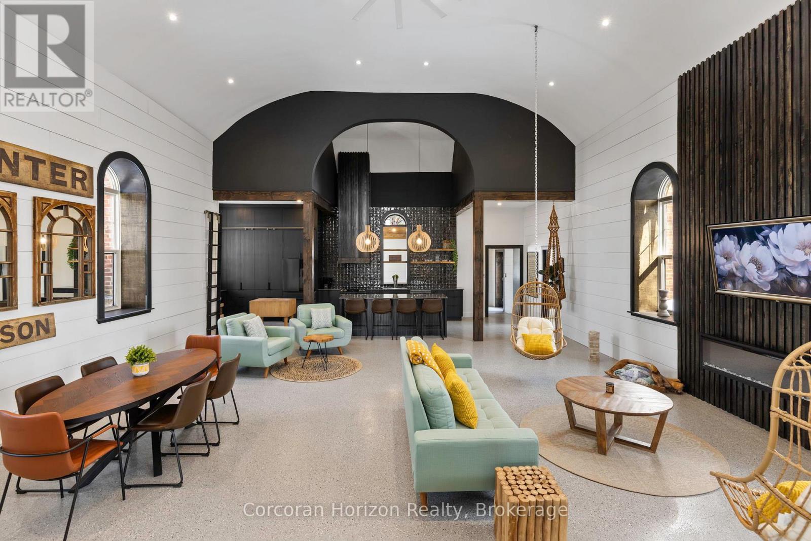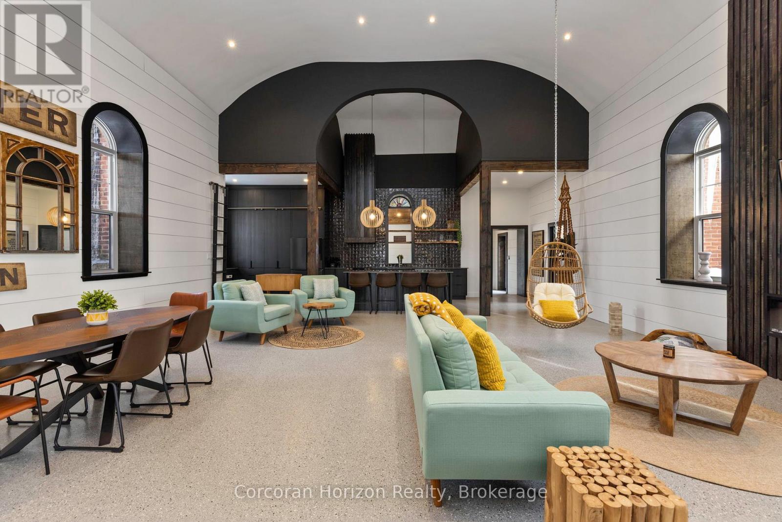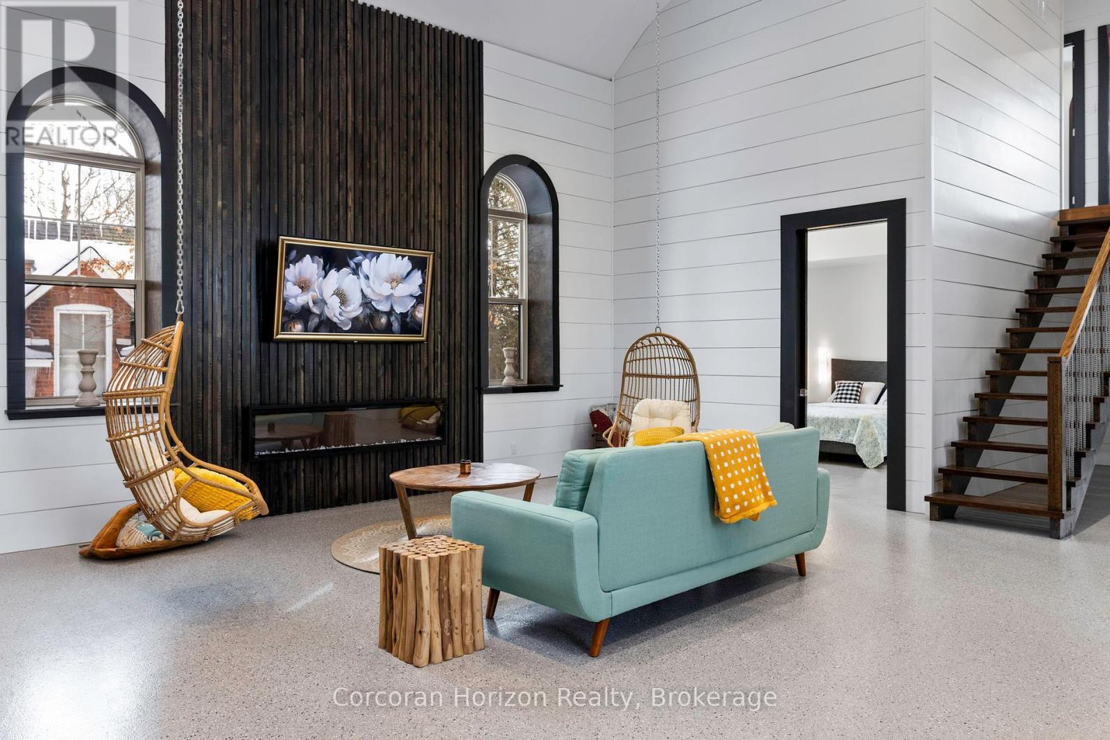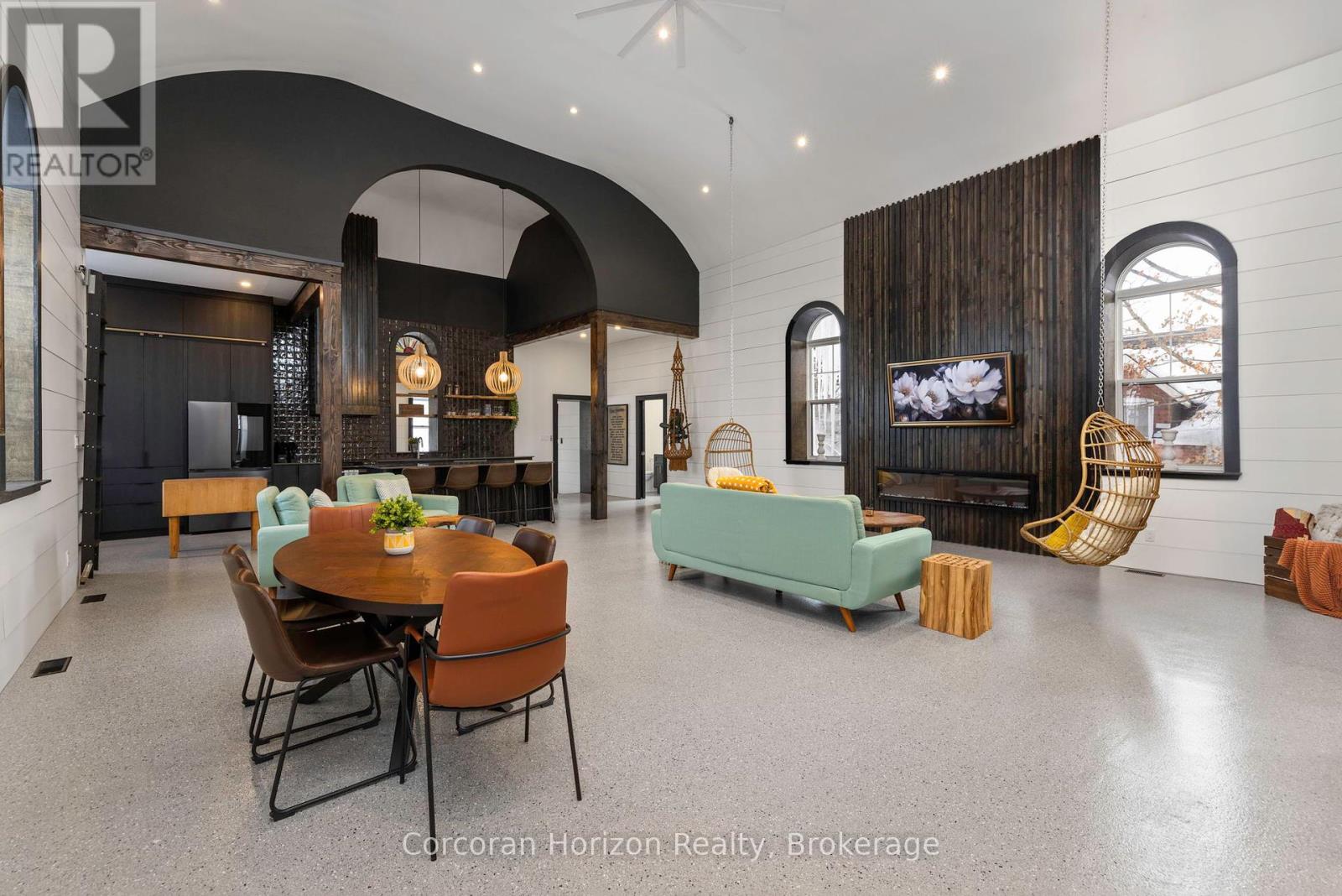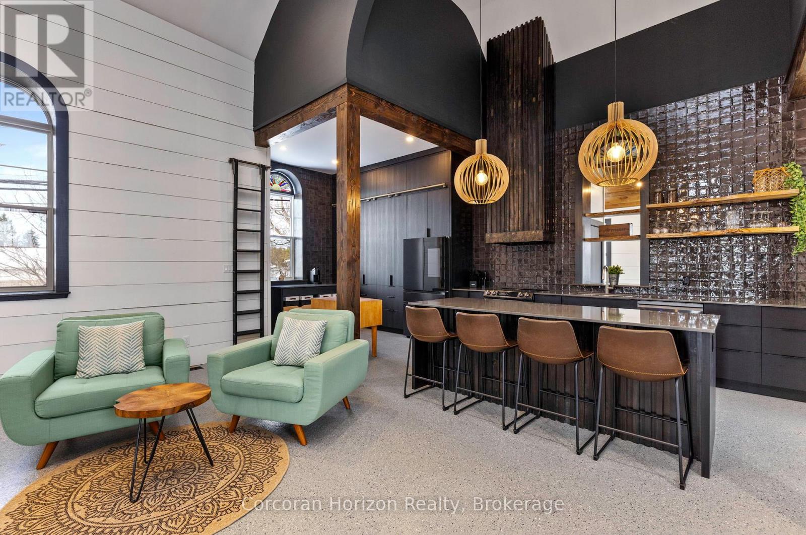 Step into a one-of-a-kind home that seamlessly blends historic charm with contemporary elegance. Originally built in 1886, this meticulously restored church has been transformed from the studs out into a breathtaking home, rich with architectural details that honour its past while embracing modern luxury and design. As you enter the foyer, reclaimed wood from the original church floors sets a warm, welcoming tone. An elegant staircase leads you to an open-concept living space across the second level. Here you will find an expansive living room with soaring 17.5ft barrel vaulted ceilings and an electric fireplace, creating an atmosphere of grandeur and comfort. The sophisticated, dark-toned kitchen is a chefs dream, featuring premium appliances, floor-to-ceiling cabinetry and a custom-built ladder. Thoughtfully designed, the second level features the primary bedroom, complete with a walk-in closet lined with cedar planks, alongside three stylish bathrooms. On the third level, two large bedrooms bathed in natural light provide serene retreats. Meanwhile, the first level offers a wealth of possibilities, additional living space, two bedrooms, ample storage, and a 4-piece bathroom. A roughed-in kitchen adds potential for a separate suite, multigenerational living, or even the possibility of conversion into a duplex. This home is a treasure trove of unique details, from stained glass transformed into window art within the original arch frames to Mennonite-crafted shiplap accents that add warmth and character. The exterior stone and brick have been professionally restored, while a second entrance at the rear enhances both its beauty and functionality. Beyond its timeless charm, this home offers complete modern convenience--all plumbing, HVAC, and electrical systems have been entirely replaced, ensuring efficiency & peace of mind for years to come. Experience the timeless beauty of this property, where craftsmanship, history, & modern elegance converge in perfect harmony. (id:56991)