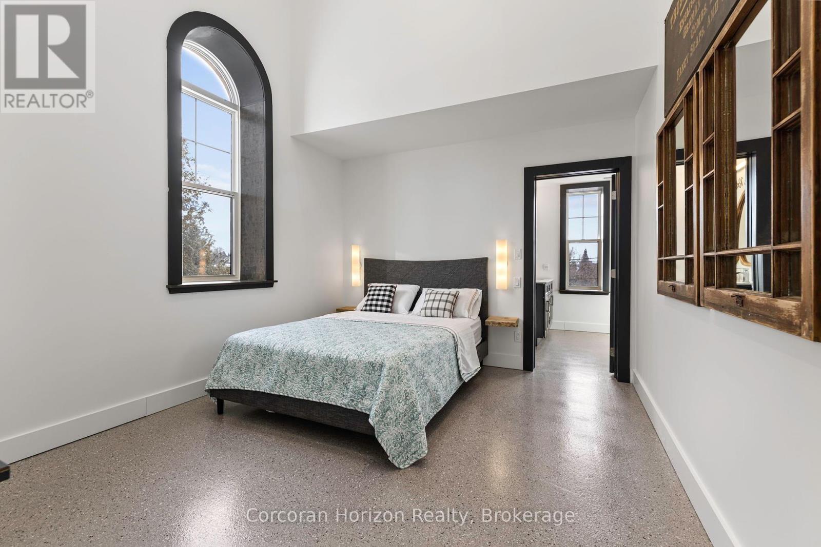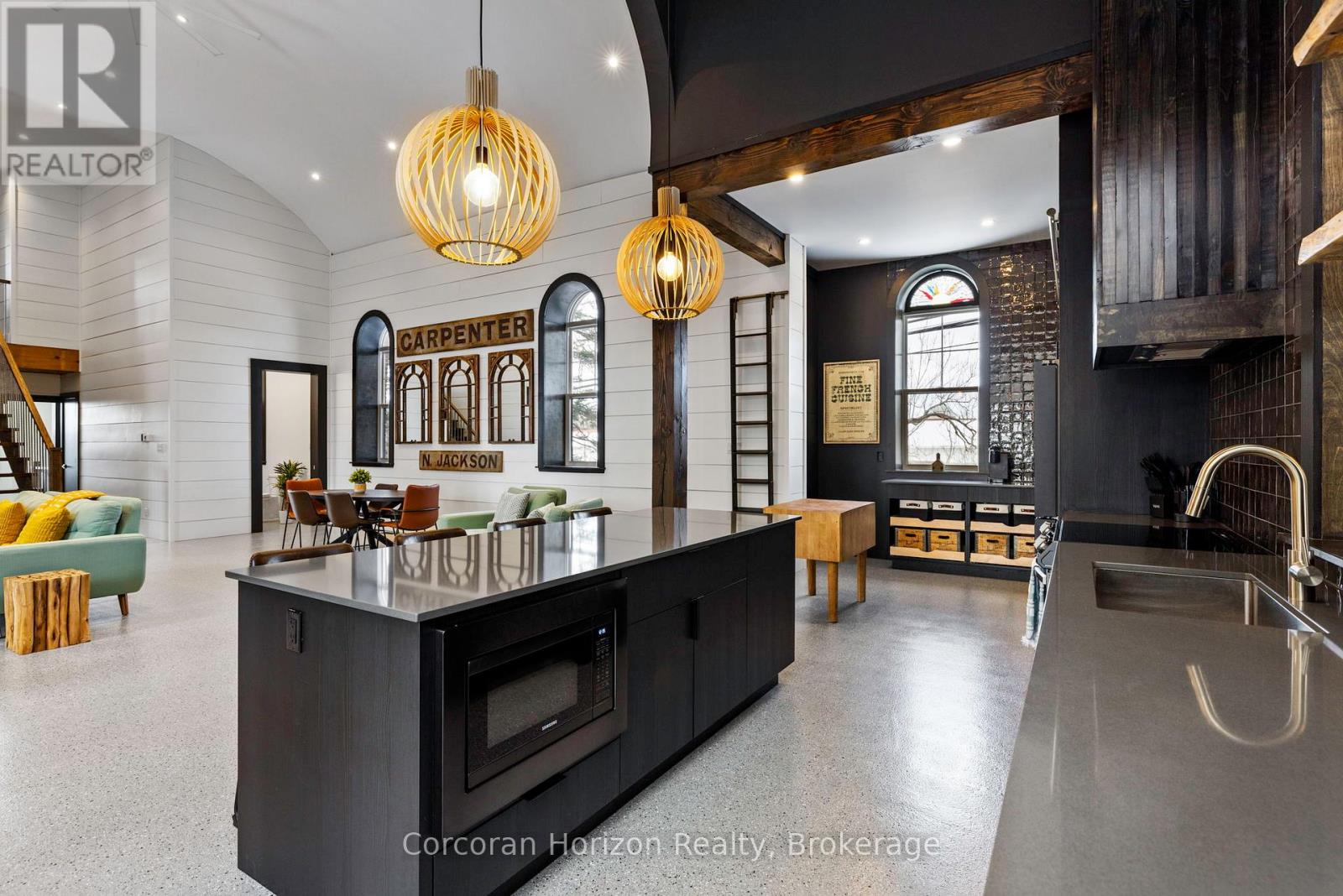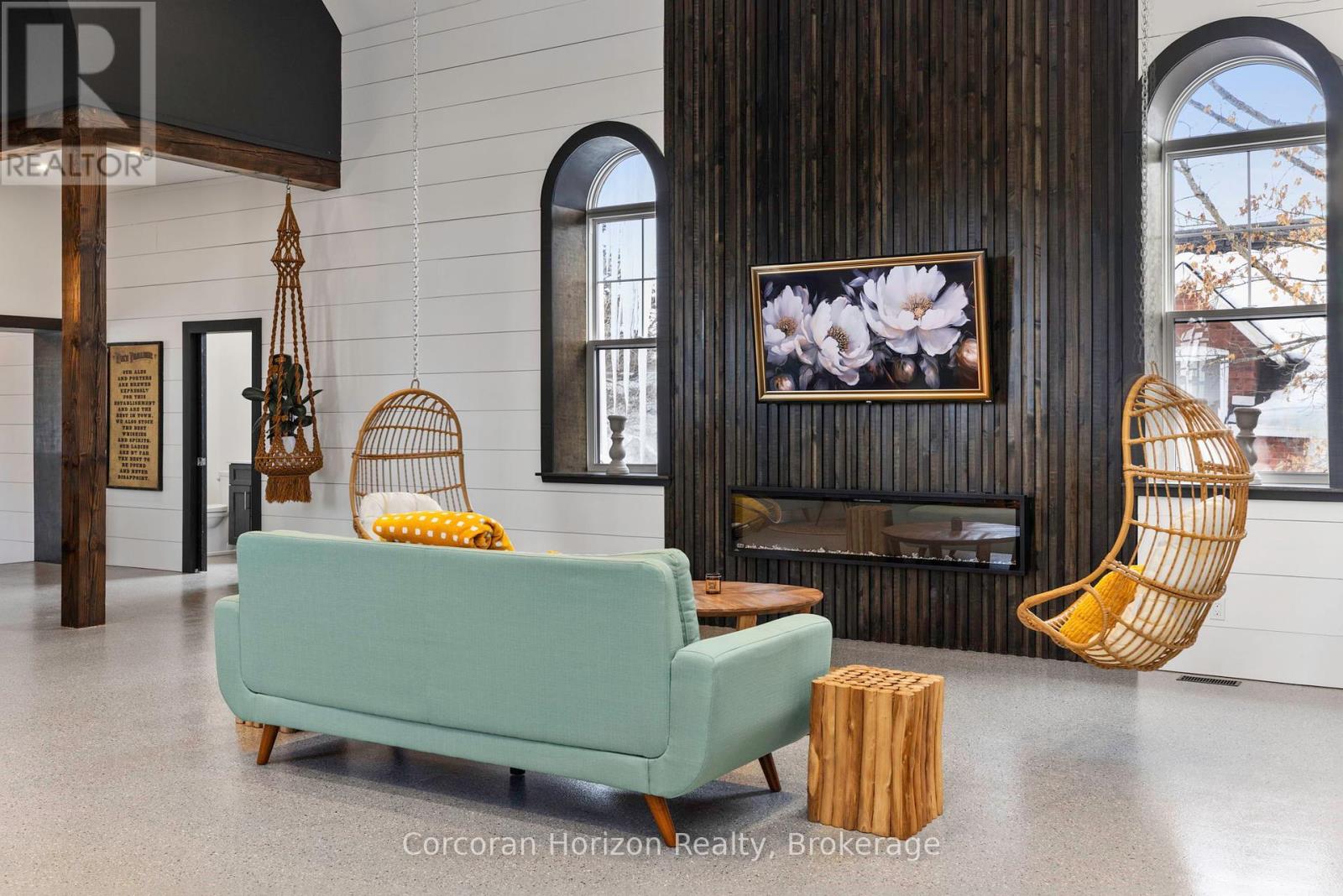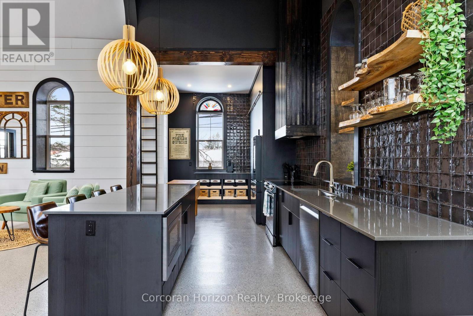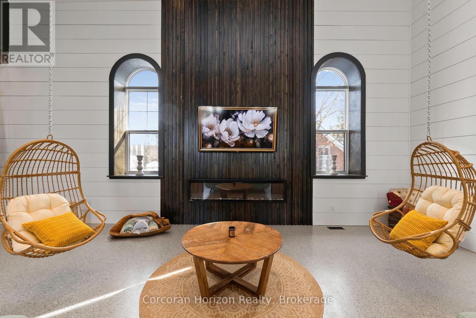 Step into a one-of-a-kind home that seamlessly blends historic charm with contemporary elegance. Originally built in 1886, this meticulously restored church has been transformed from the studs out into a breathtaking home, rich with architectural details that honour its past while embracing modern luxury and design. As you enter the foyer, reclaimed wood from the original church floors sets a warm, welcoming tone. An elegant staircase leads you to an open-concept living space across the second level. Here you will find an expansive living room with soaring 17.5ft barrel vaulted ceilings and an electric fireplace, creating an atmosphere of grandeur and comfort. The sophisticated, dark-toned kitchen is a chefs dream, featuring premium appliances, floor-to-ceiling cabinetry and a custom-built ladder. Thoughtfully designed, the second level features the primary bedroom, complete with a walk-in closet lined with cedar planks, alongside three stylish bathrooms. On the third level, two large bedrooms bathed in natural light provide serene retreats. Meanwhile, the first level offers a wealth of possibilities, additional living space, two bedrooms, ample storage, and a 4-piece bathroom. A roughed-in kitchen adds potential for a separate suite, multigenerational living, or even the possibility of conversion into a duplex. This home is a treasure trove of unique details, from stained glass transformed into window art within the original arch frames to Mennonite-crafted shiplap accents that add warmth and character. The exterior stone and brick have been professionally restored, while a second entrance at the rear enhances both its beauty and functionality. Beyond its timeless charm, this home offers complete modern convenience--all plumbing, HVAC, and electrical systems have been entirely replaced, ensuring efficiency & peace of mind for years to come. Experience the timeless beauty of this property, where craftsmanship, history, & modern elegance converge in perfect harmony. (id:56991)