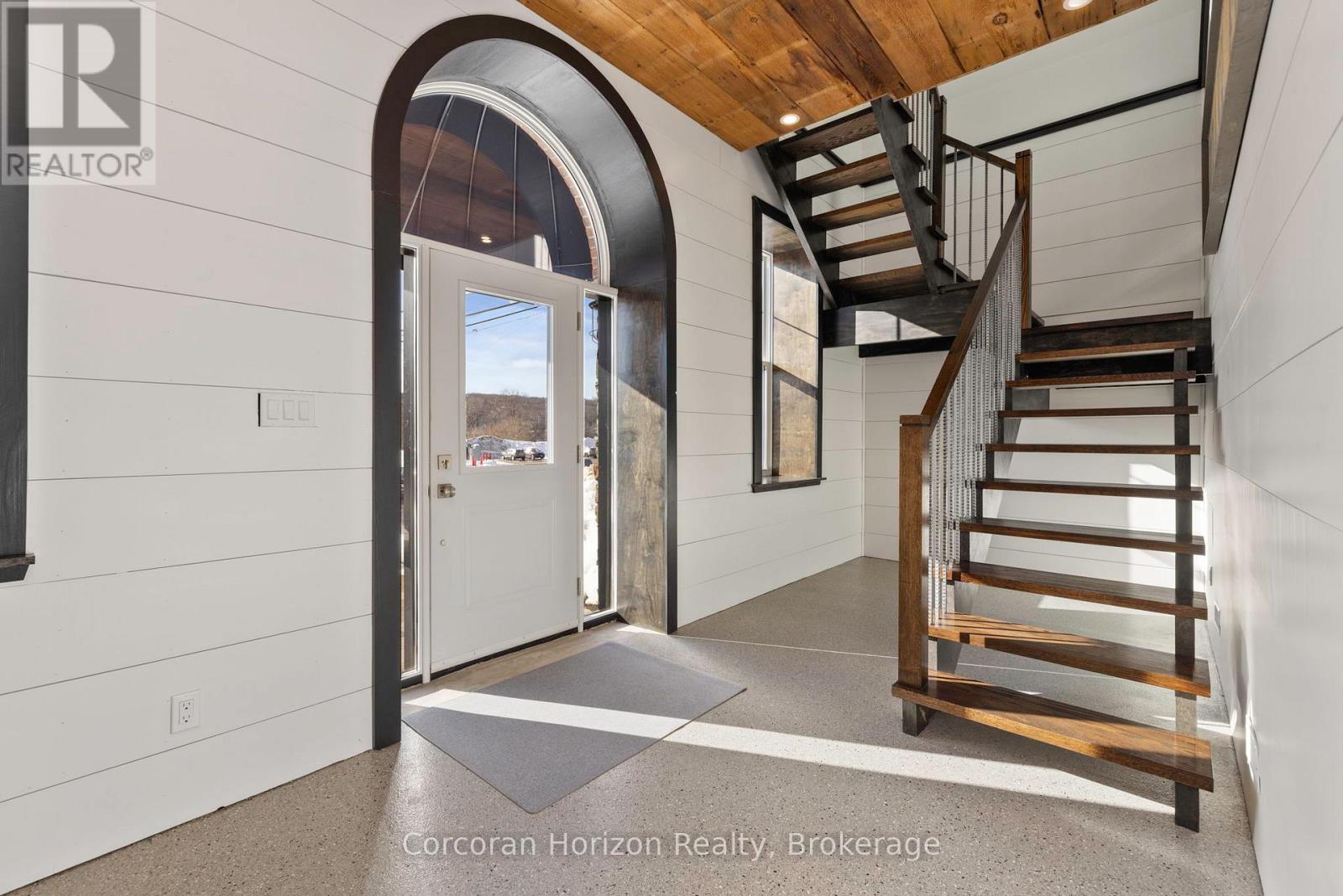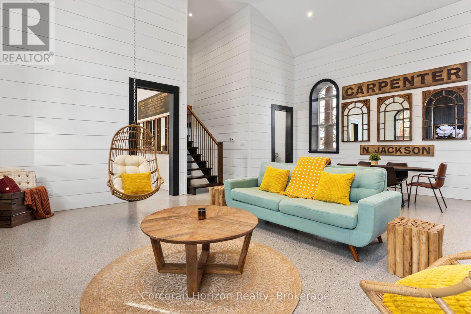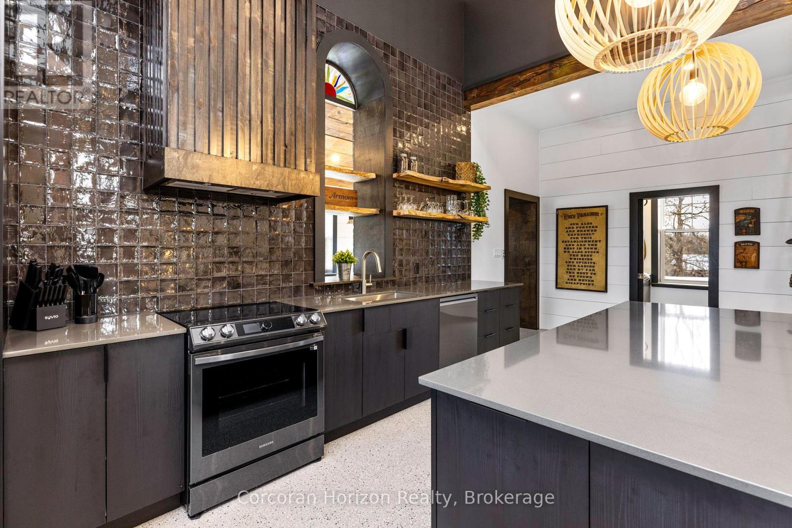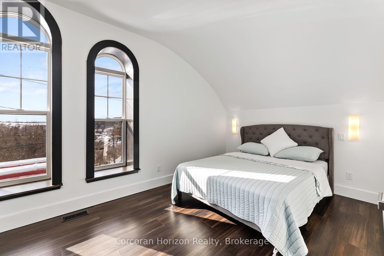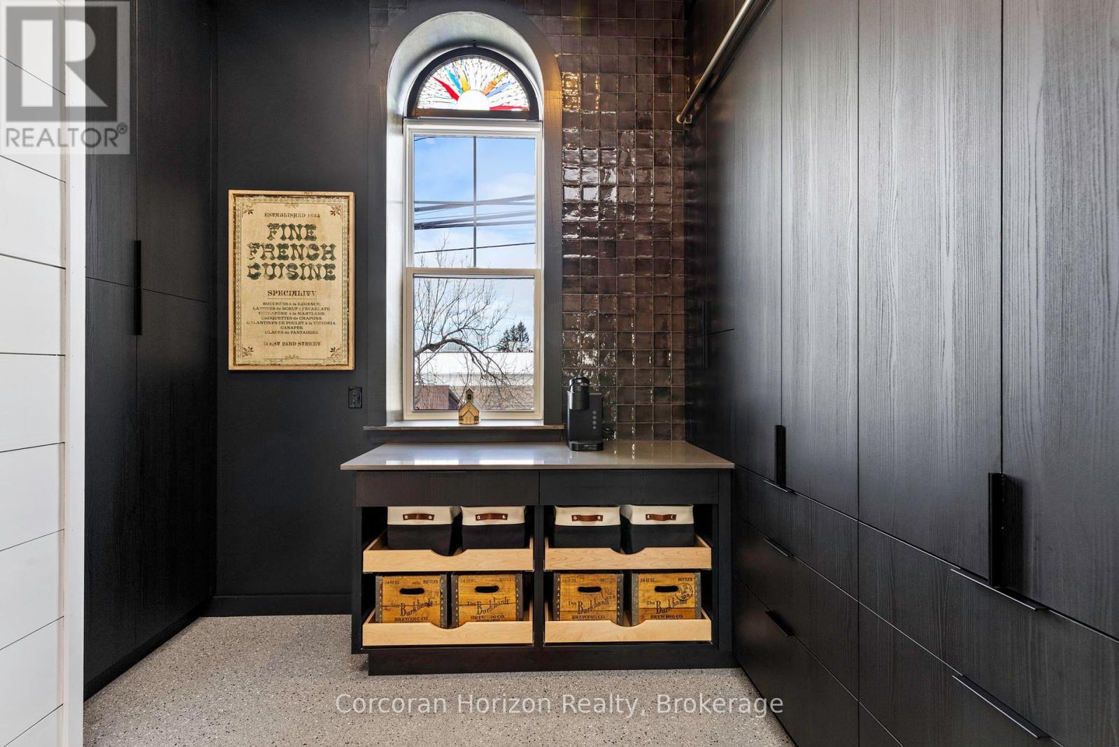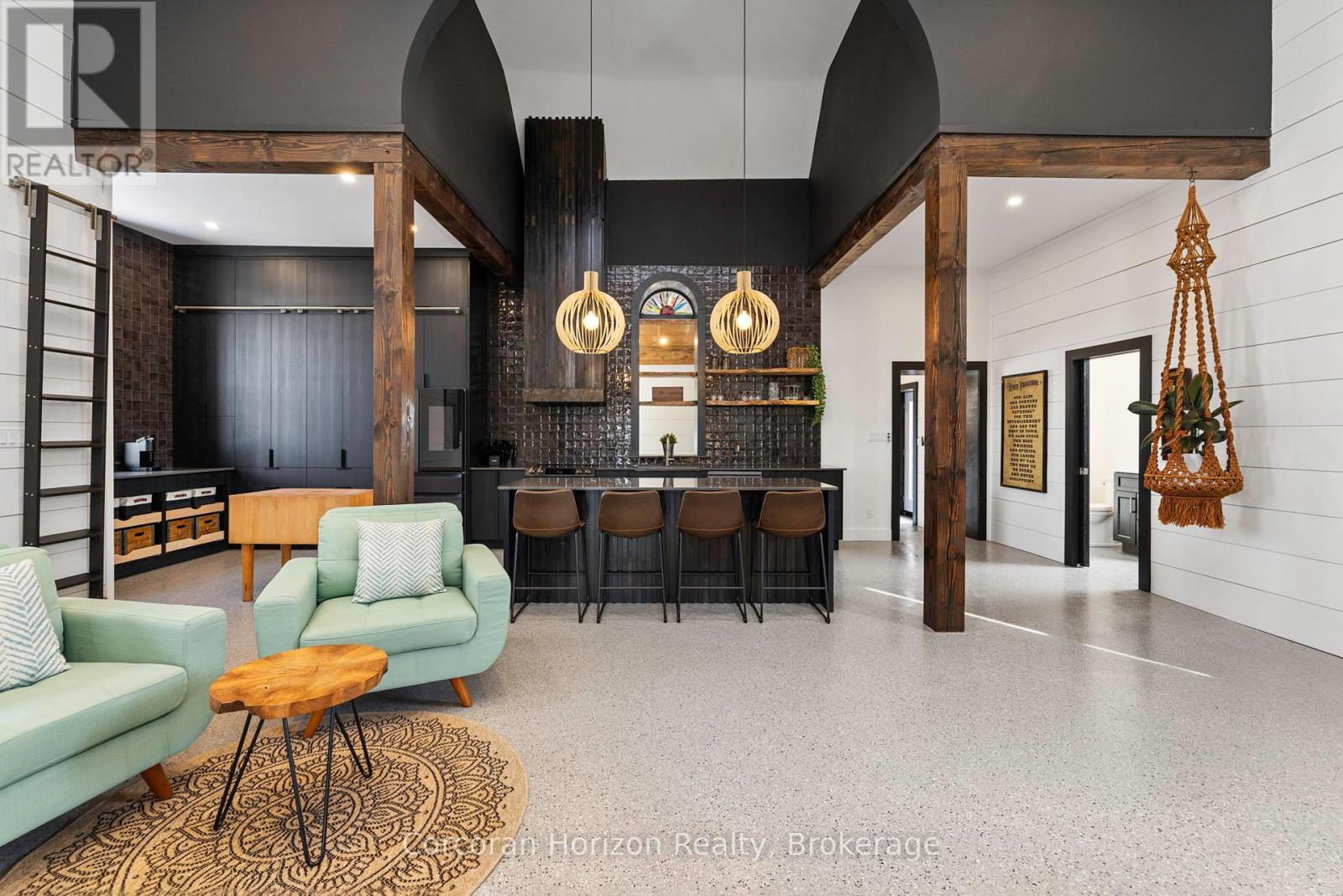 Step into a one-of-a-kind home that seamlessly blends historic charm with contemporary elegance. Originally built in 1886, this meticulously restored church has been transformed from the studs out into a breathtaking home, rich with architectural details that honour its past while embracing modern luxury and design. As you enter the foyer, reclaimed wood from the original church floors sets a warm, welcoming tone. An elegant staircase leads you to an open-concept living space across the second level. Here you will find an expansive living room with soaring 17.5ft barrel vaulted ceilings and an electric fireplace, creating an atmosphere of grandeur and comfort. The sophisticated, dark-toned kitchen is a chefs dream, featuring premium appliances, floor-to-ceiling cabinetry and a custom-built ladder. Thoughtfully designed, the second level features the primary bedroom, complete with a walk-in closet lined with cedar planks, alongside three stylish bathrooms. On the third level, two large bedrooms bathed in natural light provide serene retreats. Meanwhile, the first level offers a wealth of possibilities, additional living space, two bedrooms, ample storage, and a 4-piece bathroom. A roughed-in kitchen adds potential for a separate suite, multigenerational living, or even the possibility of conversion into a duplex. This home is a treasure trove of unique details, from stained glass transformed into window art within the original arch frames to Mennonite-crafted shiplap accents that add warmth and character. The exterior stone and brick have been professionally restored, while a second entrance at the rear enhances both its beauty and functionality. Beyond its timeless charm, this home offers complete modern convenience--all plumbing, HVAC, and electrical systems have been entirely replaced, ensuring efficiency & peace of mind for years to come. Experience the timeless beauty of this property, where craftsmanship, history, & modern elegance converge in perfect harmony. (id:56991)