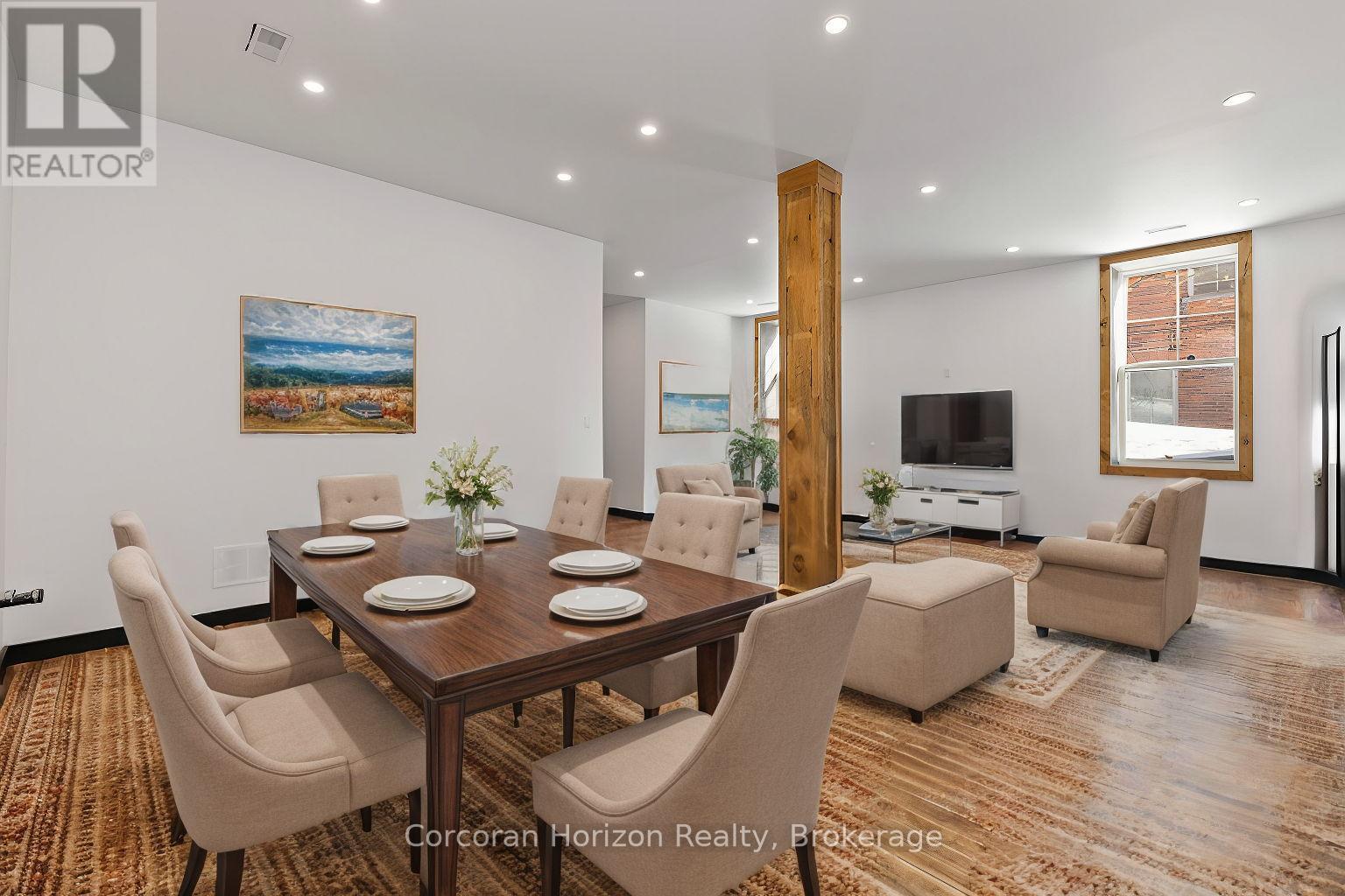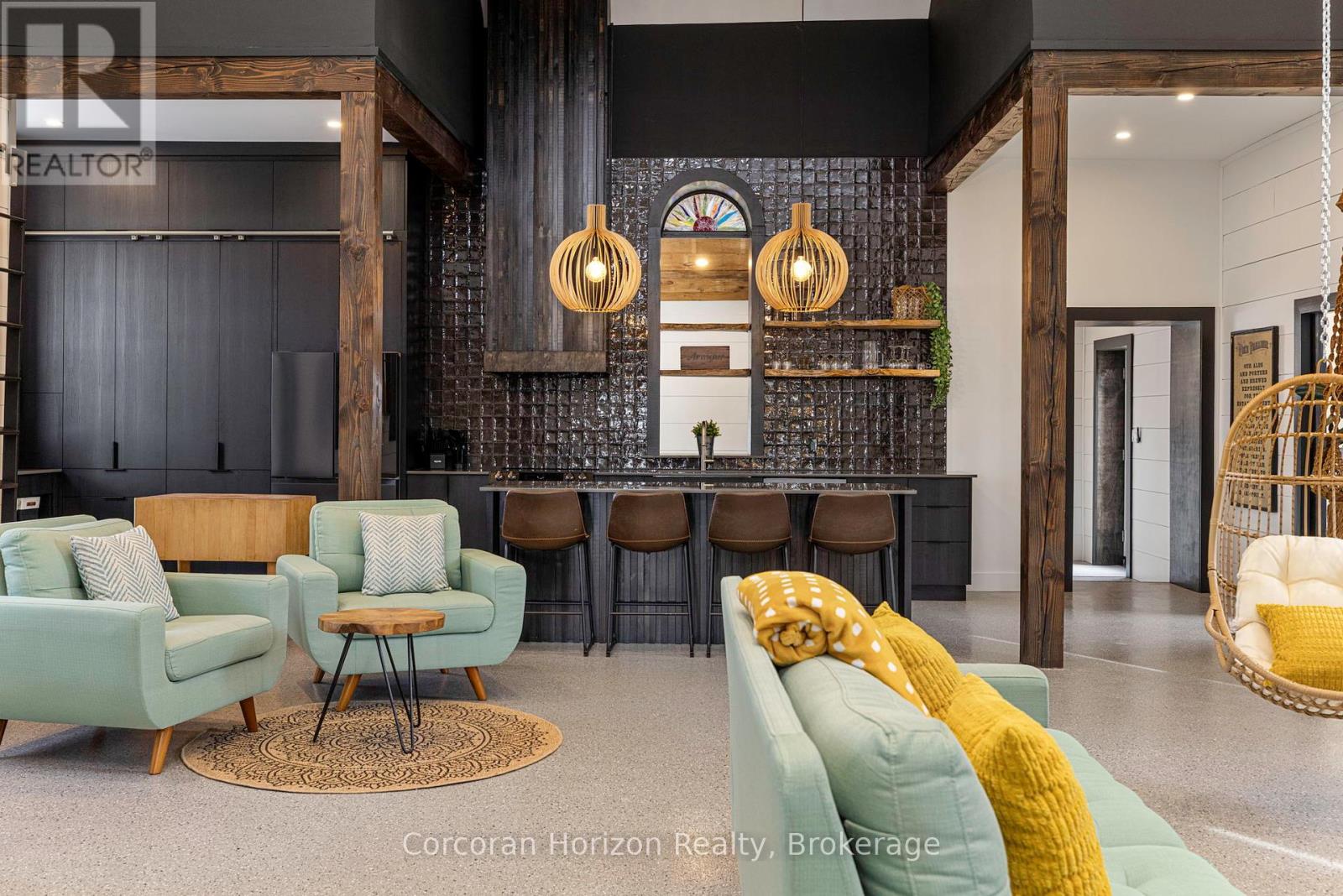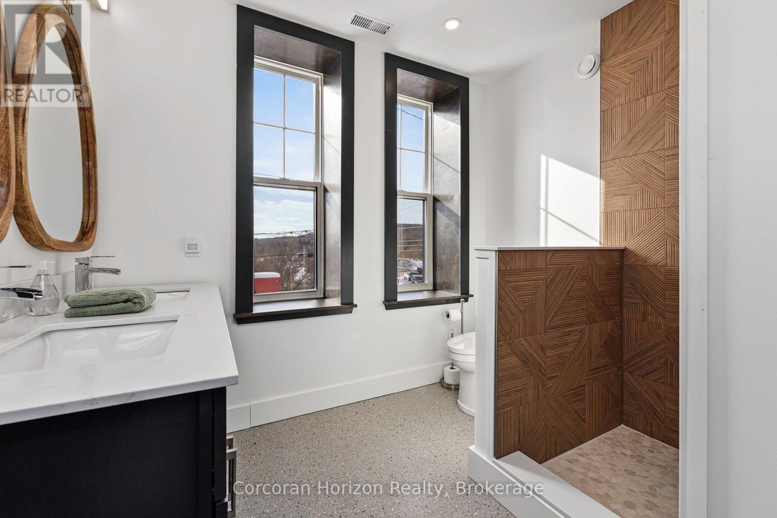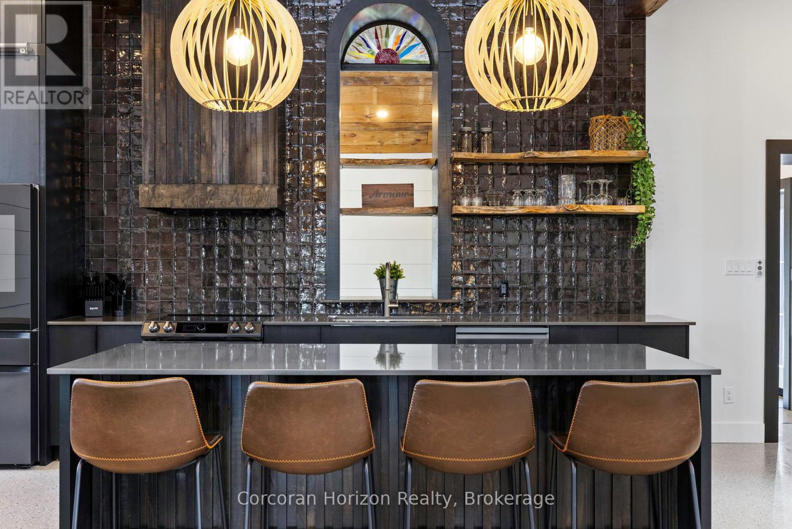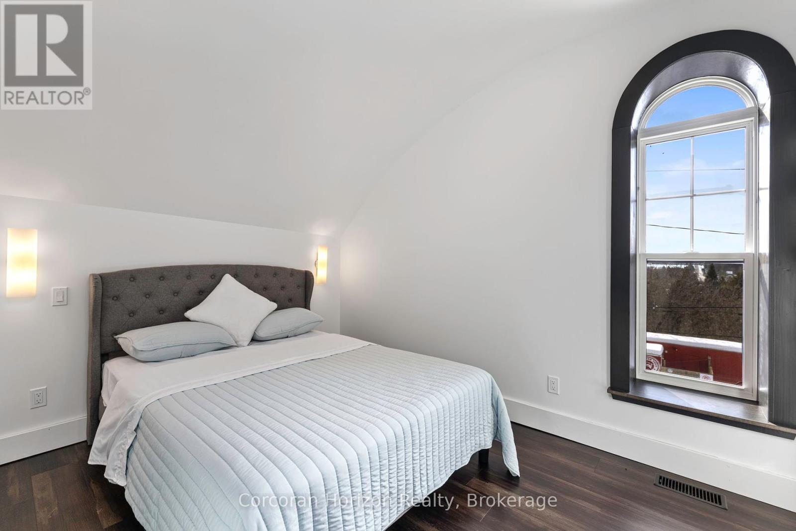 Step into a one-of-a-kind home that seamlessly blends historic charm with contemporary elegance. Originally built in 1886, this meticulously restored church has been transformed from the studs out into a breathtaking home, rich with architectural details that honour its past while embracing modern luxury and design. As you enter the foyer, reclaimed wood from the original church floors sets a warm, welcoming tone. An elegant staircase leads you to an open-concept living space across the second level. Here you will find an expansive living room with soaring 17.5ft barrel vaulted ceilings and an electric fireplace, creating an atmosphere of grandeur and comfort. The sophisticated, dark-toned kitchen is a chefs dream, featuring premium appliances, floor-to-ceiling cabinetry and a custom-built ladder. Thoughtfully designed, the second level features the primary bedroom, complete with a walk-in closet lined with cedar planks, alongside three stylish bathrooms. On the third level, two large bedrooms bathed in natural light provide serene retreats. Meanwhile, the first level offers a wealth of possibilities, additional living space, two bedrooms, ample storage, and a 4-piece bathroom. A roughed-in kitchen adds potential for a separate suite, multigenerational living, or even the possibility of conversion into a duplex. This home is a treasure trove of unique details, from stained glass transformed into window art within the original arch frames to Mennonite-crafted shiplap accents that add warmth and character. The exterior stone and brick have been professionally restored, while a second entrance at the rear enhances both its beauty and functionality. Beyond its timeless charm, this home offers complete modern convenience--all plumbing, HVAC, and electrical systems have been entirely replaced, ensuring efficiency & peace of mind for years to come. Experience the timeless beauty of this property, where craftsmanship, history, & modern elegance converge in perfect harmony. (id:56991)