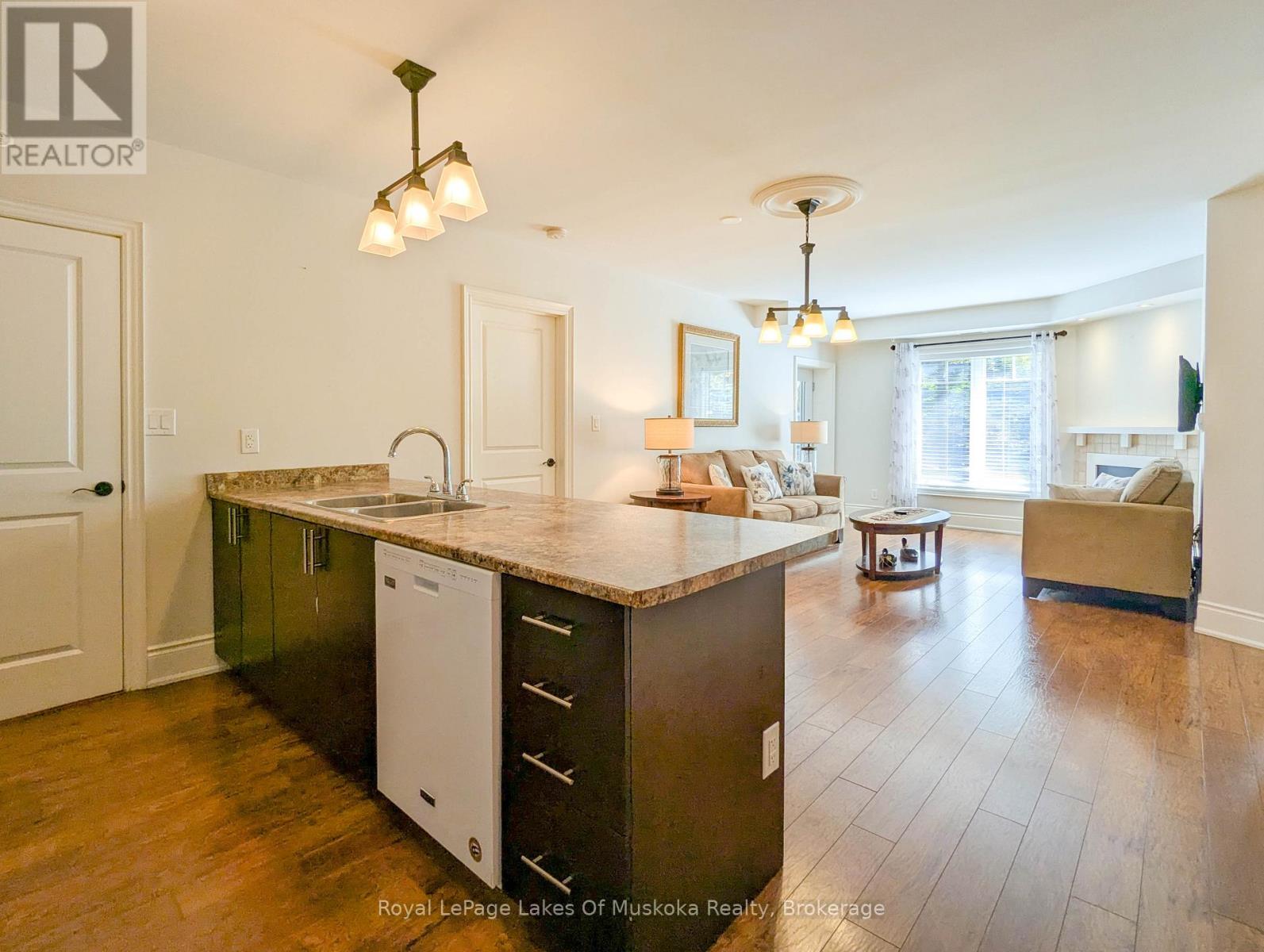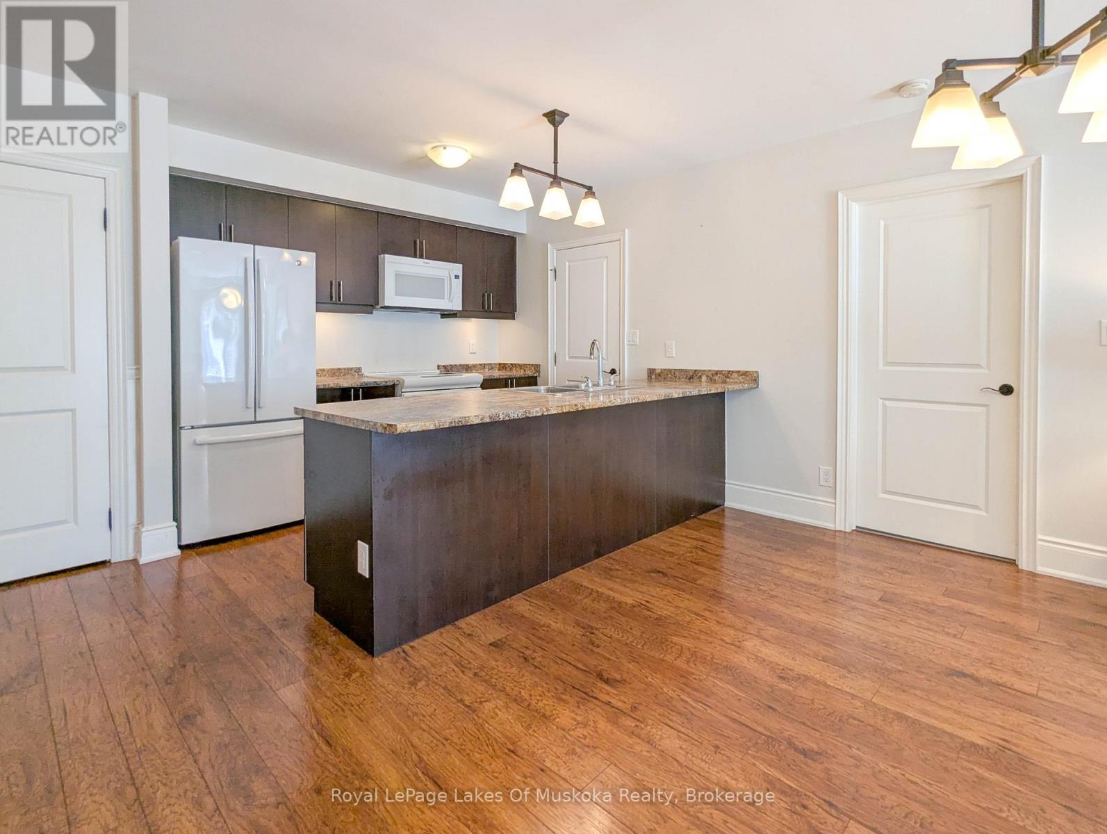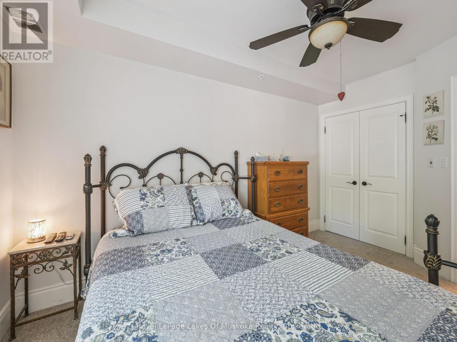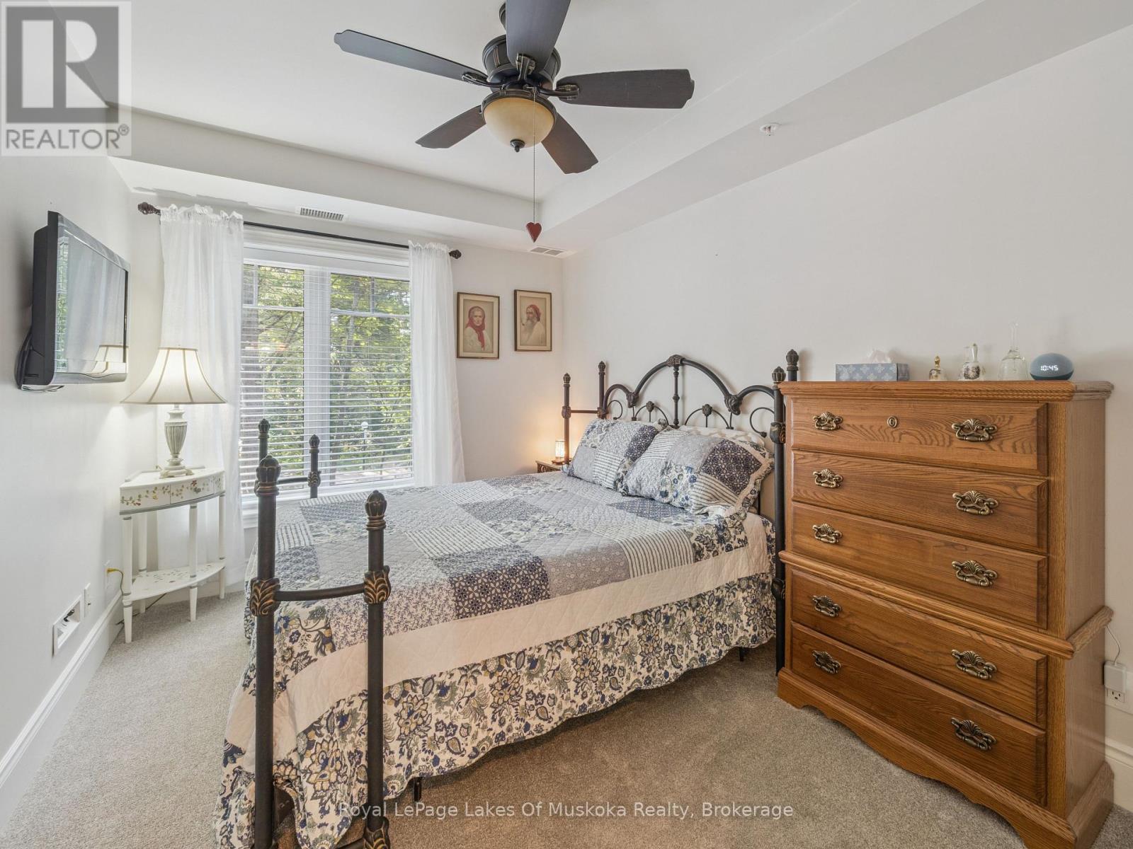 This two-bedroom, two-bathroom turn-key condo in Bracebridge offers 1035 sq ft of living space, including a private balcony. The open-concept living area with higher ceilings features a tidy kitchen with a large peninsula, breakfast bar, and under-cabinet lighting, which overlooks the dining and living rooms. The living room includes a picture window, a cozy fireplace, and a new retractable screen door that leads to a covered balcony fitted with a gas hookup for a BBQ. For added privacy, the unit has a split-bedroom layout. The primary bedroom, located on one side of the condo, includes a walk-in closet, a three-piece ensuite, and sliders to the balcony. The second bedroom is on the opposite side of the unit, adjacent to the main bathroom. This home is move-in ready and includes six appliances and in-suite laundry. Recent upgrades add to its appeal, including a fresh coat of paint throughout, new bedroom carpets, a new vanity and toilet in the ensuite, and a new washer and dryer. The condo provides forced-air gas heating and is built with ICF construction, which ensures low utility costs and a quiet environment. Residents can enjoy a variety of amenities, including a personal storage locker located in front of a private, heated underground parking space. The secure building features a welcoming lobby with an elevator and well-maintained grounds. The Granite Springs Clubhouse offers a gym, a library, a community kitchen, and a lounge with a fireplace and billiards table. The development backs onto a wooded area of the South Muskoka Curling & Golf Club and is conveniently close to local shops, entertainment, and recreation. Additionally, pets under 25 lbs are welcome. (id:56991)