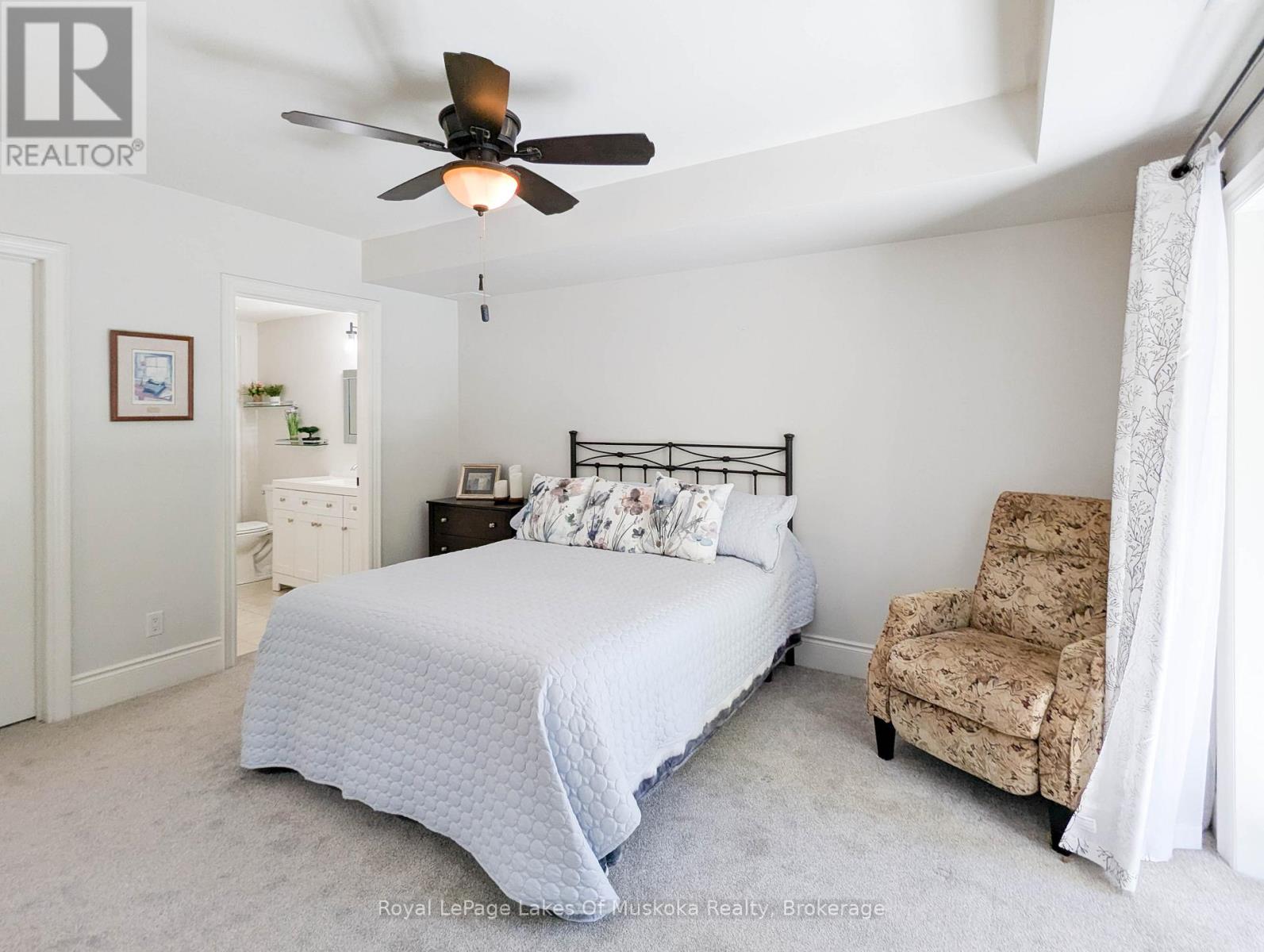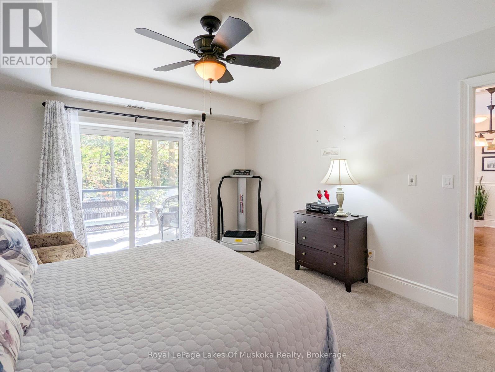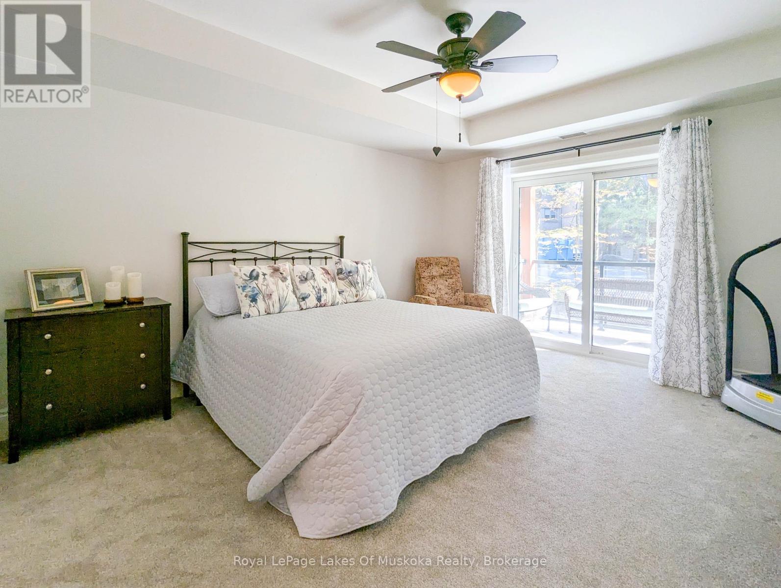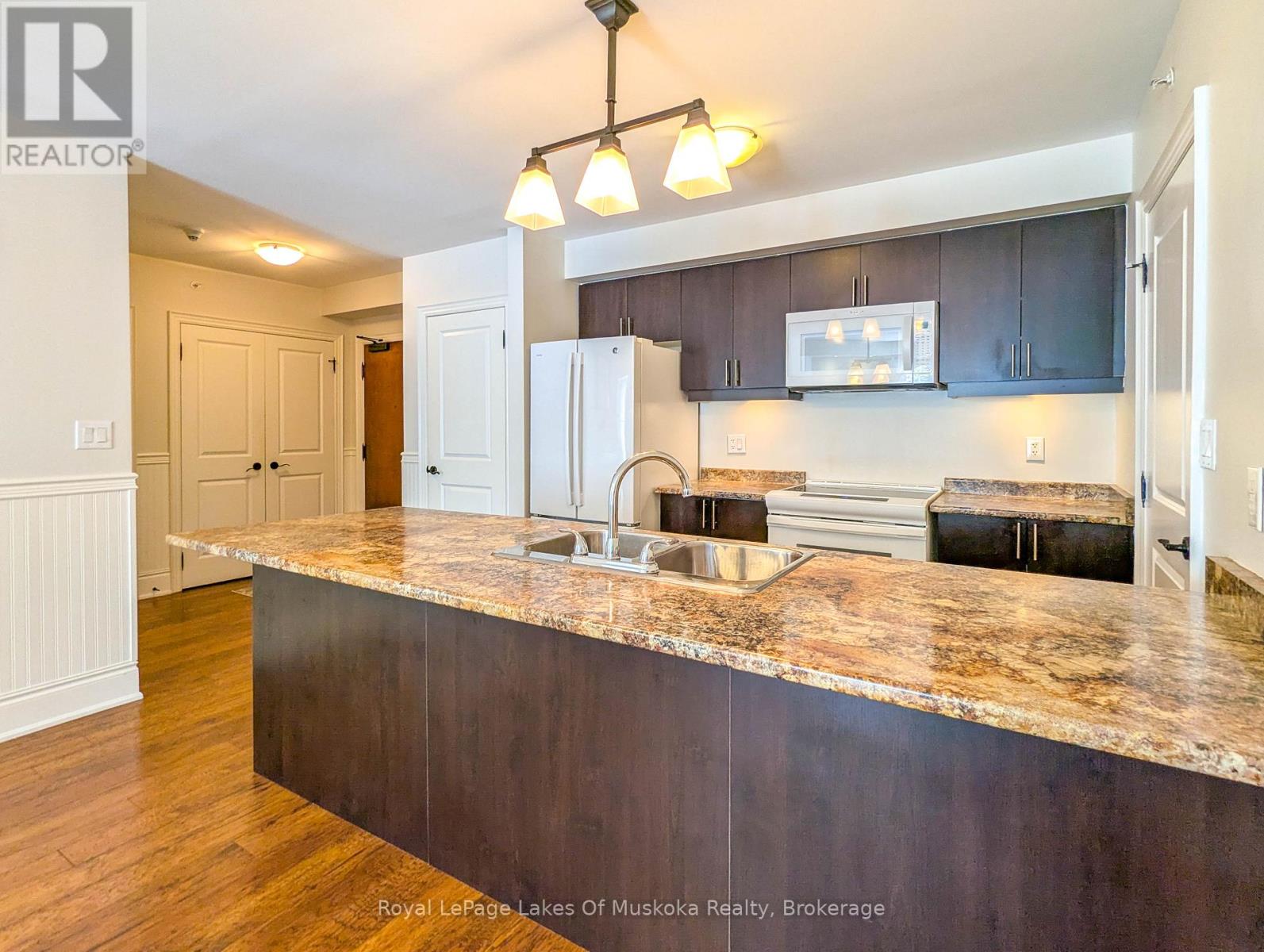 This two-bedroom, two-bathroom turn-key condo in Bracebridge offers 1035 sq ft of living space, including a private balcony. The open-concept living area with higher ceilings features a tidy kitchen with a large peninsula, breakfast bar, and under-cabinet lighting, which overlooks the dining and living rooms. The living room includes a picture window, a cozy fireplace, and a new retractable screen door that leads to a covered balcony fitted with a gas hookup for a BBQ. For added privacy, the unit has a split-bedroom layout. The primary bedroom, located on one side of the condo, includes a walk-in closet, a three-piece ensuite, and sliders to the balcony. The second bedroom is on the opposite side of the unit, adjacent to the main bathroom. This home is move-in ready and includes six appliances and in-suite laundry. Recent upgrades add to its appeal, including a fresh coat of paint throughout, new bedroom carpets, a new vanity and toilet in the ensuite, and a new washer and dryer. The condo provides forced-air gas heating and is built with ICF construction, which ensures low utility costs and a quiet environment. Residents can enjoy a variety of amenities, including a personal storage locker located in front of a private, heated underground parking space. The secure building features a welcoming lobby with an elevator and well-maintained grounds. The Granite Springs Clubhouse offers a gym, a library, a community kitchen, and a lounge with a fireplace and billiards table. The development backs onto a wooded area of the South Muskoka Curling & Golf Club and is conveniently close to local shops, entertainment, and recreation. Additionally, pets under 25 lbs are welcome. (id:56991)