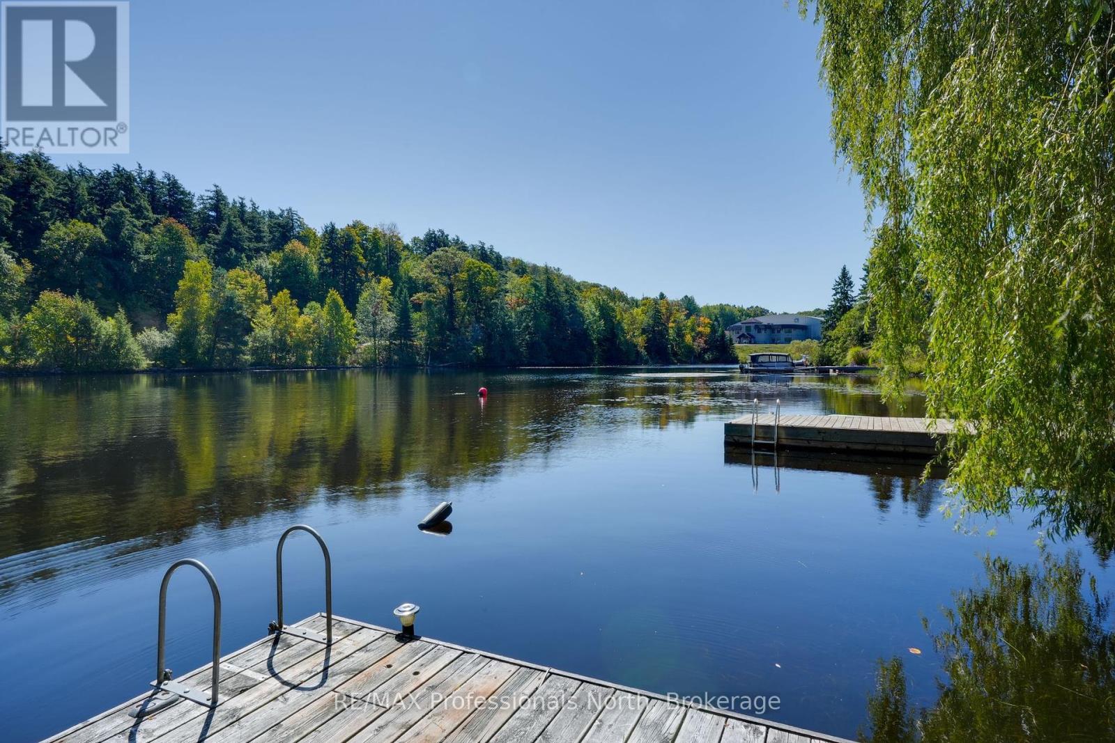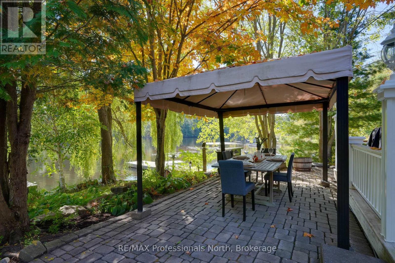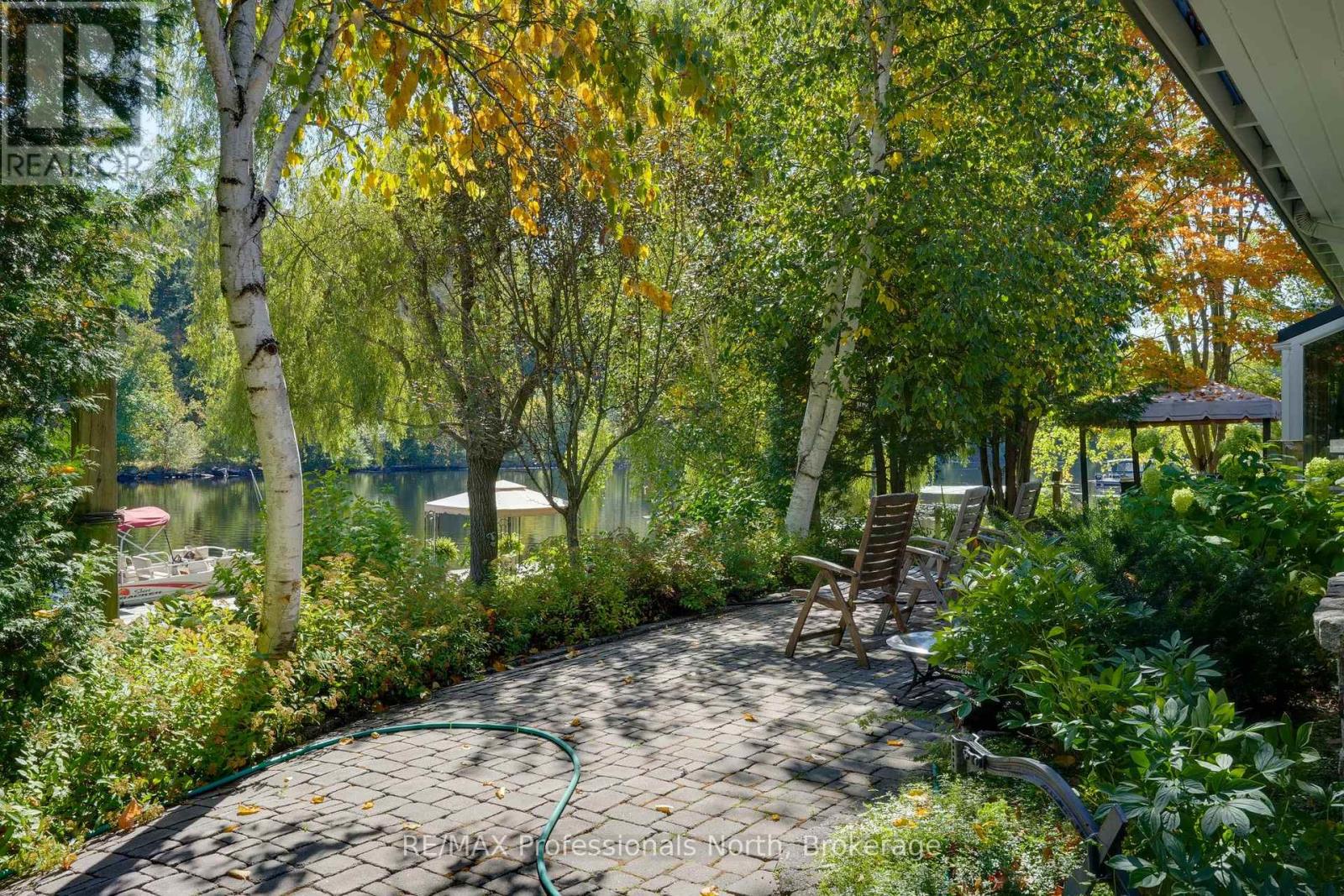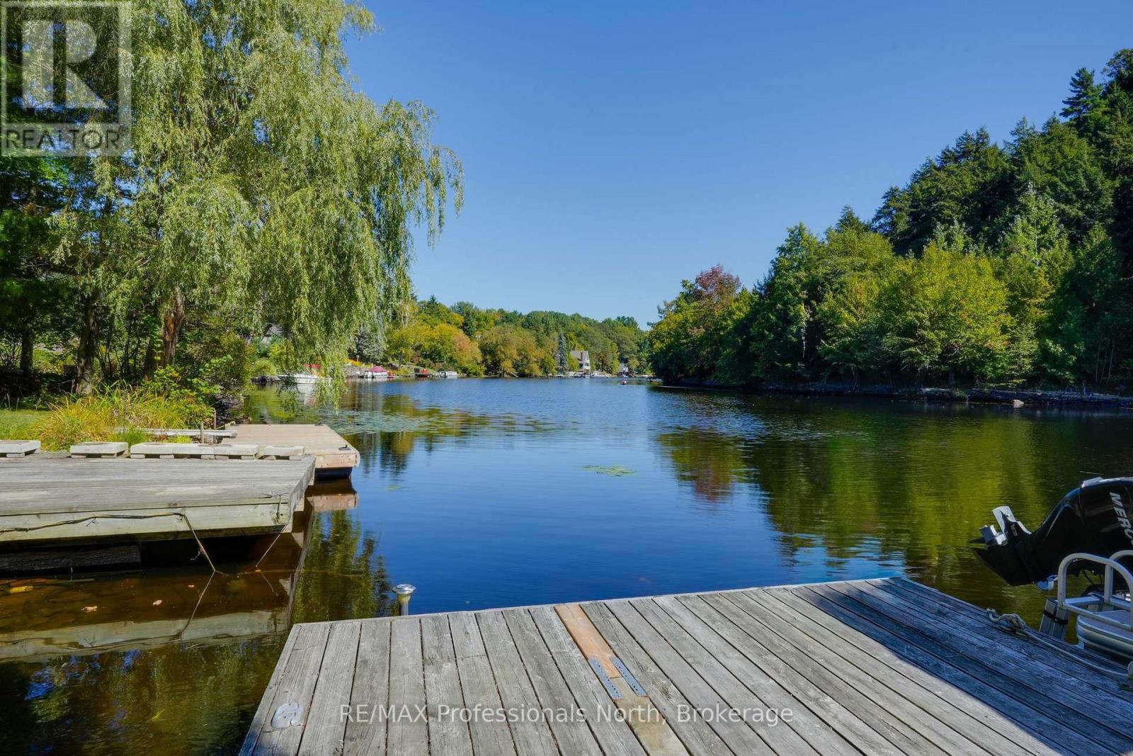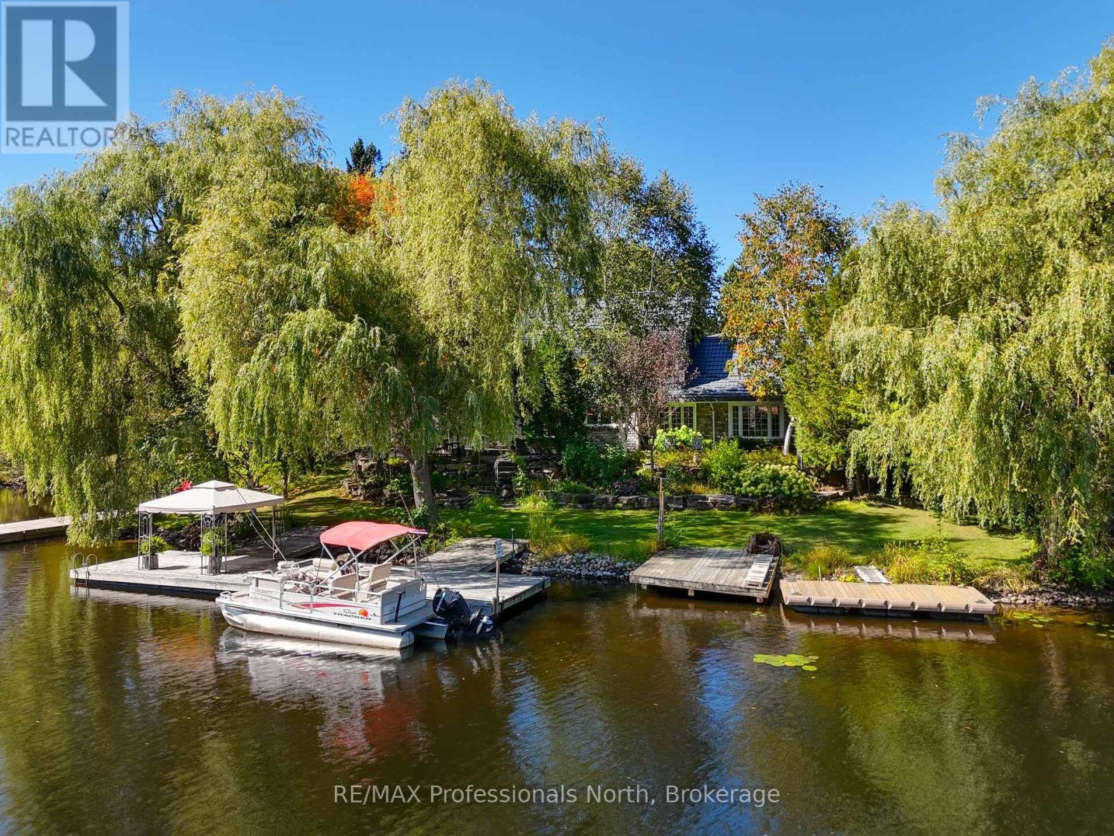 Welcome to a property so beloved, it's been admired from the water for decades - a true Muskoka icon nestled along the tranquil shores of the Muskoka River, just before it opens into the shimmering expanse of Fairy Lake. This one-of-a-kind stone-clad home captures the essence of cottage country magic - a dreamy blend of timeless charm and refined comfort, set at the peaceful end of a quiet cul-de-sac. Wander down to a gently sloping, park-like lot where mature trees sway gently overhead, and lush perennial gardens burst with color. Whispering willows dance in the breeze, casting flickering shadows on the rippling water. Nature and home blend seamlessly here. Multiple handcrafted stone patios offer the perfect places to dine alfresco, sip morning coffee, or toast the sunset with friends. Whether you're basking in the sun on the sprawling dock (approx. 12x96ft) or curling up under a canopy of stars, the river is your ever-changing backdrop. Inside, the charm continues. Step into a soaring great room with warm wood accents and beams and a cozy gas fireplace - an inviting space to gather and unwind. The eat-in kitchen features granite counters, an abundance of cabinetry, and picture windows that perfectly frame the water views. Rich hardwood floors thru-out many of the living spaces. The main floor primary suite offers peaceful privacy, while two additional bedrooms and three baths provide comfort for guests and family alike. A full basement attached garage with inside entry, and ample storage complete the offering. Only minutes by boat or on foot to the heart of downtown Huntsville, yet worlds away in feel - this is more than a home. It is a Muskoka dream made real. (id:56991)