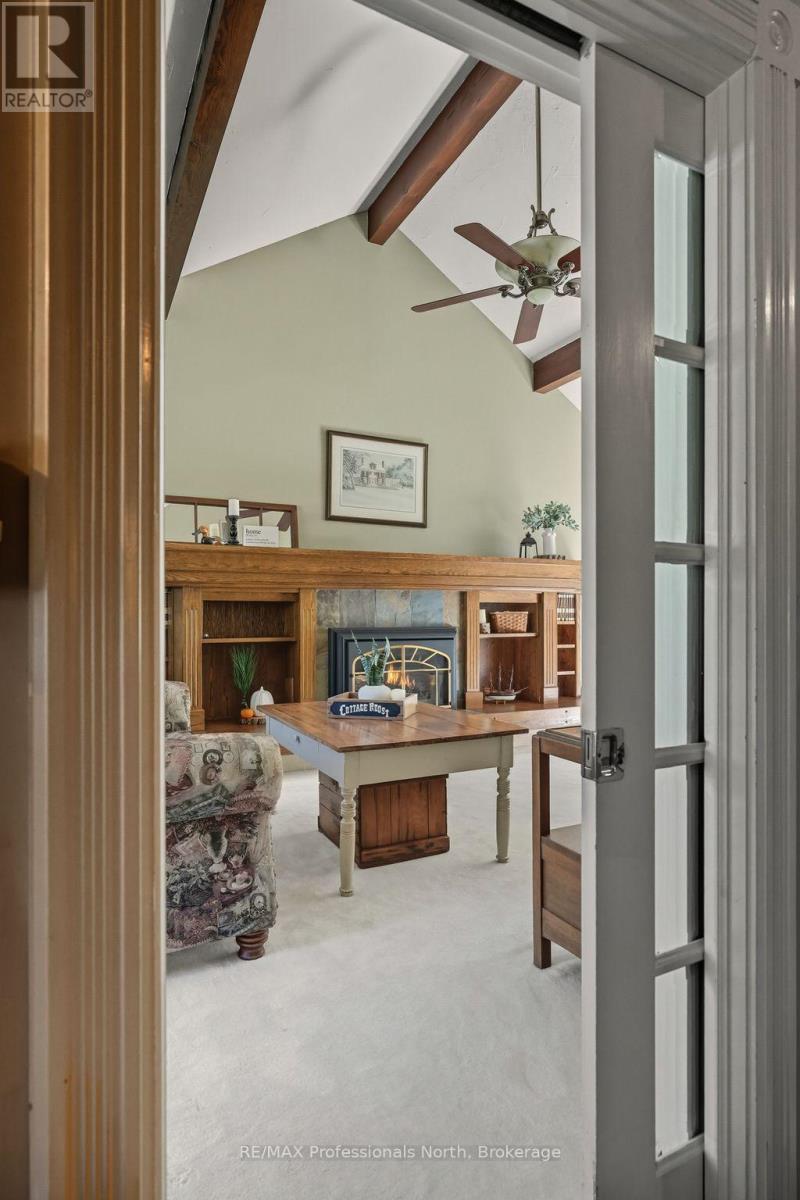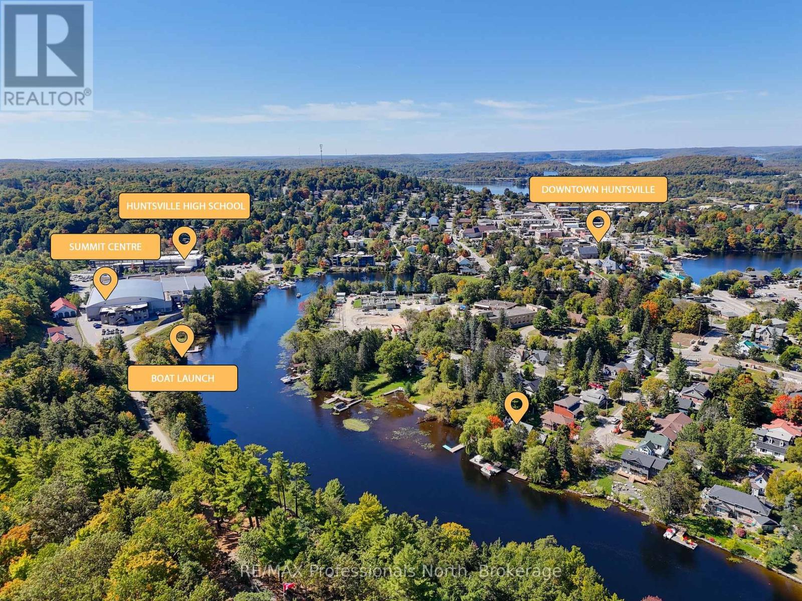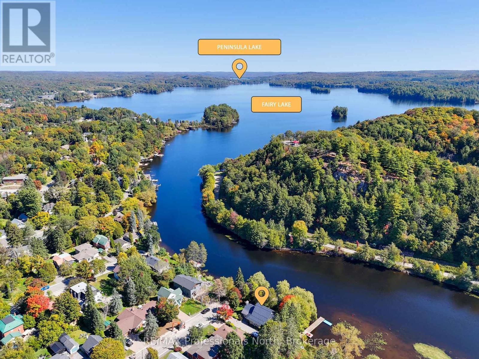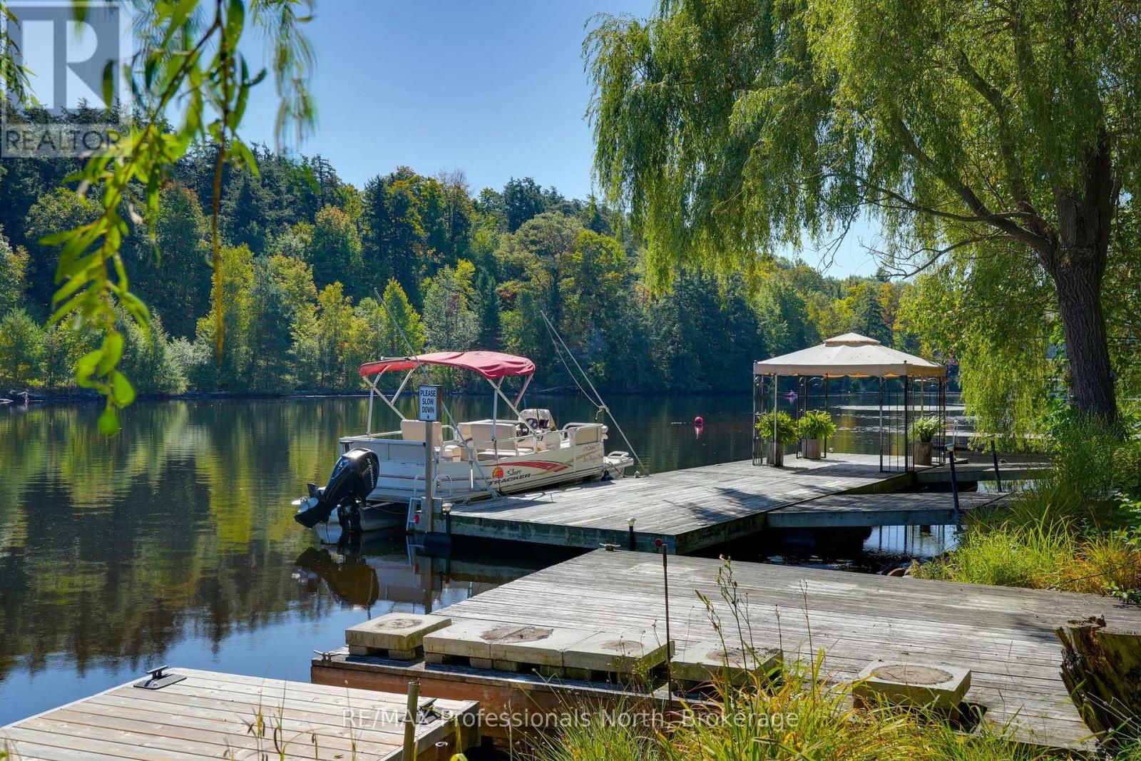 Welcome to a property so beloved, it's been admired from the water for decades - a true Muskoka icon nestled along the tranquil shores of the Muskoka River, just before it opens into the shimmering expanse of Fairy Lake. This one-of-a-kind stone-clad home captures the essence of cottage country magic - a dreamy blend of timeless charm and refined comfort, set at the peaceful end of a quiet cul-de-sac. Wander down to a gently sloping, park-like lot where mature trees sway gently overhead, and lush perennial gardens burst with color. Whispering willows dance in the breeze, casting flickering shadows on the rippling water. Nature and home blend seamlessly here. Multiple handcrafted stone patios offer the perfect places to dine alfresco, sip morning coffee, or toast the sunset with friends. Whether you're basking in the sun on the sprawling dock (approx. 12x96ft) or curling up under a canopy of stars, the river is your ever-changing backdrop. Inside, the charm continues. Step into a soaring great room with warm wood accents and beams and a cozy gas fireplace - an inviting space to gather and unwind. The eat-in kitchen features granite counters, an abundance of cabinetry, and picture windows that perfectly frame the water views. Rich hardwood floors thru-out many of the living spaces. The main floor primary suite offers peaceful privacy, while two additional bedrooms and three baths provide comfort for guests and family alike. A full basement attached garage with inside entry, and ample storage complete the offering. Only minutes by boat or on foot to the heart of downtown Huntsville, yet worlds away in feel - this is more than a home. It is a Muskoka dream made real. (id:56991)