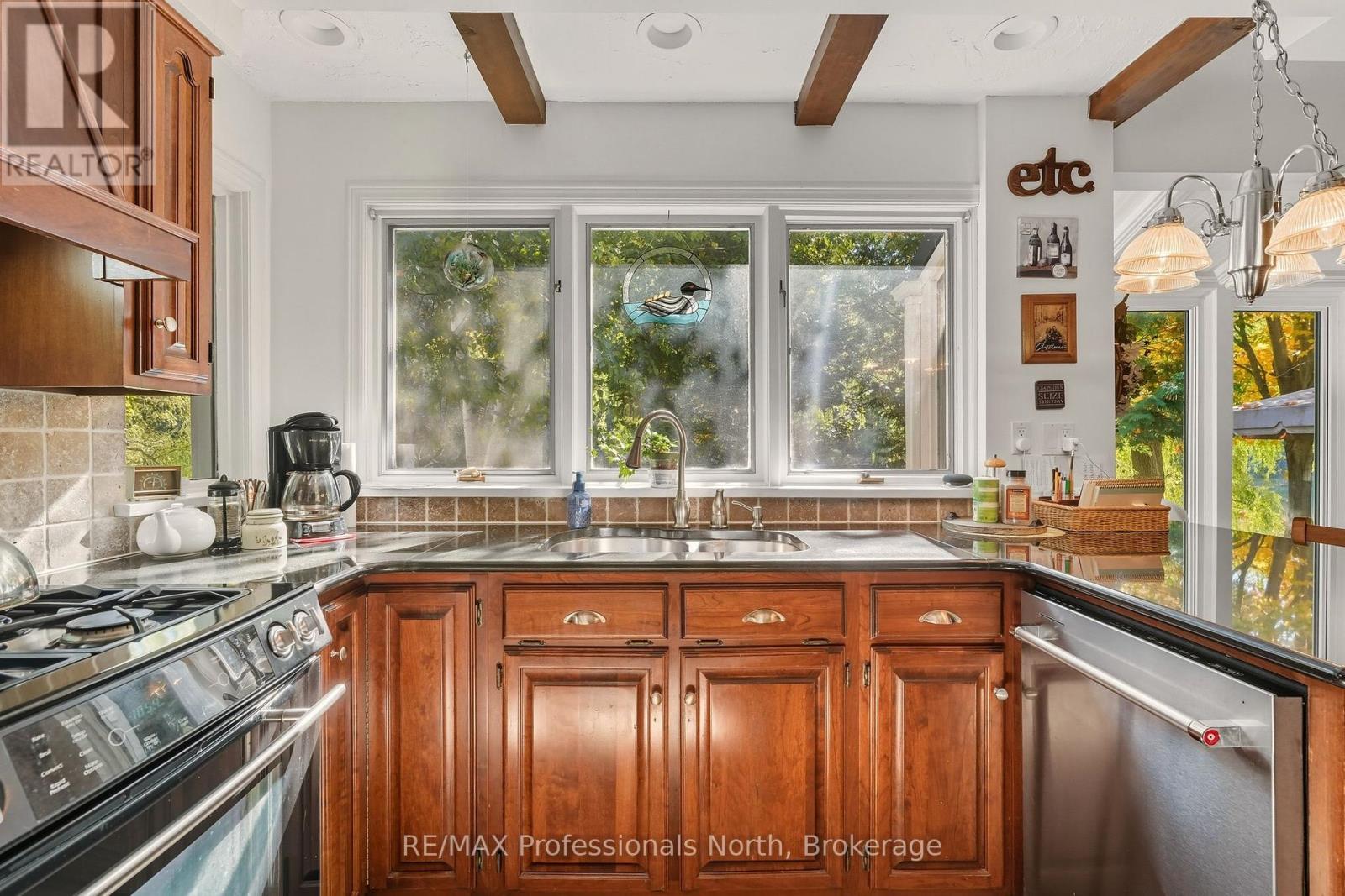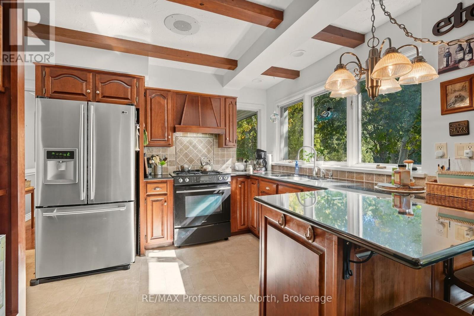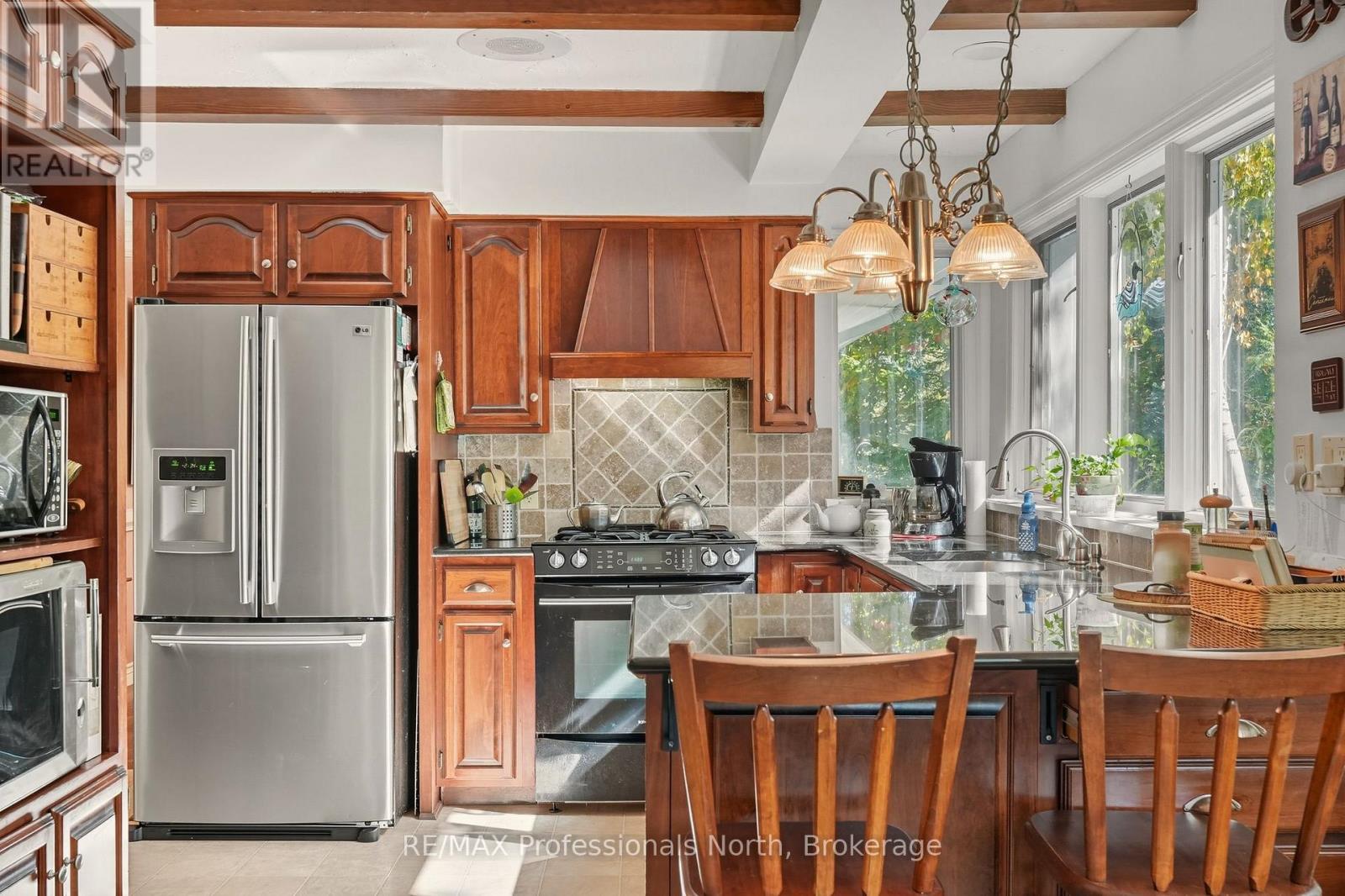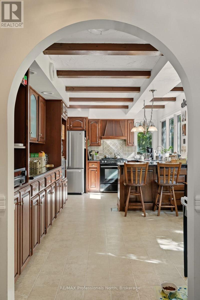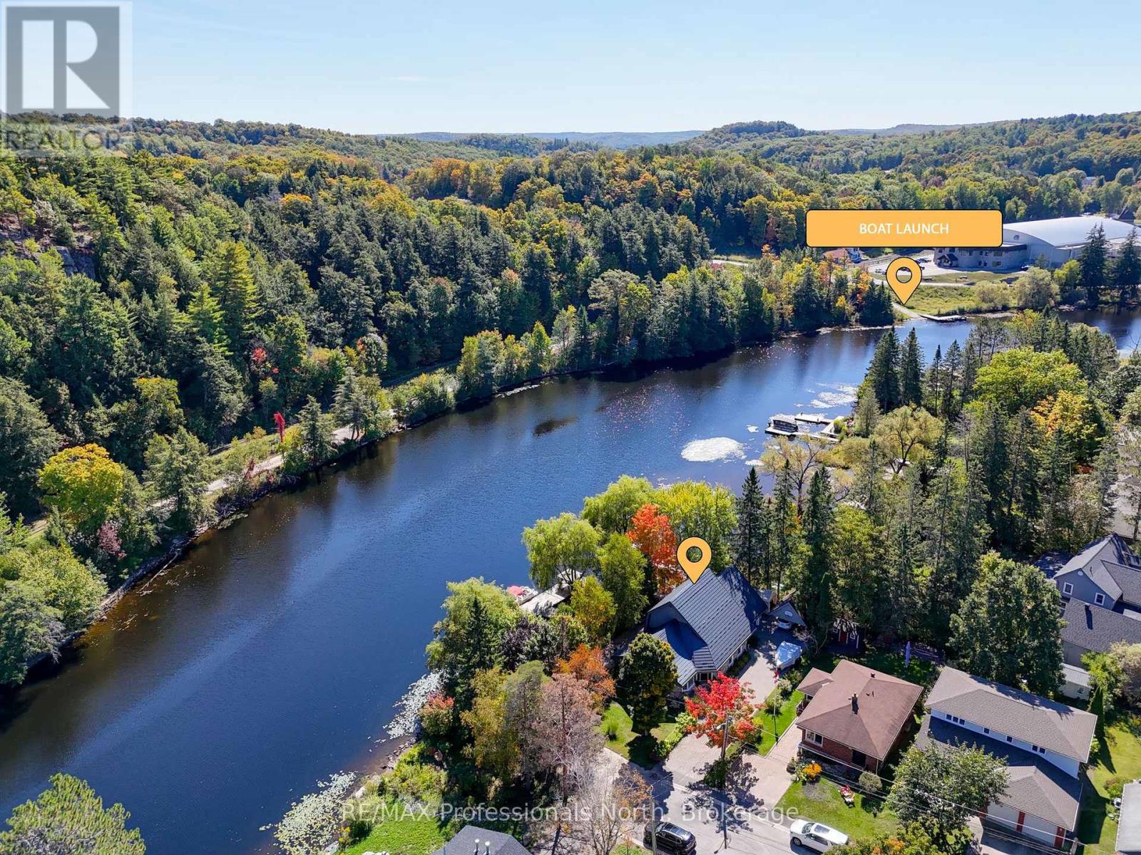Welcome to a property so beloved, it's been admired from the water for decades - a true Muskoka icon nestled along the tranquil shores of the Muskoka River, just before it opens into the shimmering expanse of Fairy Lake. This one-of-a-kind stone-clad home captures the essence of cottage country magic - a dreamy blend of timeless charm and refined comfort, set at the peaceful end of a quiet cul-de-sac. Wander down to a gently sloping, park-like lot where mature trees sway gently overhead, and lush perennial gardens burst with color. Whispering willows dance in the breeze, casting flickering shadows on the rippling water. Nature and home blend seamlessly here. Multiple handcrafted stone patios offer the perfect places to dine alfresco, sip morning coffee, or toast the sunset with friends. Whether you're basking in the sun on the sprawling dock (approx. 12x96ft) or curling up under a canopy of stars, the river is your ever-changing backdrop. Inside, the charm continues. Step into a soaring great room with warm wood accents and beams and a cozy gas fireplace - an inviting space to gather and unwind. The eat-in kitchen features granite counters, an abundance of cabinetry, and picture windows that perfectly frame the water views. Rich hardwood floors thru-out many of the living spaces. The main floor primary suite offers peaceful privacy, while two additional bedrooms and three baths provide comfort for guests and family alike. A full basement attached garage with inside entry, and ample storage complete the offering. Only minutes by boat or on foot to the heart of downtown Huntsville, yet worlds away in feel - this is more than a home. It is a Muskoka dream made real. (id:56991)