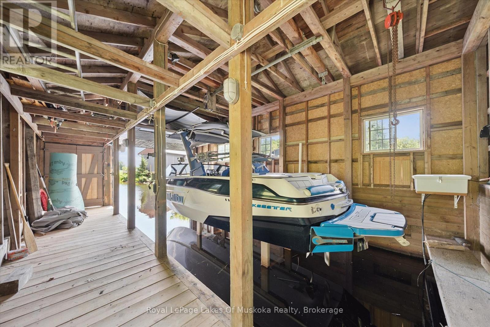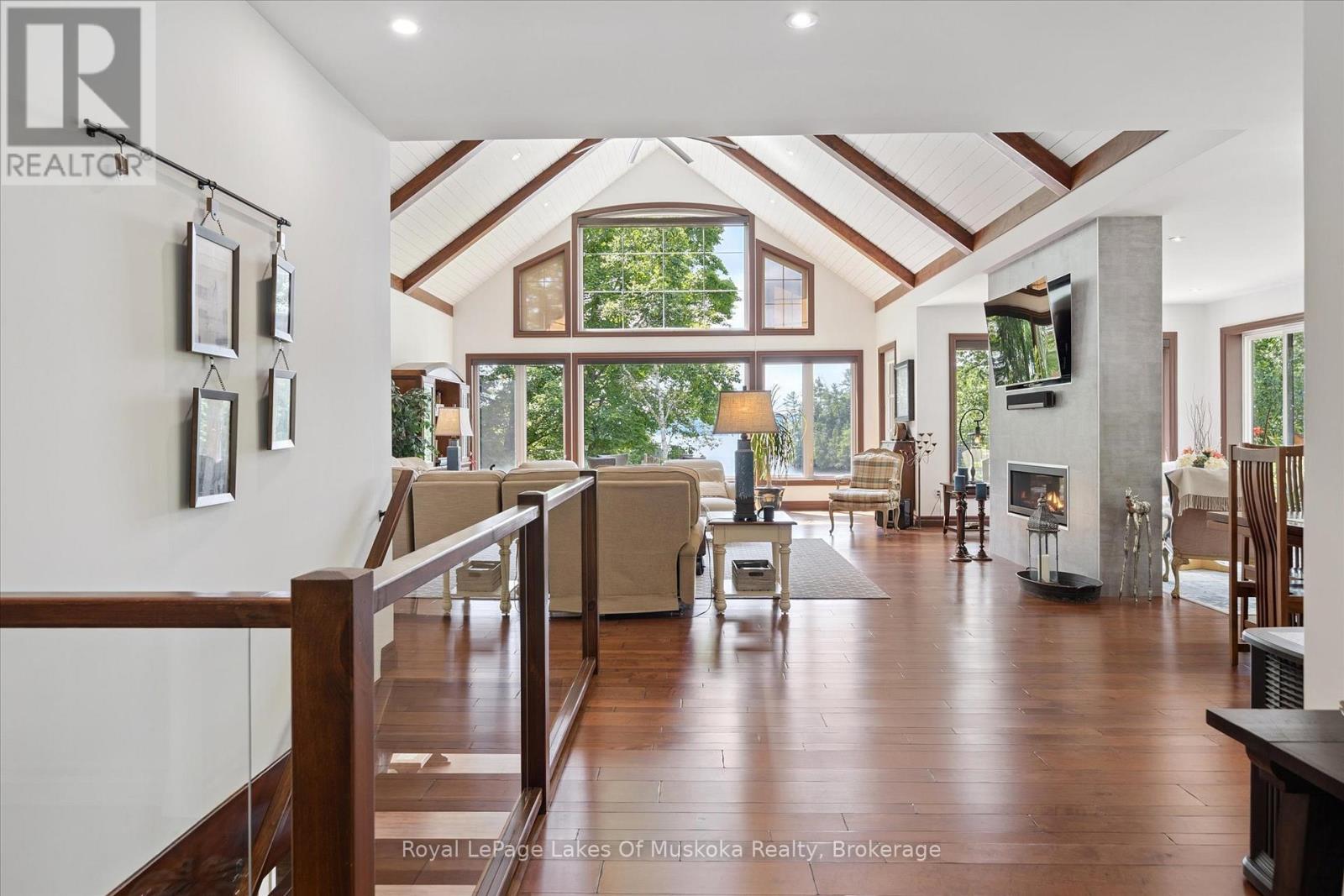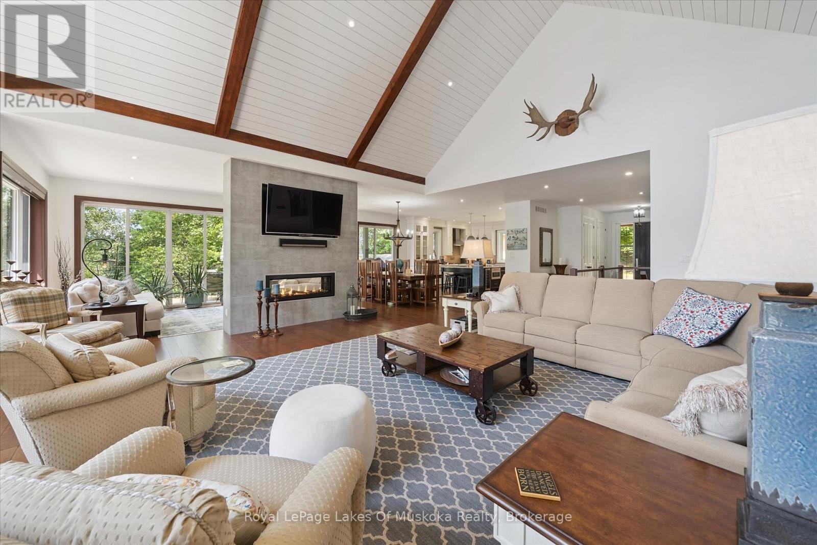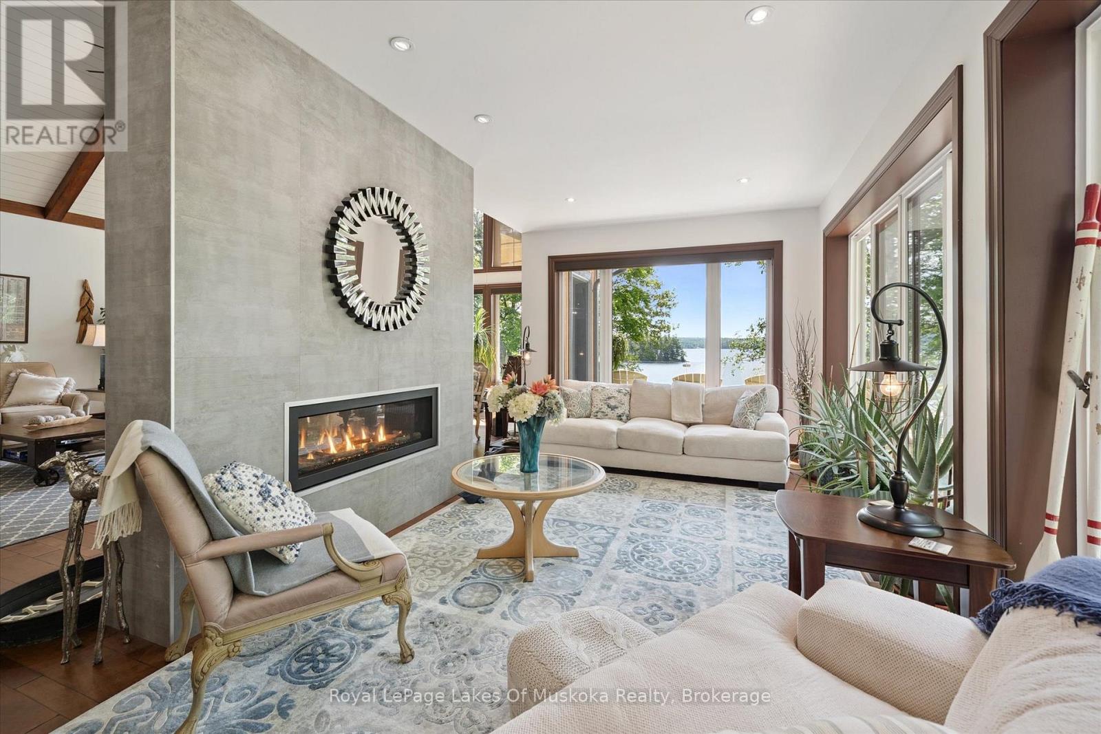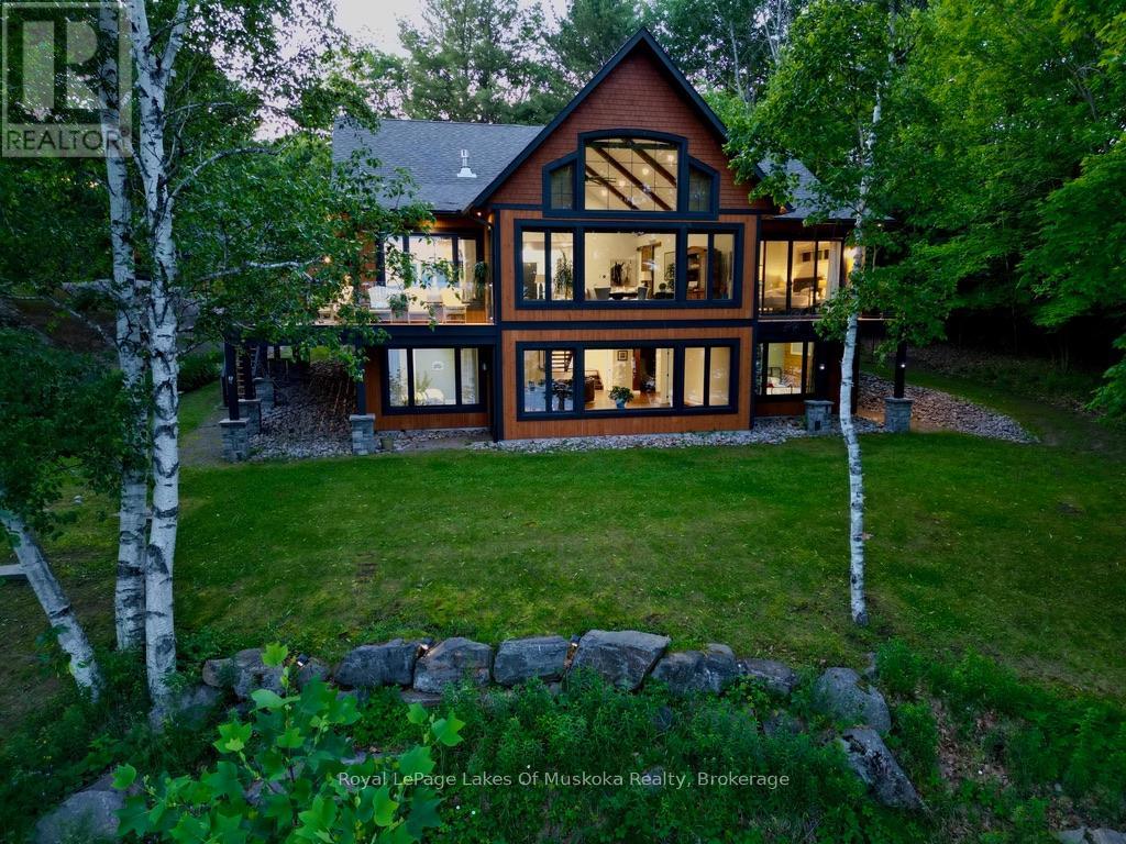 No wonder this property was featured on the front cover of Muskoka Life Magazine as it is suitable for year round ultimate retirement, multi-generational and recreational living. This 5000+ sq ft, 2017-custom home is where contemporary meets traditional, fully furnished and turn key with 316 ft of lake frontage, deep enough to dive off the dock and shallow area for the little ones, all conveniently located just minutes to the town hub. Level parking and entrance. Once you open the 8-foot high front door, you will be drawn to the long southern views of Mary Lake.This home was personally designed by the current owner with ease of living and entertaining in mind, all conveniences on one level with 9 ft ceilings, 8 ft doors, soaring vaulted ceilings, engineered hardwood flooring throughout and a chefs worthy kitchen with an abundance of storage, the oversized island and open floor plan with a granite 2 sided propane fireplace and cozy sitting room off the grand room and main floor laundry rm. The private Master wing with large walk-in closet and spa worthy ensuite with heated Italian ceramic flooring, additional 2nd main floor bedroom all on one level.The lower level, completed with 4 additional bedrooms, full bath, gym and fam room with easy walkout/entry from/to lakeside fun. A very well-thought-through design on all floors. Fibre Optic and let's not forget the large deck with tempered glass railings. 4-car garage (1236 sq) with separate entrances for 4 snowmobiles & slanted floors for drainage. At the west side of the property, the boathouse & boat lift. Adjacent to low key family run marina for gas. There is not one corner of this home or outbuilding that is not designed well for lavish Lakefront living on Mary Lake with access to 40 miles of boating. Enough said, come see yourself as this property is ready for your showing, where you will fall in love and just need to pack your toothbrush/personals. Are you ready to make new memories at your new Muskoka address? (id:56991)