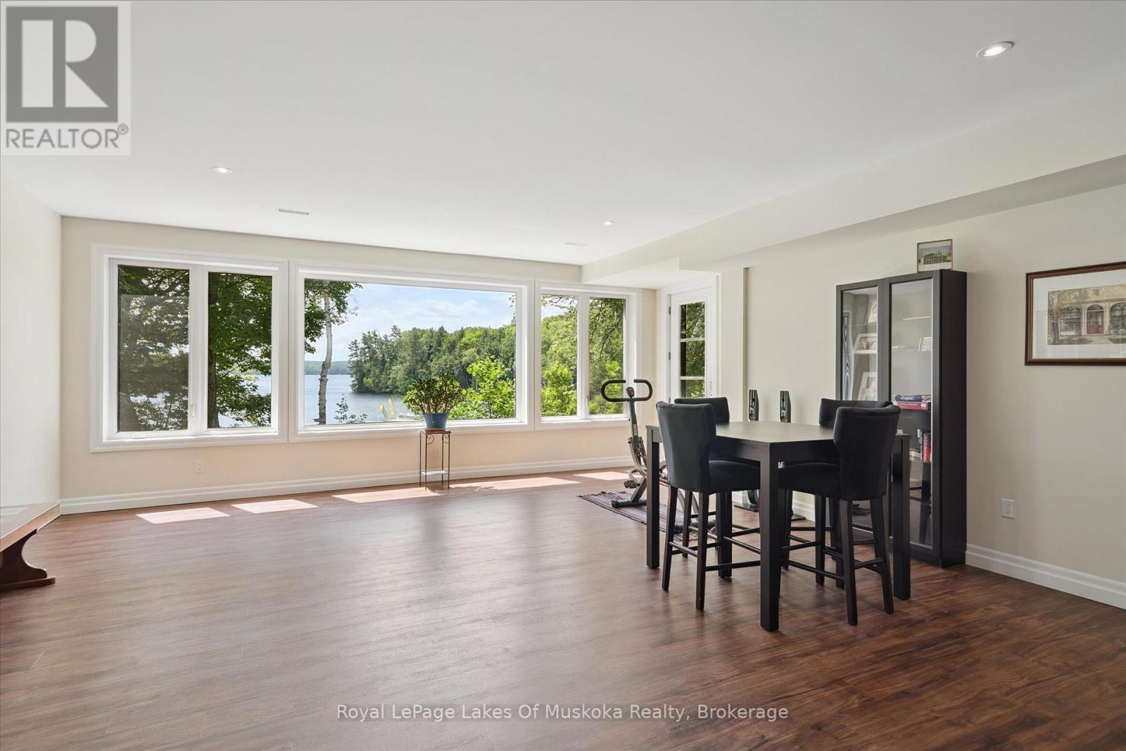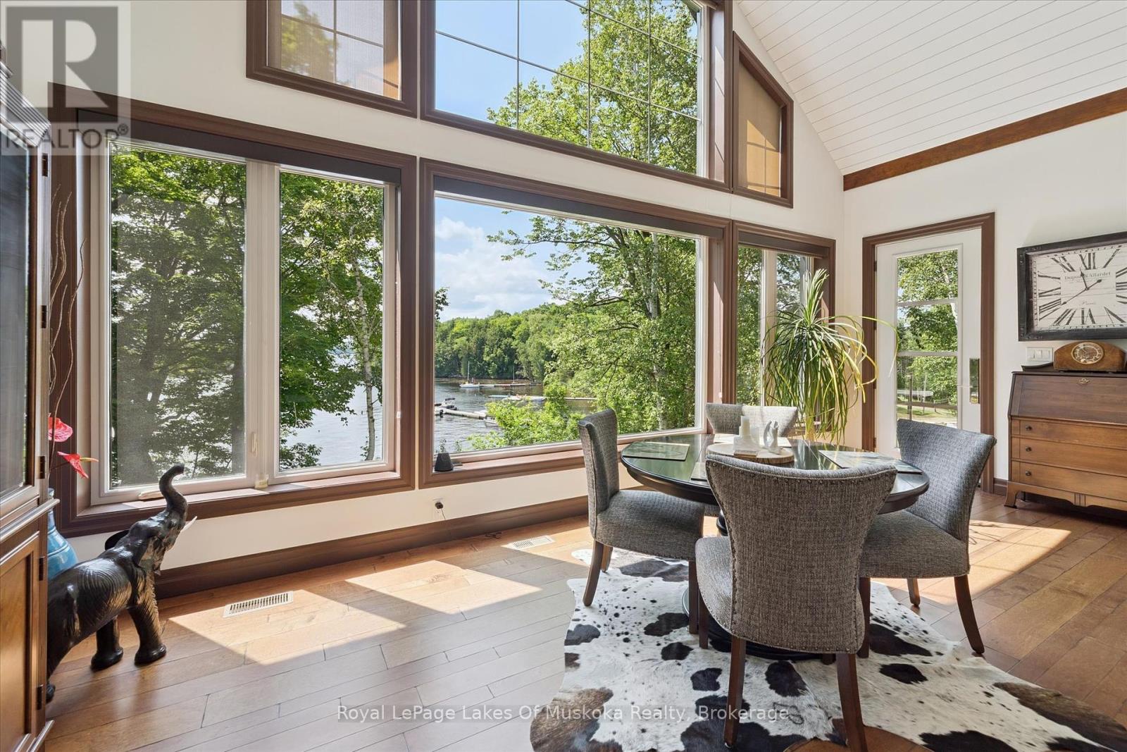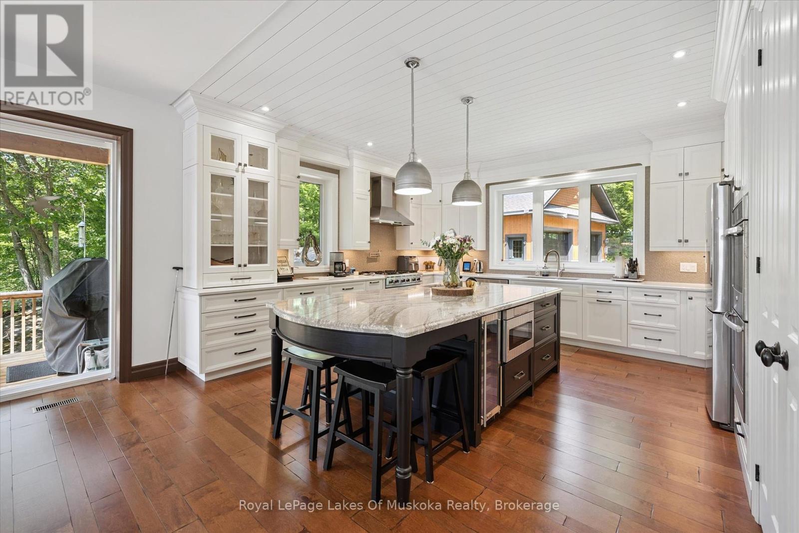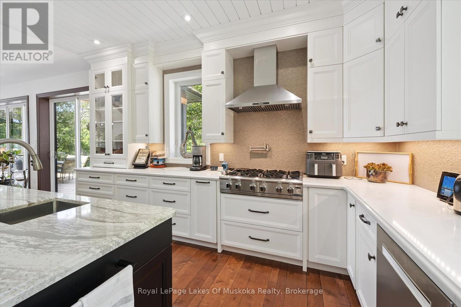 No wonder this property was featured on the front cover of Muskoka Life Magazine as it is suitable for year round ultimate retirement, multi-generational and recreational living. This 5000+ sq ft, 2017-custom home is where contemporary meets traditional, fully furnished and turn key with 316 ft of lake frontage, deep enough to dive off the dock and shallow area for the little ones, all conveniently located just minutes to the town hub. Level parking and entrance. Once you open the 8-foot high front door, you will be drawn to the long southern views of Mary Lake.This home was personally designed by the current owner with ease of living and entertaining in mind, all conveniences on one level with 9 ft ceilings, 8 ft doors, soaring vaulted ceilings, engineered hardwood flooring throughout and a chefs worthy kitchen with an abundance of storage, the oversized island and open floor plan with a granite 2 sided propane fireplace and cozy sitting room off the grand room and main floor laundry rm. The private Master wing with large walk-in closet and spa worthy ensuite with heated Italian ceramic flooring, additional 2nd main floor bedroom all on one level.The lower level, completed with 4 additional bedrooms, full bath, gym and fam room with easy walkout/entry from/to lakeside fun. A very well-thought-through design on all floors. Fibre Optic and let's not forget the large deck with tempered glass railings. 4-car garage (1236 sq) with separate entrances for 4 snowmobiles & slanted floors for drainage. At the west side of the property, the boathouse & boat lift. Adjacent to low key family run marina for gas. There is not one corner of this home or outbuilding that is not designed well for lavish Lakefront living on Mary Lake with access to 40 miles of boating. Enough said, come see yourself as this property is ready for your showing, where you will fall in love and just need to pack your toothbrush/personals. Are you ready to make new memories at your new Muskoka address? (id:56991)