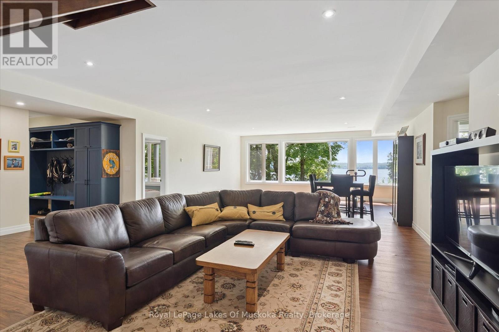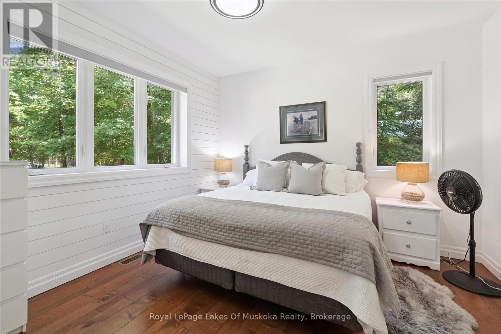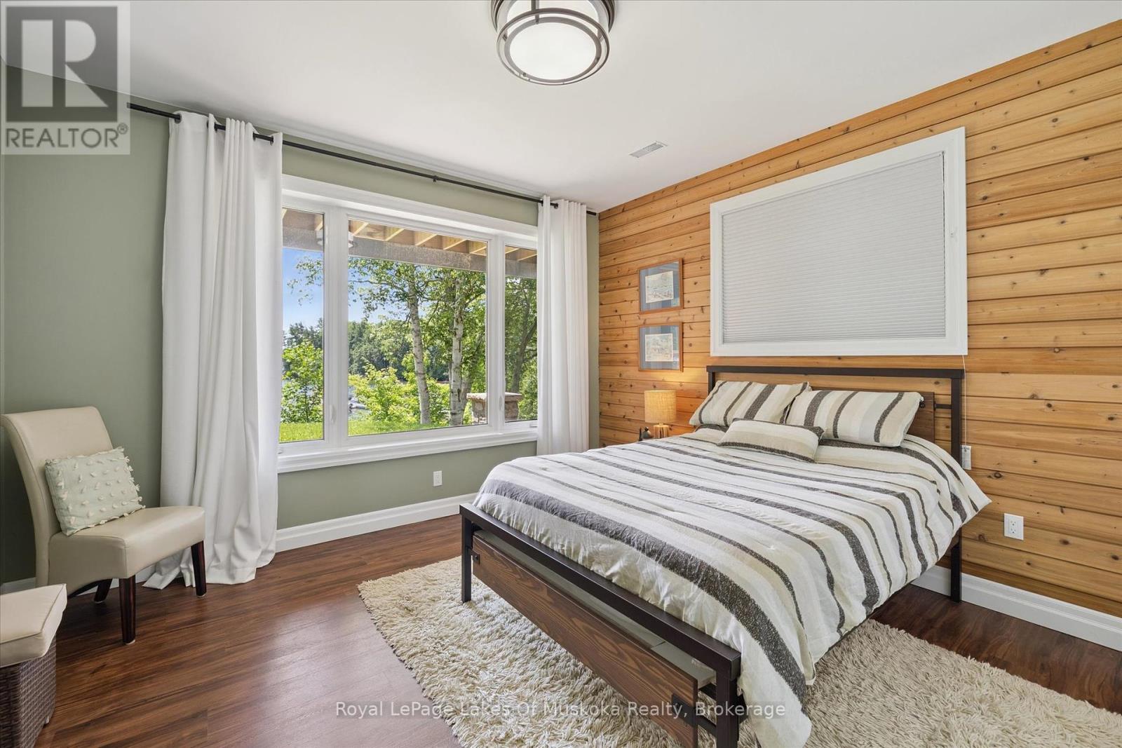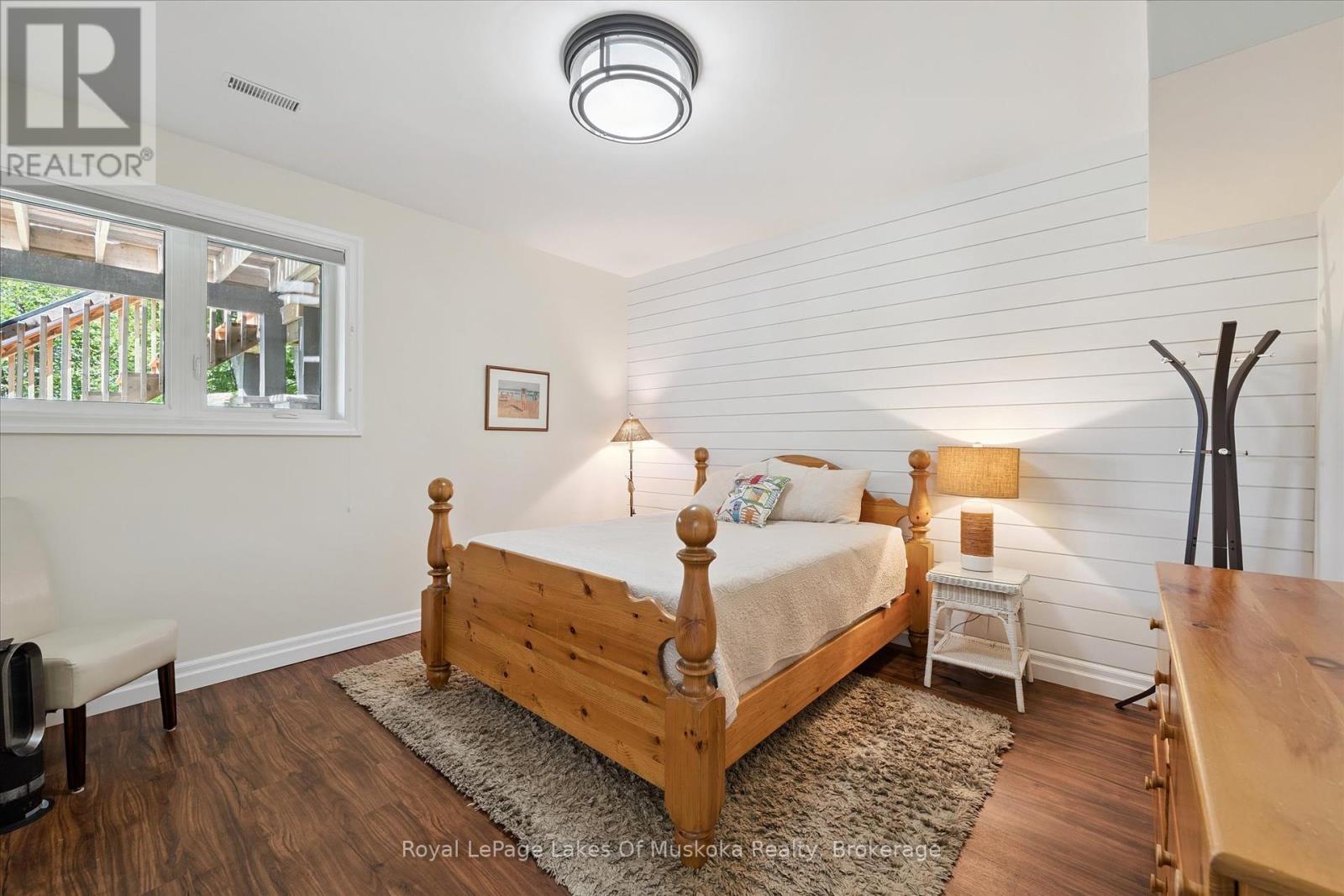No wonder this property was featured on the front cover of Muskoka Life Magazine as it is suitable for year round ultimate retirement, multi-generational and recreational living. This 5000+ sq ft, 2017-custom home is where contemporary meets traditional, fully furnished and turn key with 316 ft of lake frontage, deep enough to dive off the dock and shallow area for the little ones, all conveniently located just minutes to the town hub. Level parking and entrance. Once you open the 8-foot high front door, you will be drawn to the long southern views of Mary Lake.This home was personally designed by the current owner with ease of living and entertaining in mind, all conveniences on one level with 9 ft ceilings, 8 ft doors, soaring vaulted ceilings, engineered hardwood flooring throughout and a chefs worthy kitchen with an abundance of storage, the oversized island and open floor plan with a granite 2 sided propane fireplace and cozy sitting room off the grand room and main floor laundry rm. The private Master wing with large walk-in closet and spa worthy ensuite with heated Italian ceramic flooring, additional 2nd main floor bedroom all on one level.The lower level, completed with 4 additional bedrooms, full bath, gym and fam room with easy walkout/entry from/to lakeside fun. A very well-thought-through design on all floors. Fibre Optic and let's not forget the large deck with tempered glass railings. 4-car garage (1236 sq) with separate entrances for 4 snowmobiles & slanted floors for drainage. At the west side of the property, the boathouse & boat lift. Adjacent to low key family run marina for gas. There is not one corner of this home or outbuilding that is not designed well for lavish Lakefront living on Mary Lake with access to 40 miles of boating. Enough said, come see yourself as this property is ready for your showing, where you will fall in love and just need to pack your toothbrush/personals. Are you ready to make new memories at your new Muskoka address? (id:56991)