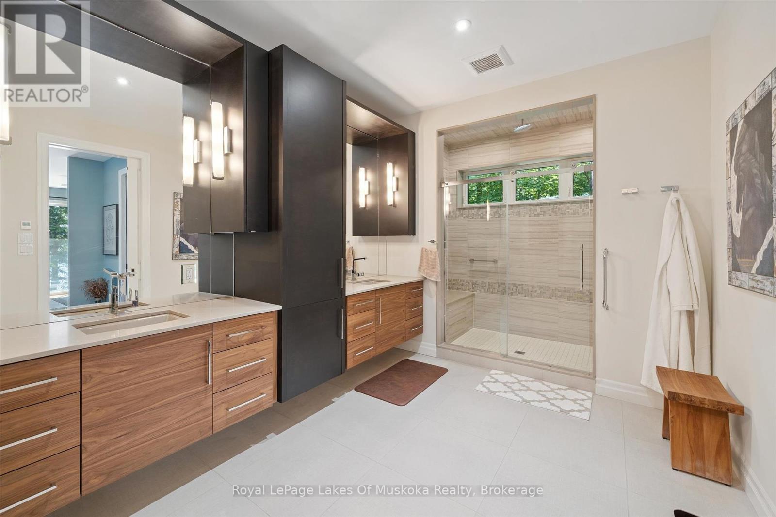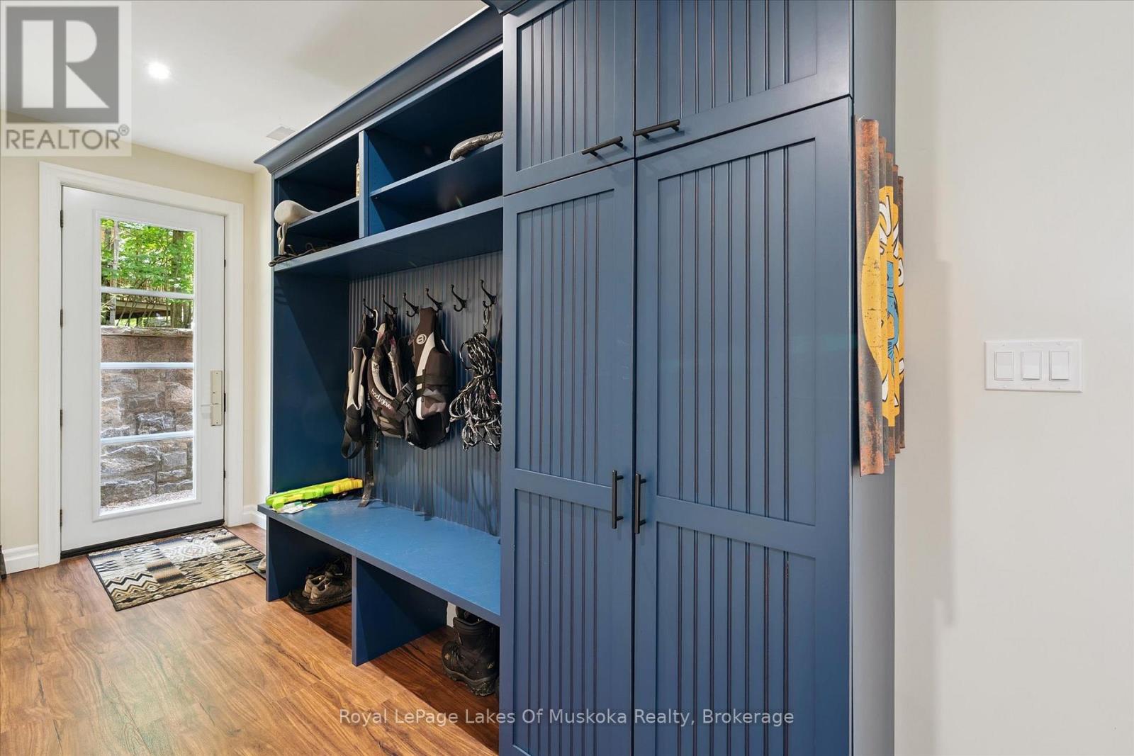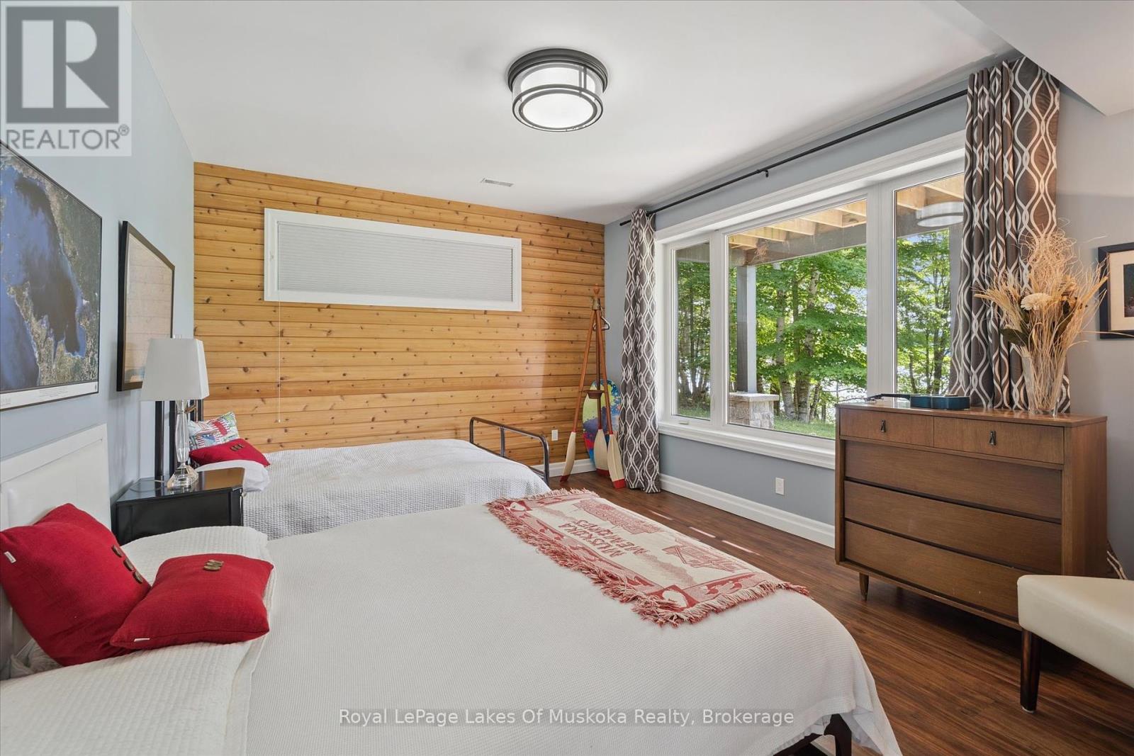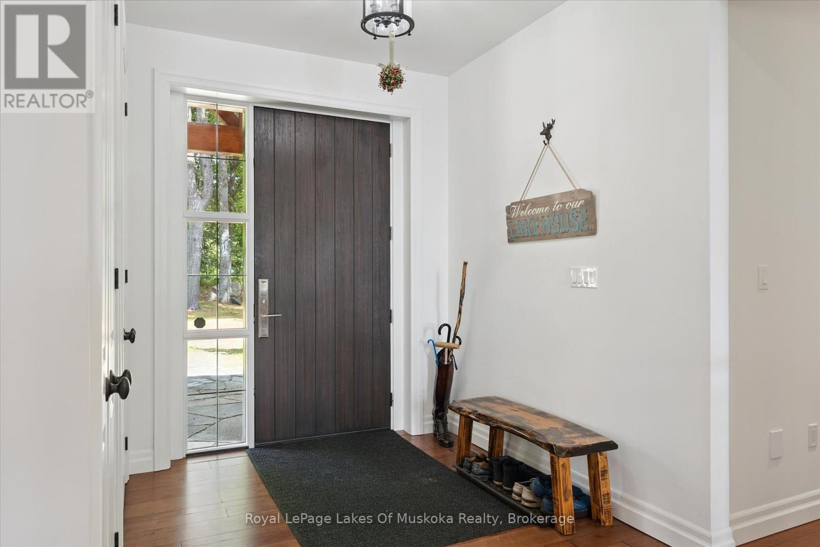 No wonder this property was featured on the front cover of Muskoka Life Magazine as it is suitable for year round ultimate retirement, multi-generational and recreational living. This 5000+ sq ft, 2017-custom home is where contemporary meets traditional, fully furnished and turn key with 316 ft of lake frontage, deep enough to dive off the dock and shallow area for the little ones, all conveniently located just minutes to the town hub. Level parking and entrance. Once you open the 8-foot high front door, you will be drawn to the long southern views of Mary Lake.This home was personally designed by the current owner with ease of living and entertaining in mind, all conveniences on one level with 9 ft ceilings, 8 ft doors, soaring vaulted ceilings, engineered hardwood flooring throughout and a chefs worthy kitchen with an abundance of storage, the oversized island and open floor plan with a granite 2 sided propane fireplace and cozy sitting room off the grand room and main floor laundry rm. The private Master wing with large walk-in closet and spa worthy ensuite with heated Italian ceramic flooring, additional 2nd main floor bedroom all on one level.The lower level, completed with 4 additional bedrooms, full bath, gym and fam room with easy walkout/entry from/to lakeside fun. A very well-thought-through design on all floors. Fibre Optic and let's not forget the large deck with tempered glass railings. 4-car garage (1236 sq) with separate entrances for 4 snowmobiles & slanted floors for drainage. At the west side of the property, the boathouse & boat lift. Adjacent to low key family run marina for gas. There is not one corner of this home or outbuilding that is not designed well for lavish Lakefront living on Mary Lake with access to 40 miles of boating. Enough said, come see yourself as this property is ready for your showing, where you will fall in love and just need to pack your toothbrush/personals. Are you ready to make new memories at your new Muskoka address? (id:56991)