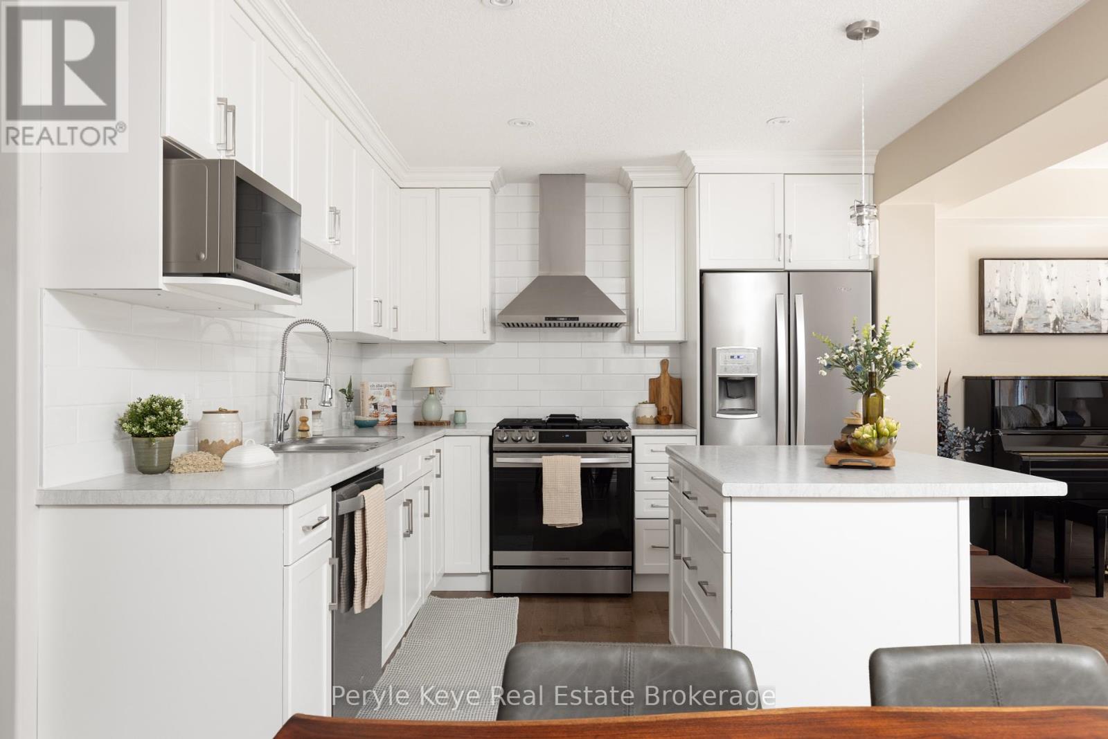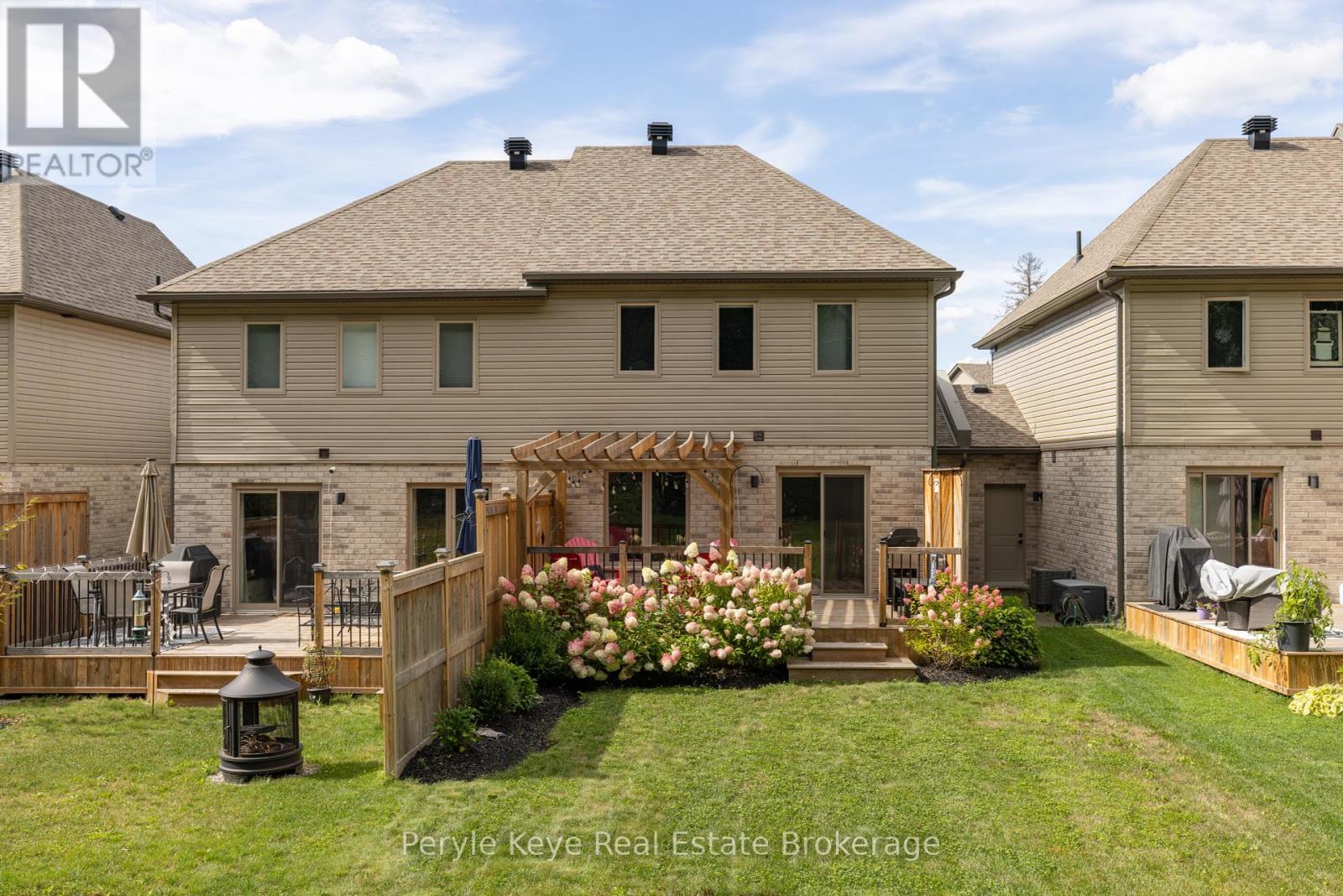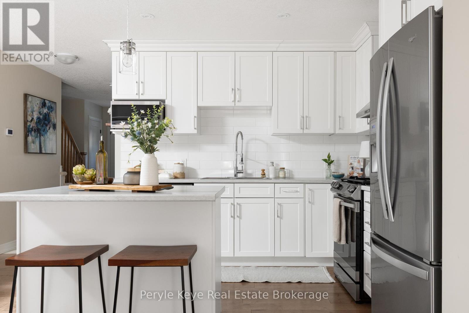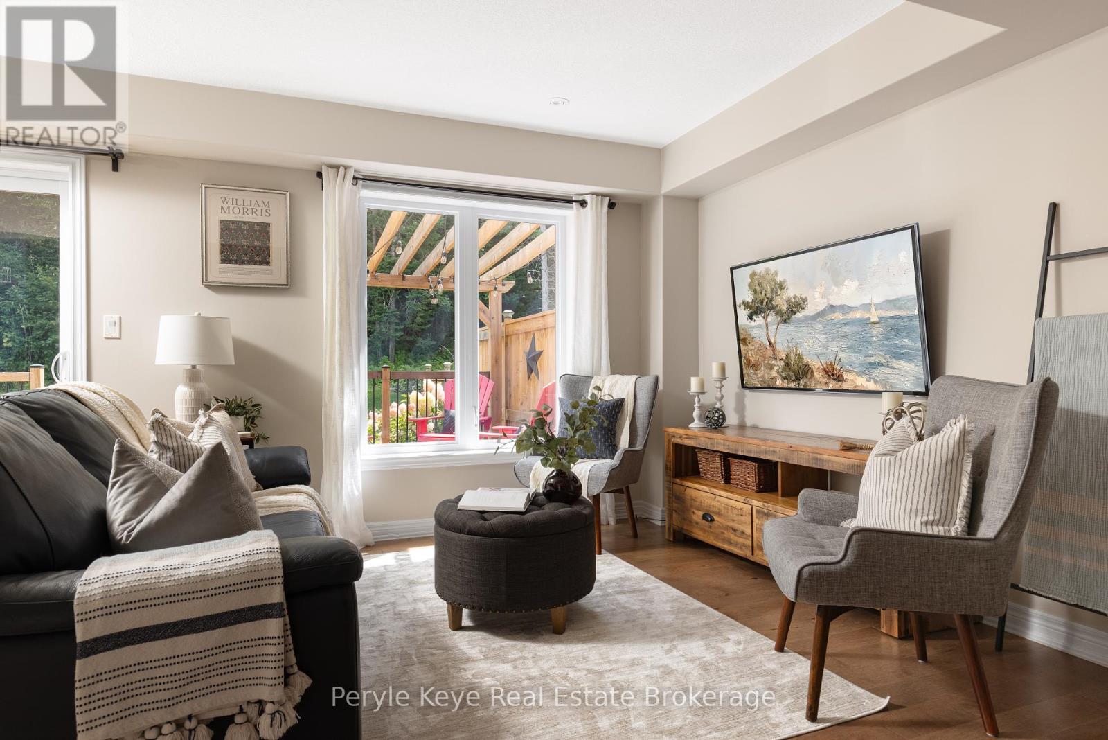 Nestled in the desirable Brookside Crossing community, this beautifully appointed 3-bedroom, 2.5-bath freehold townhome gives you full municipal services and low-maintenance living, all while backing onto a wooded ridge offering privacy and calm. It's the kind of place where you can exhale, knowing you've found the right balance between convenience and nature. Step inside and feel the difference. Hardwood floors carry through the main spaces and upgraded lighting that sets just the right mood. The kitchen will surprise you with extended cabinetry, crown molding, stylish backsplash and an island with bar seating. Just steps away, the interior access from the garage makes coming home easy, rain or shine. Upstairs, the primary suite offers a private retreat with forested views and its own 3-piece ensuite and walk-in closet. Two additional guest bedrooms give you flexibility, whether it's space for kids, guests, or a cozy home office. Thoughtfully designed, a 4pc bath and space for laundry complete this second level. The full, unfinished basement, complete with a rough-in bath and large window, gives you room to grow and the opportunity to design a space that suits your lifestyle. And then there's the backyard - the heart of where memories are made. Imagine summer evenings on your 20' x 12' deck, fireflies flickering while you stargaze under the Muskoka sky. Privacy fencing gives you a quiet spot to relax, while the tree-covered ridge behind your yard provides a natural backdrop that feels miles away from town. There's room for a fire pit, lawn games or raised garden beds. All of this is just minutes to schools, shopping, trails and parks! It's close enough for convenience but far enough to feel tucked away. Serviced with natural gas, municipal water and sewer, and high speed internet, you're always connected. Pride of ownership is evident throughout. Don't miss this amazing opportunity to make this townhome the backdrop of your next chapter. (id:56991)